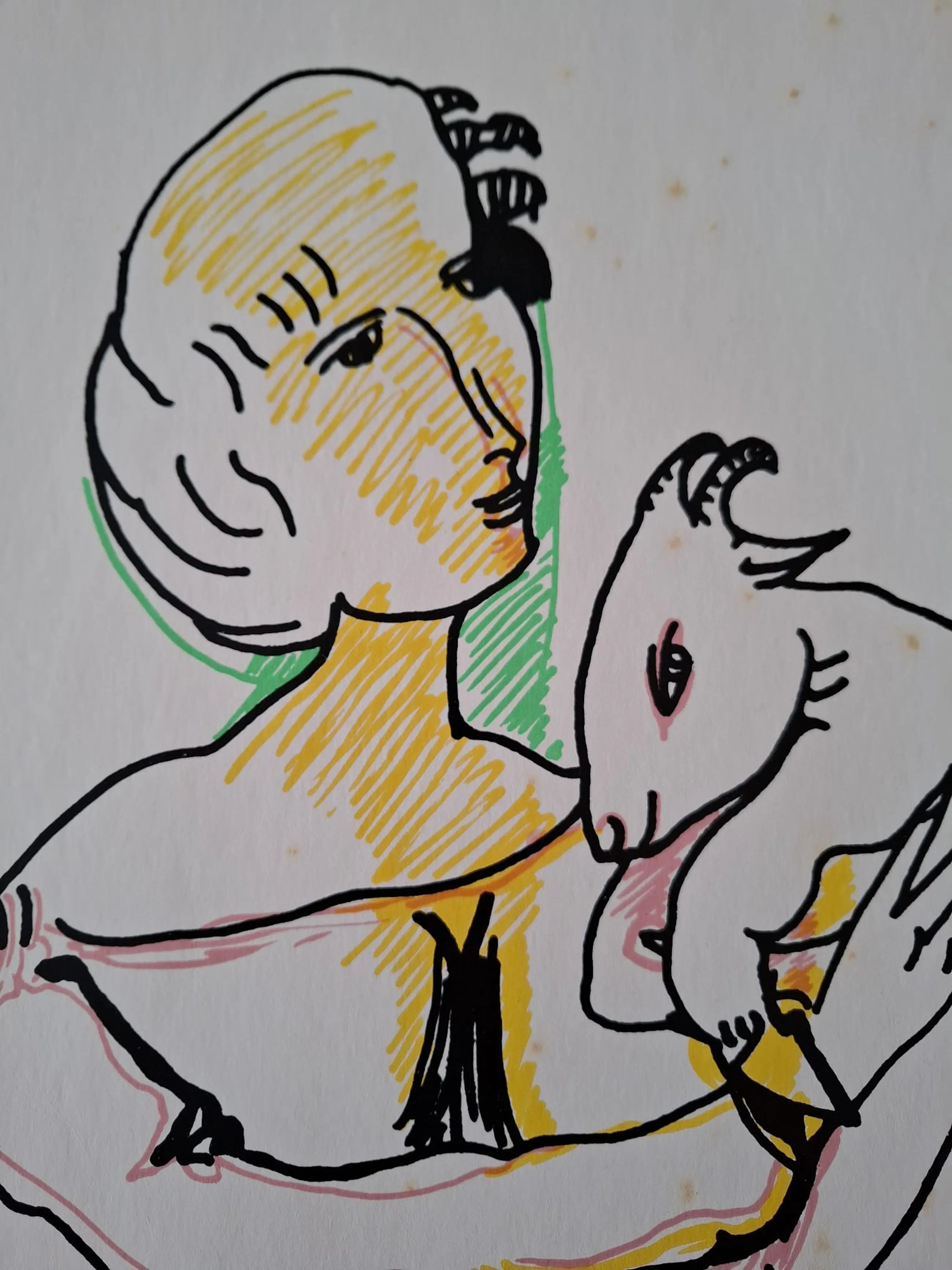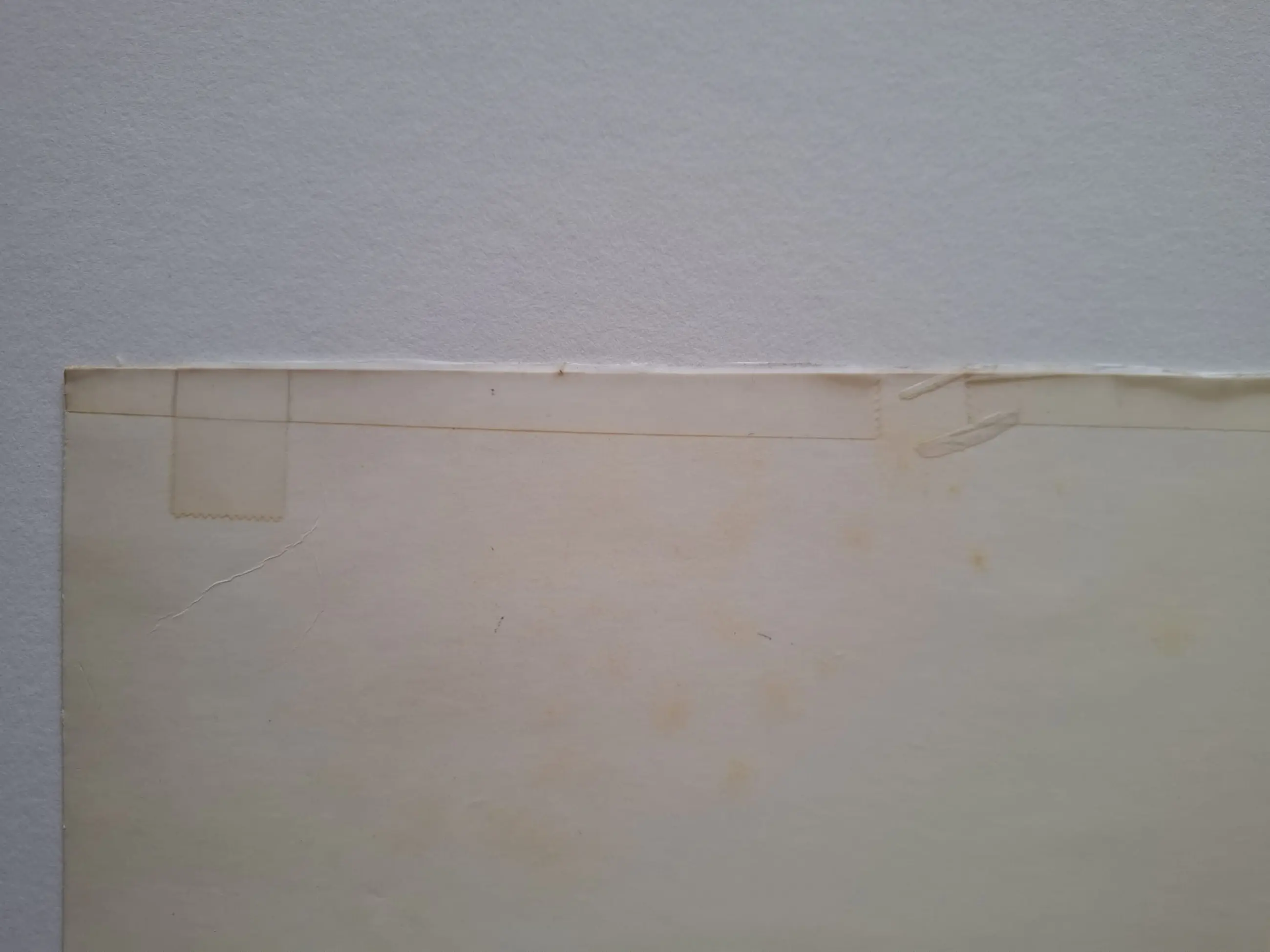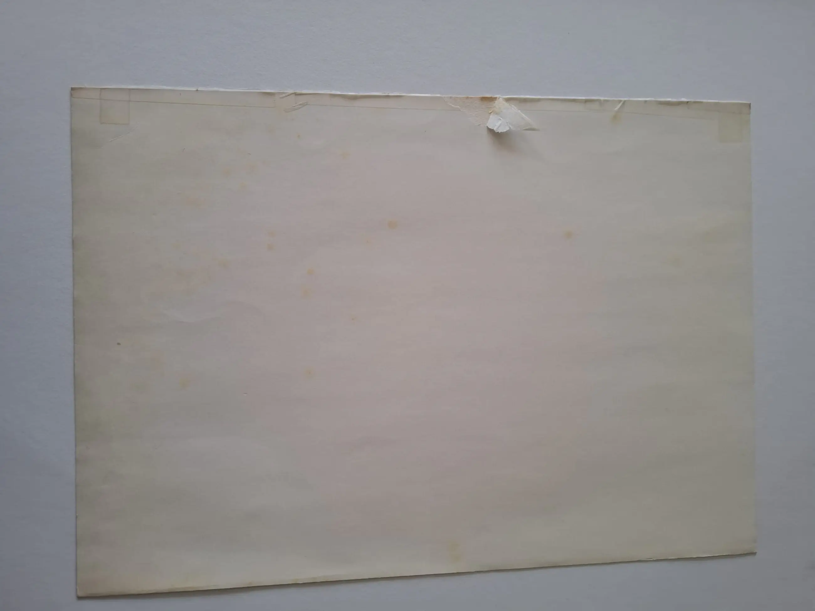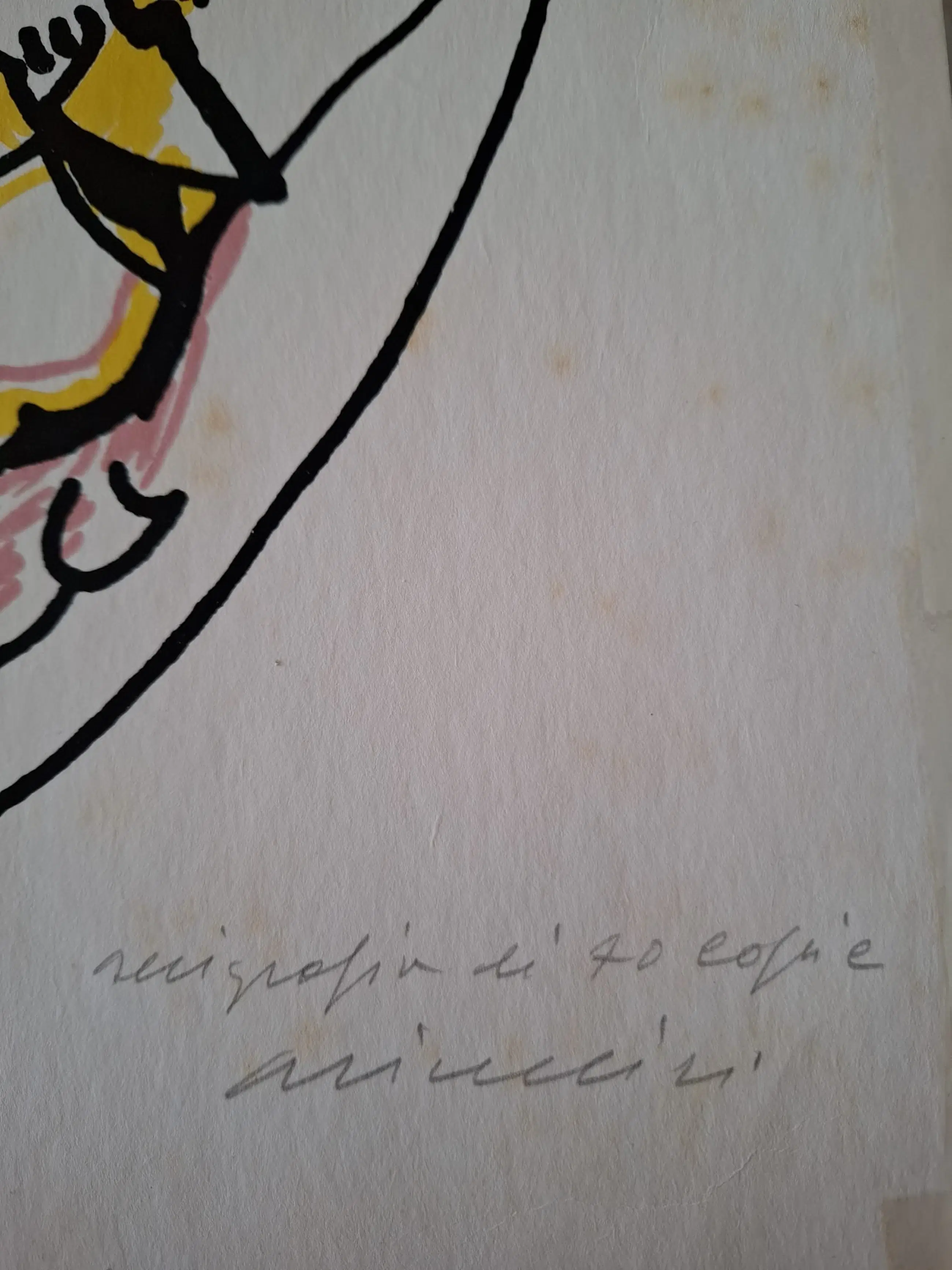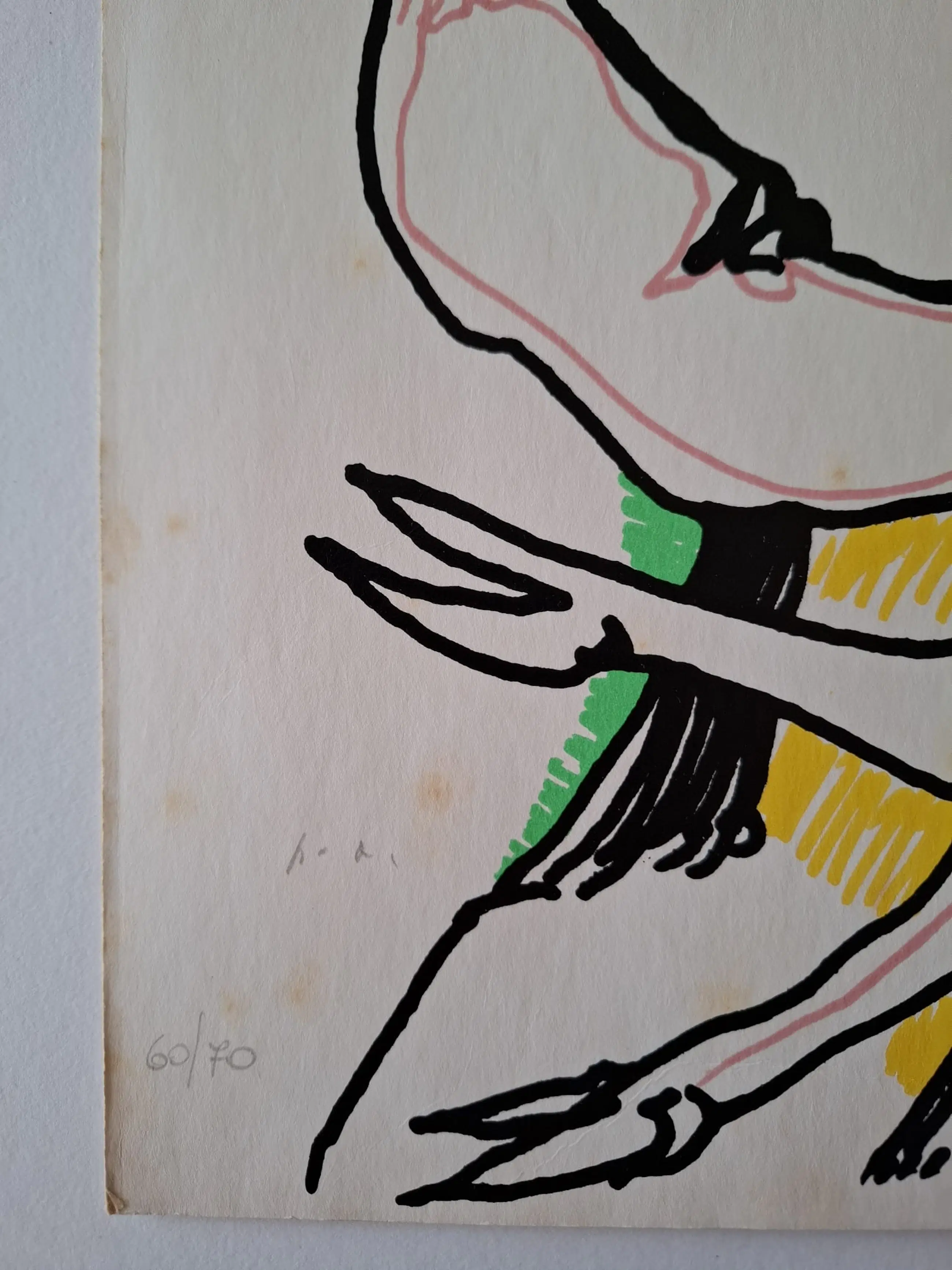 Het blad vertoont zichtbare ouderdomsvlekken en lichte verkleuring van het papier, passend bij de periode waarin het is gemaakt, wat de visuele impact van de compositie niet vermindert.