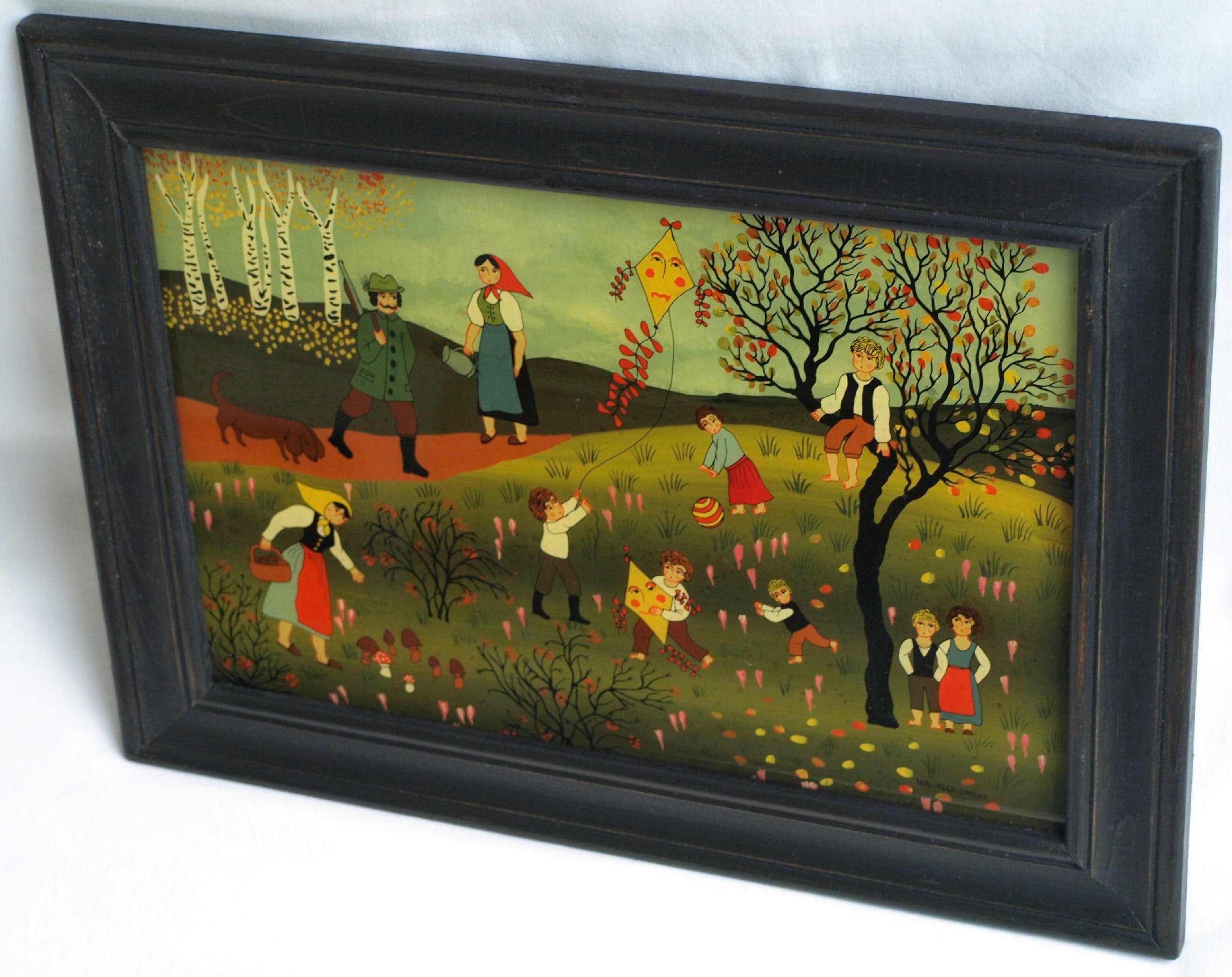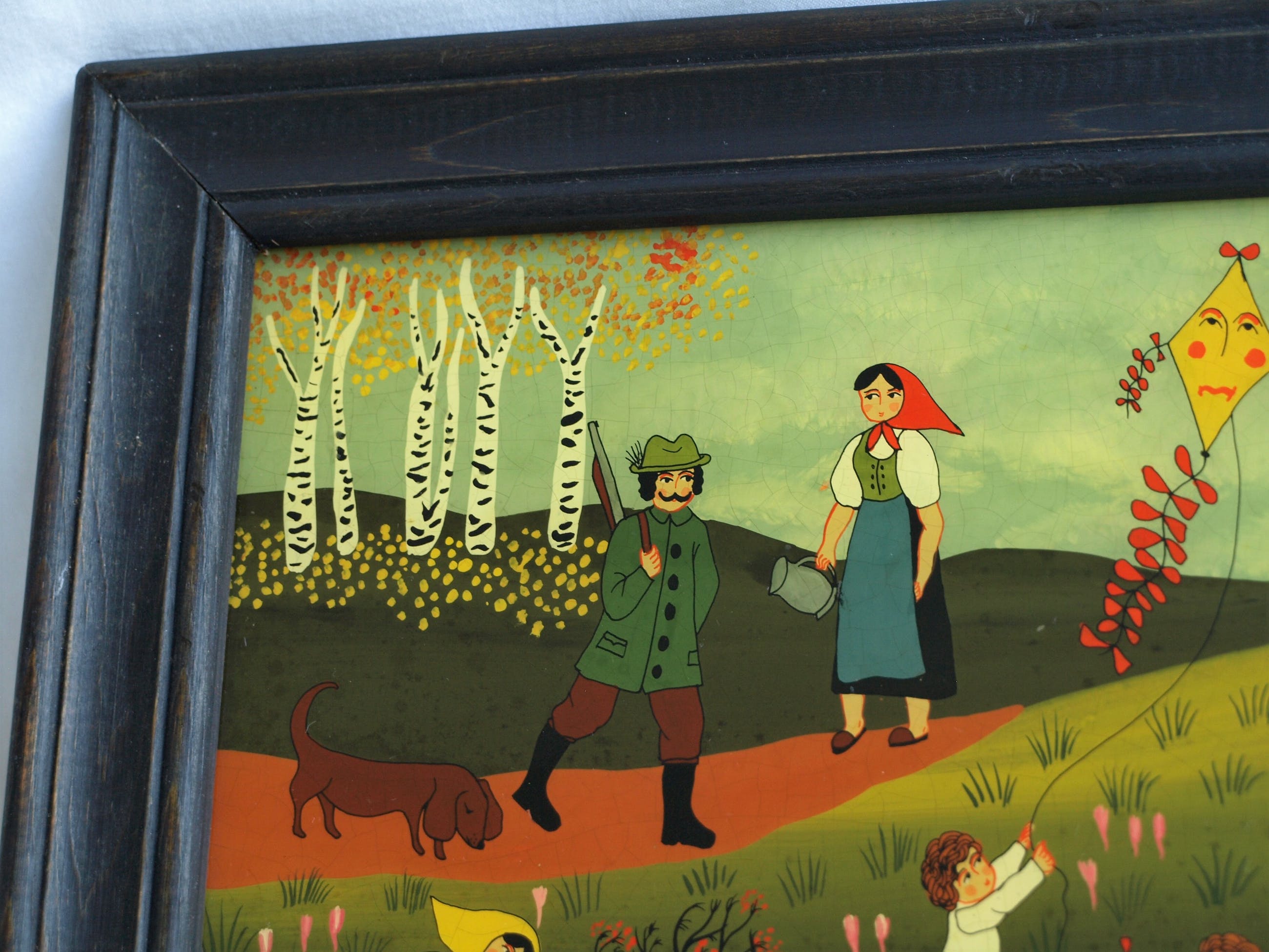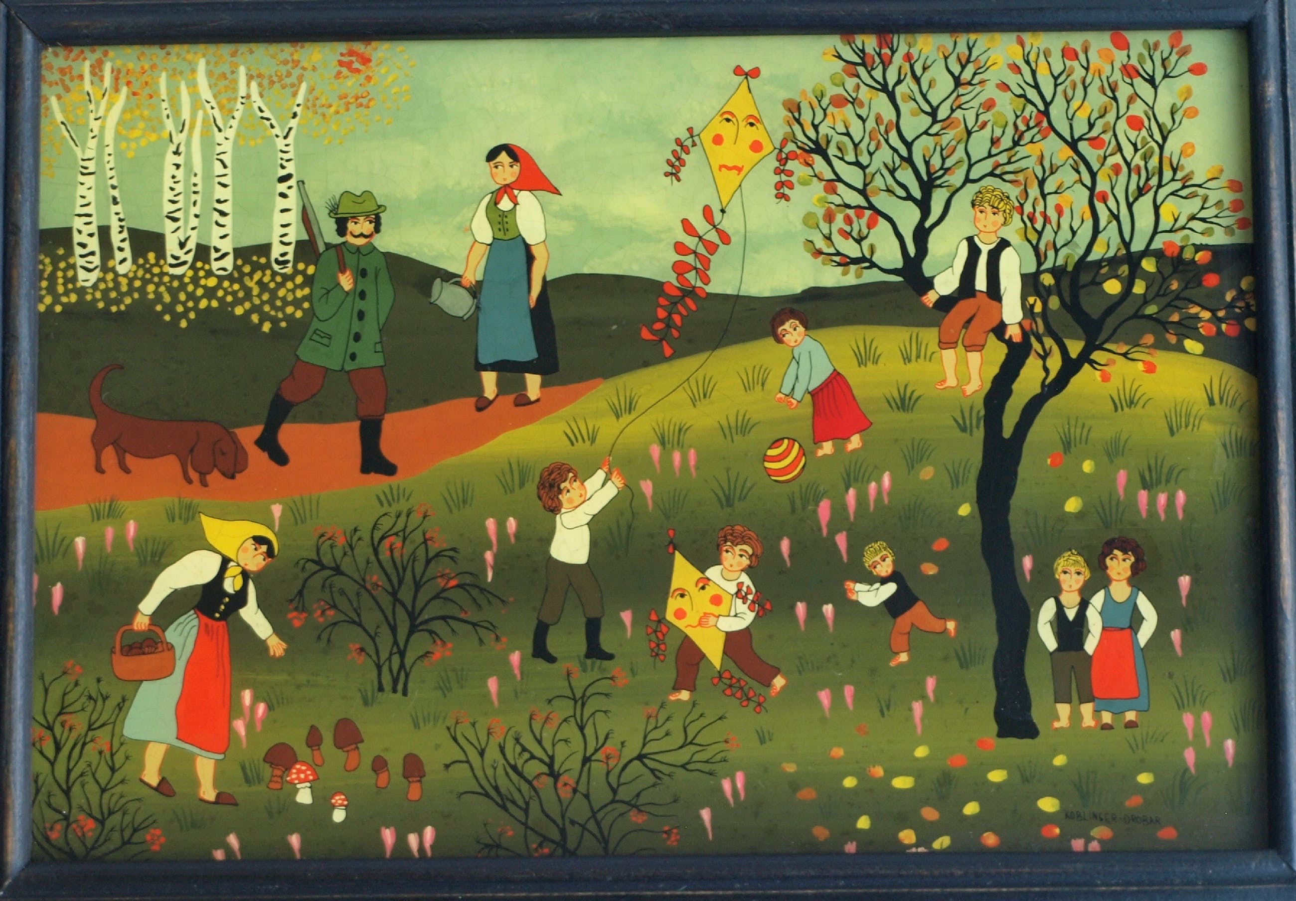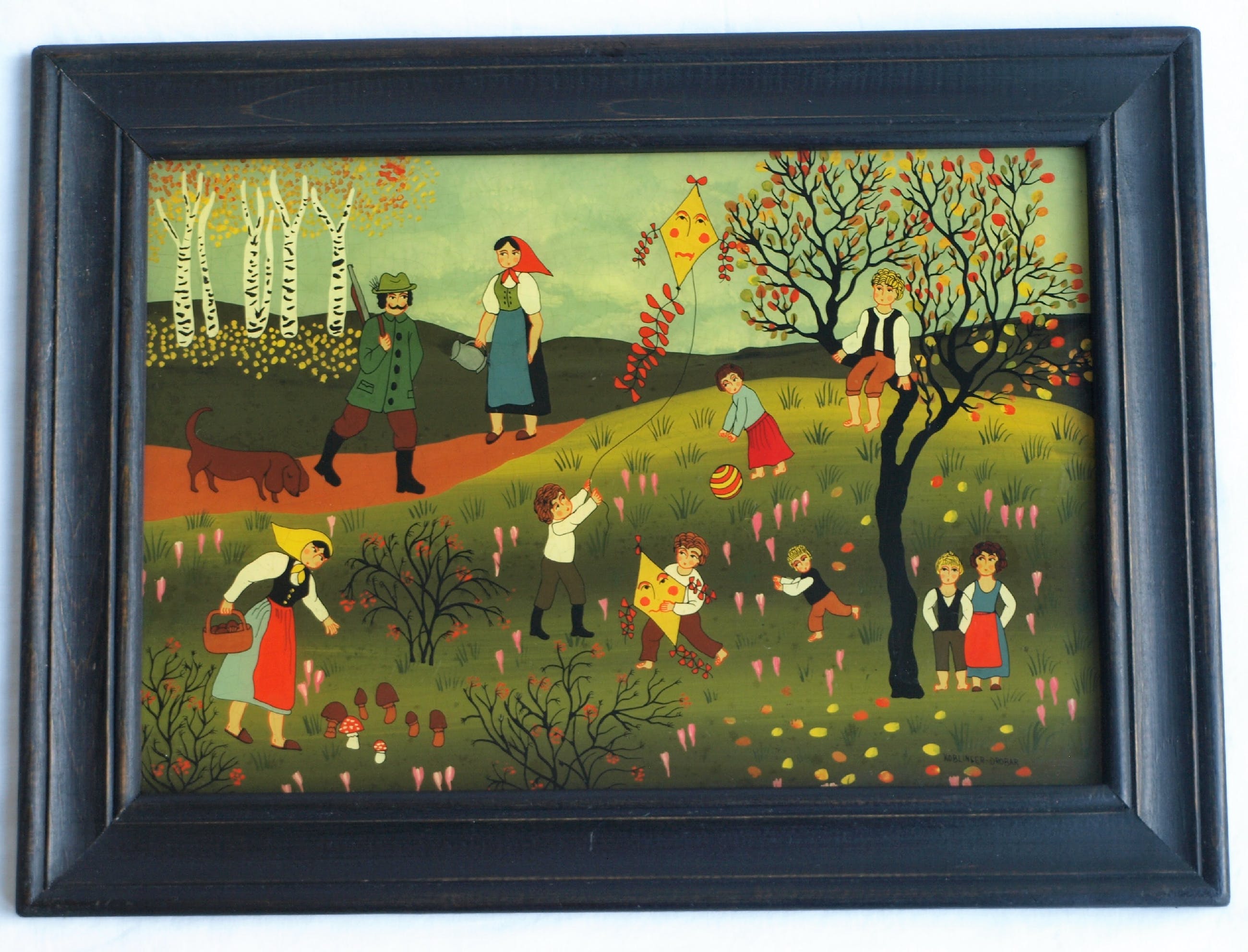 Een ingelijst naïef werk van de Oostenrijkse kunstenares Renate Koblinger-Drobar (1943).