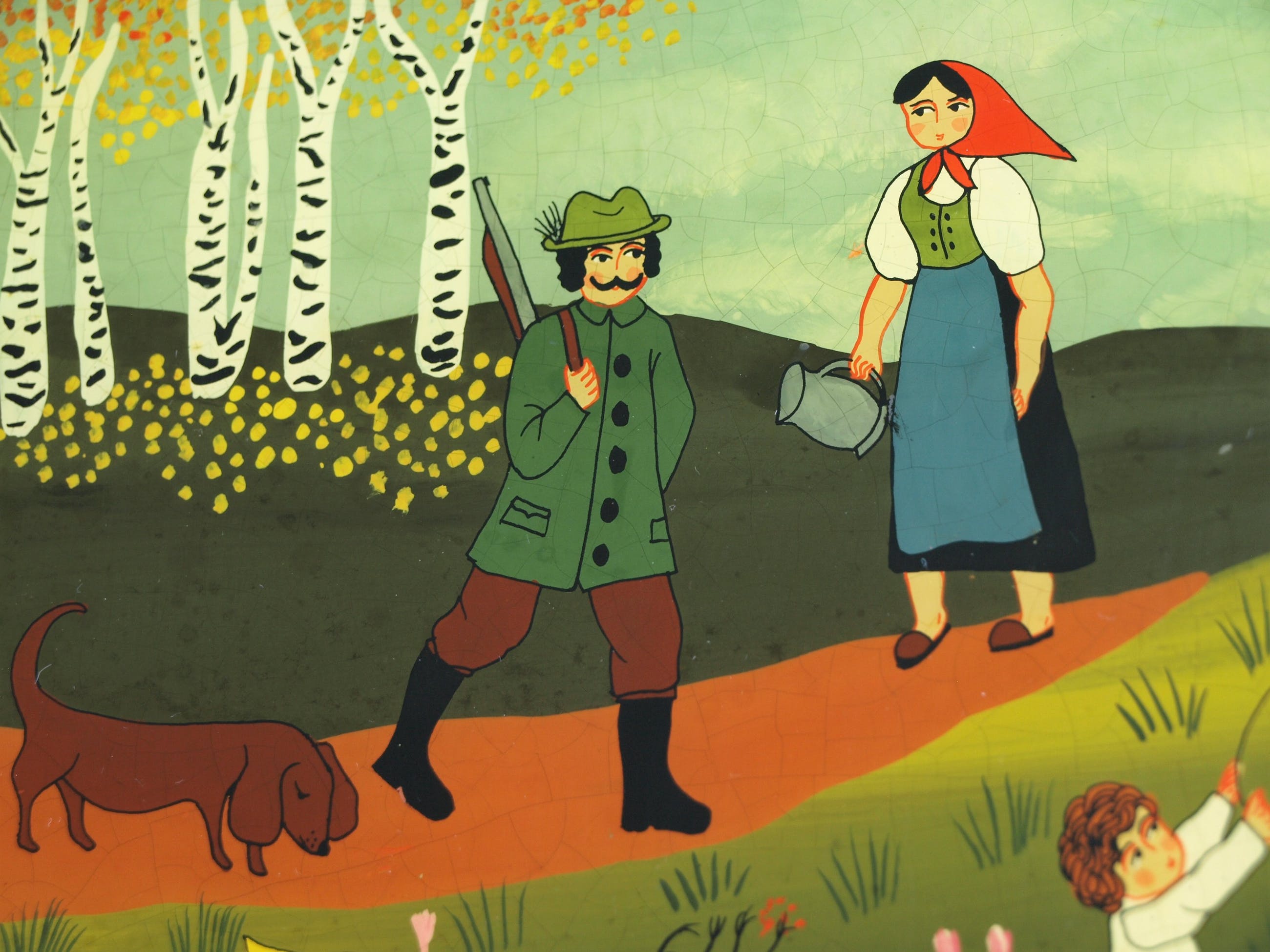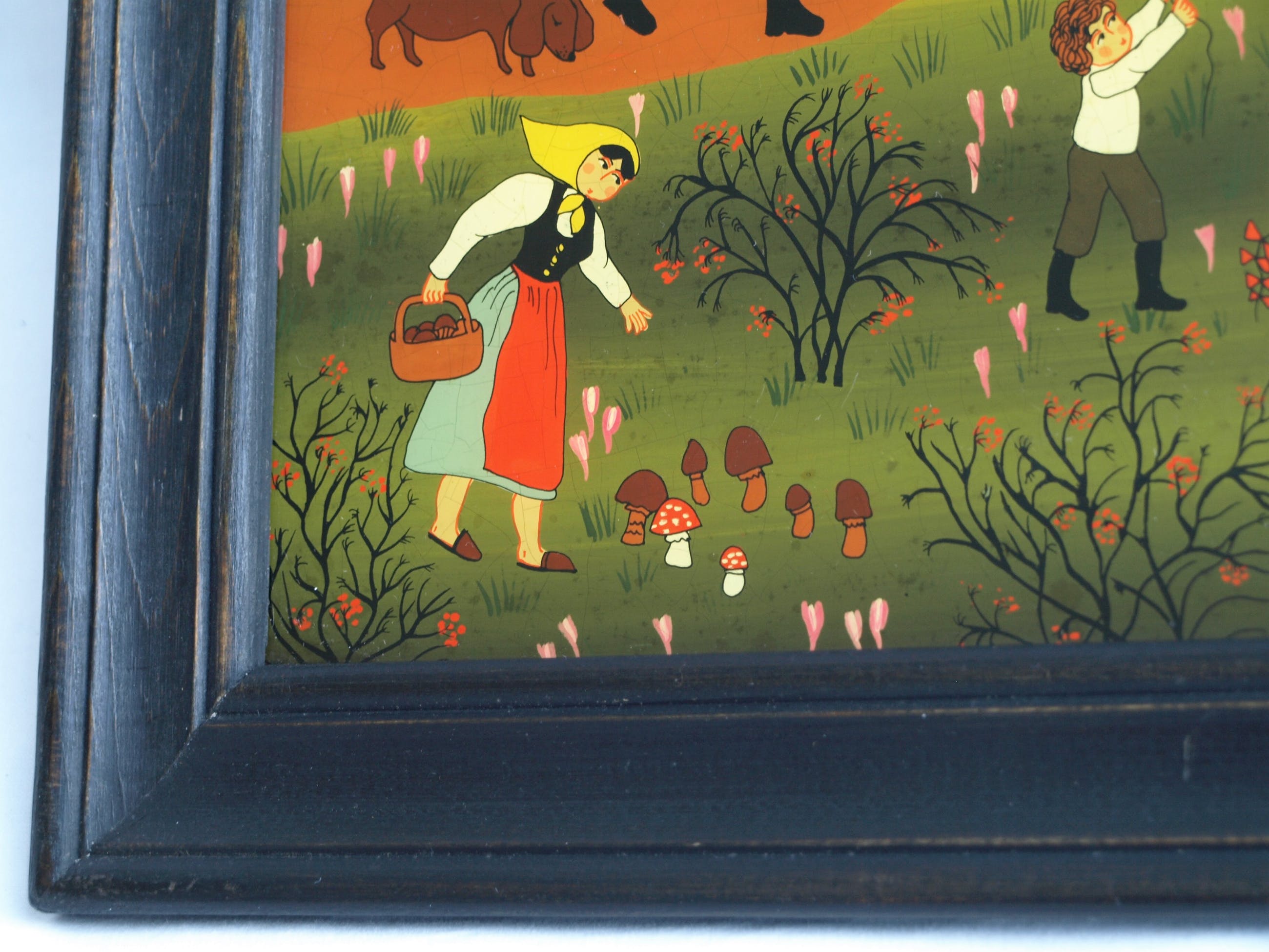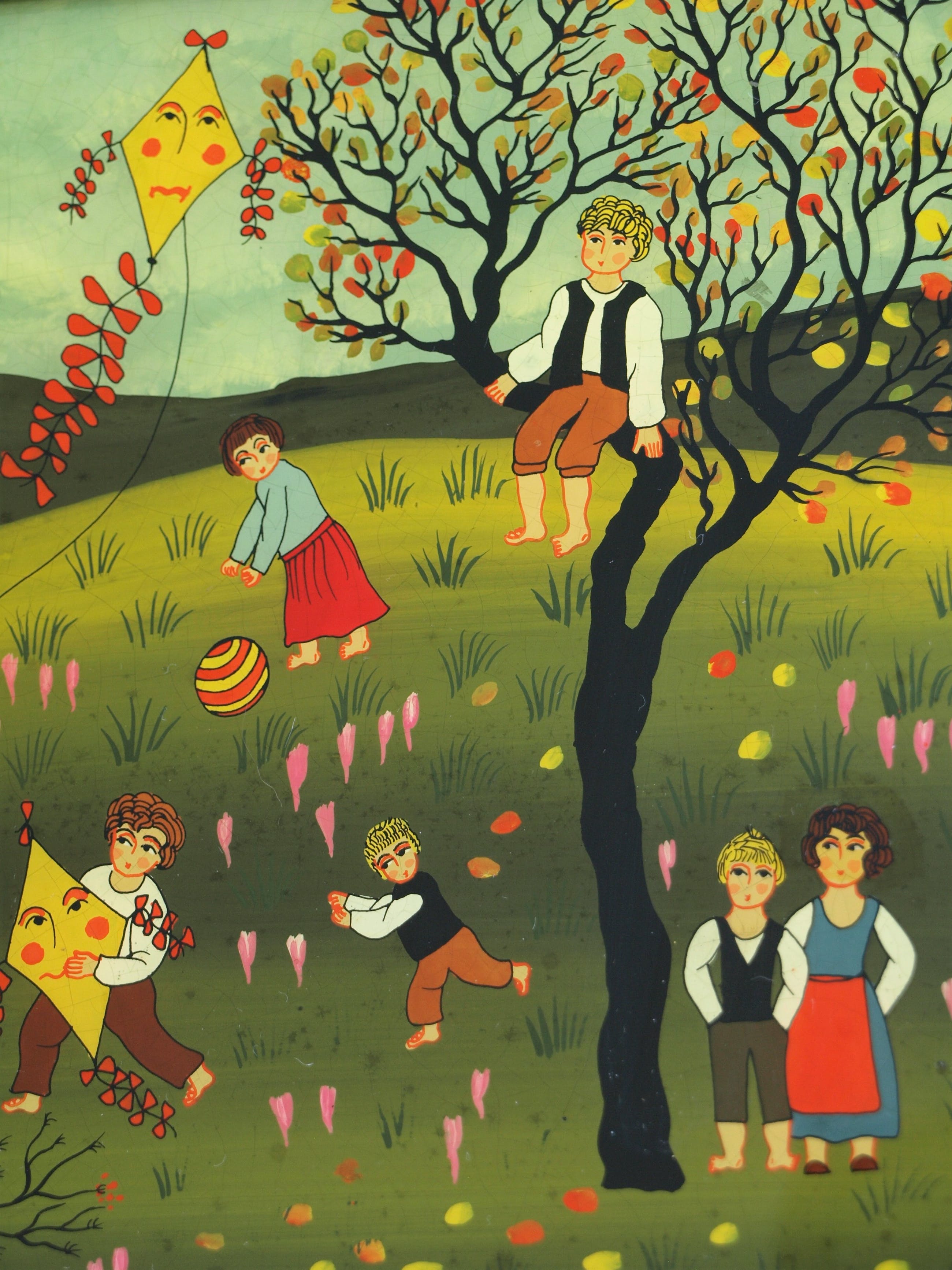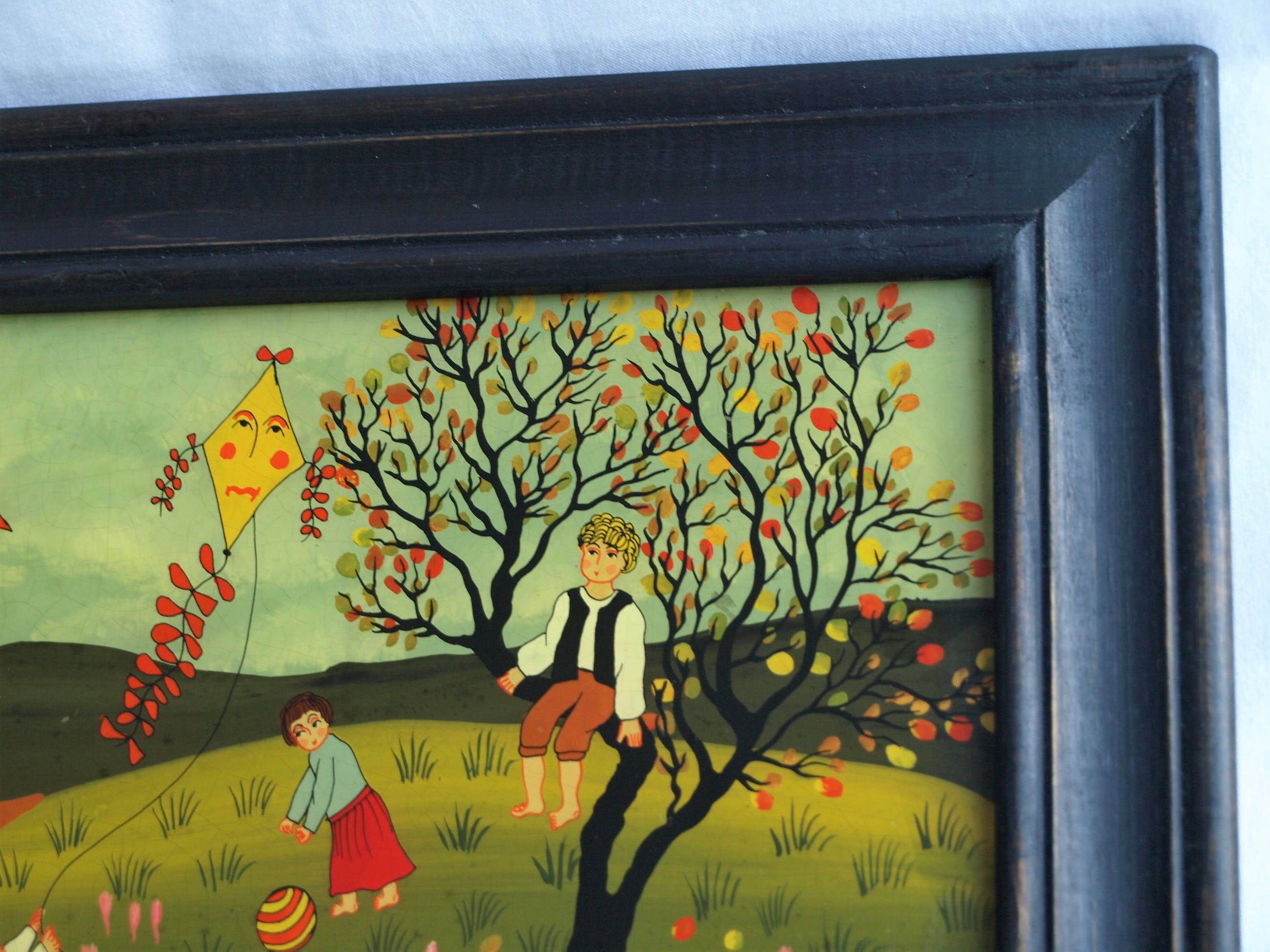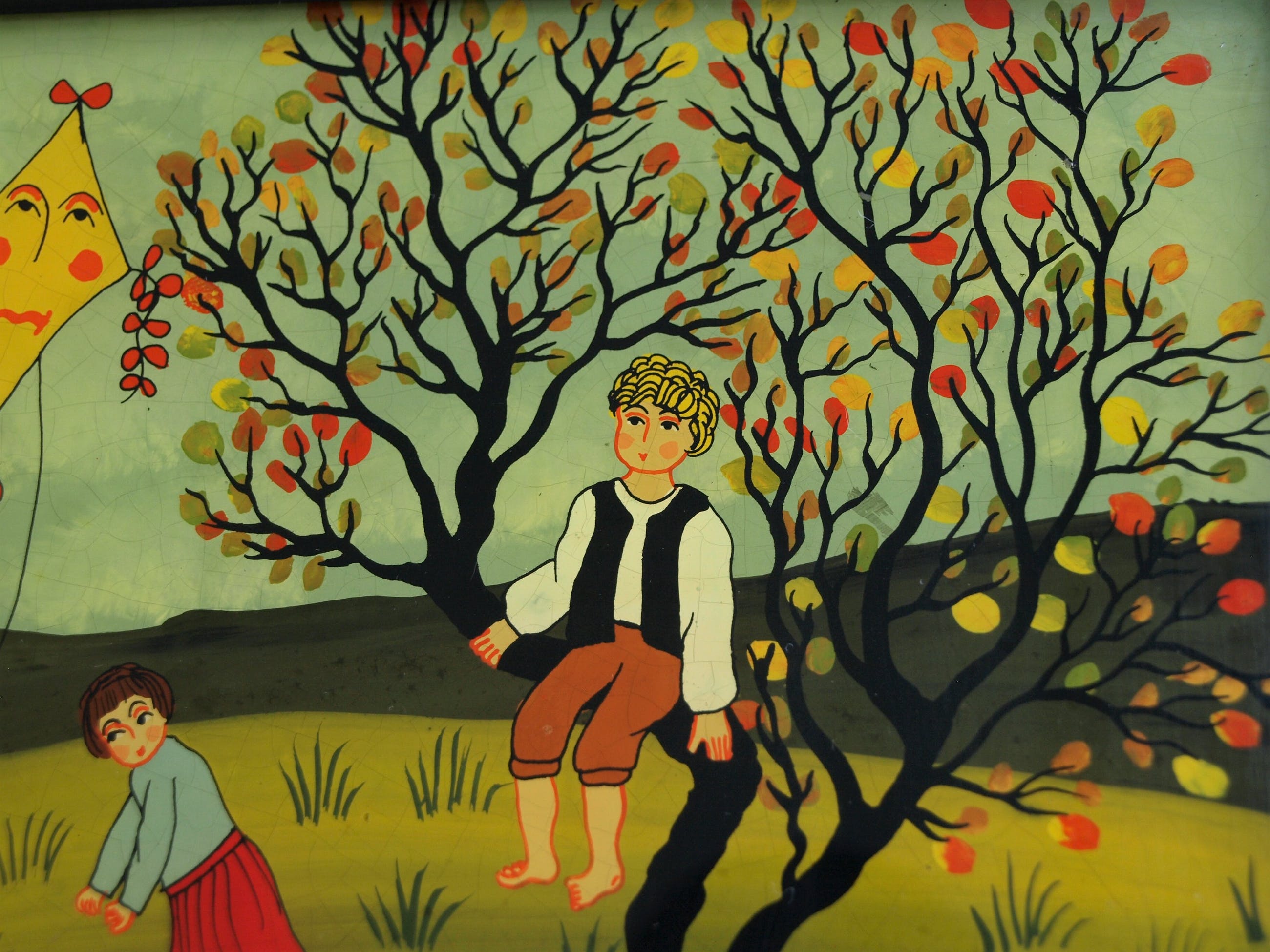 Een ingelijst naïef werk van de Oostenrijkse kunstenares Renate Koblinger-Drobar (1943).