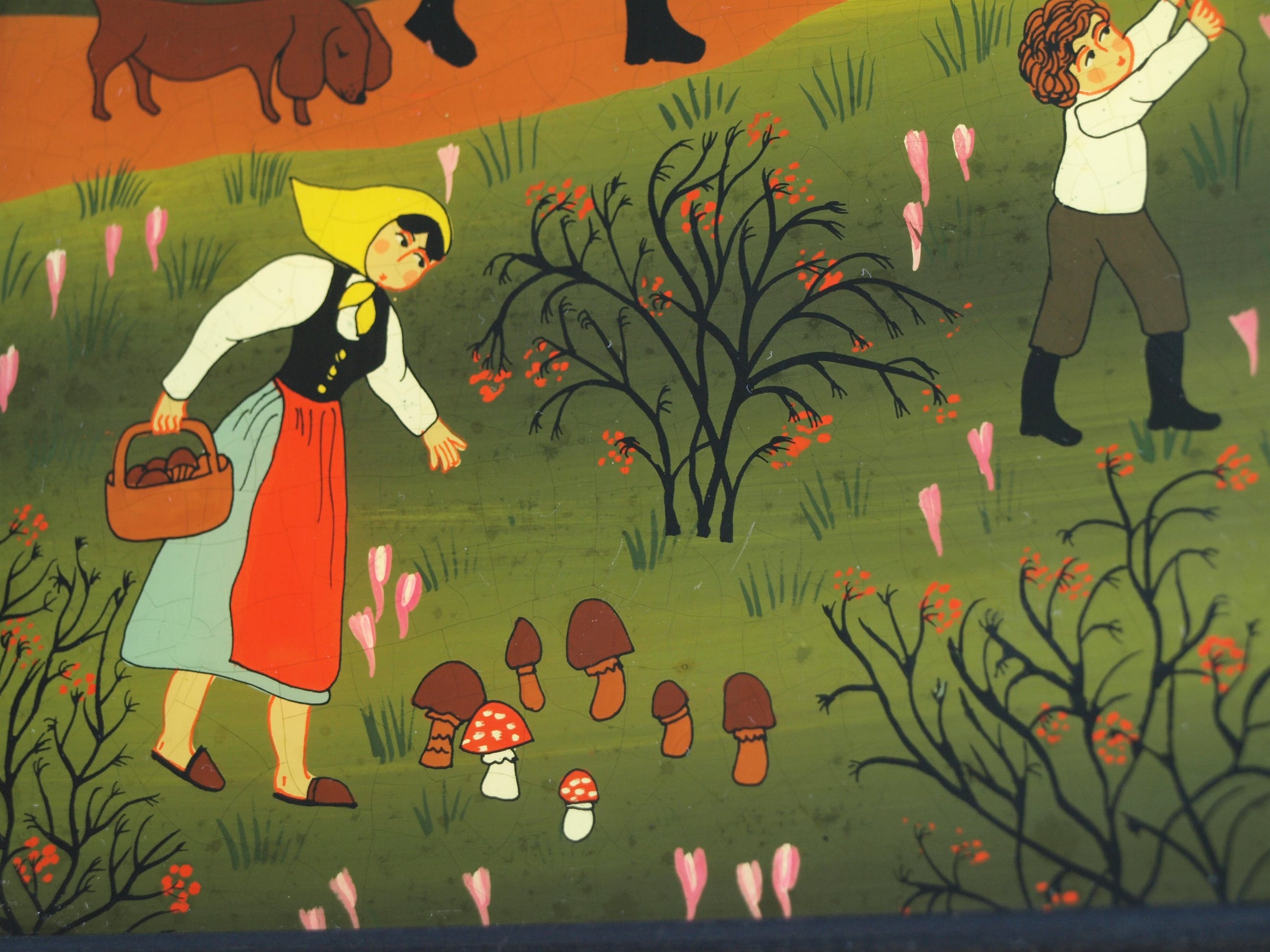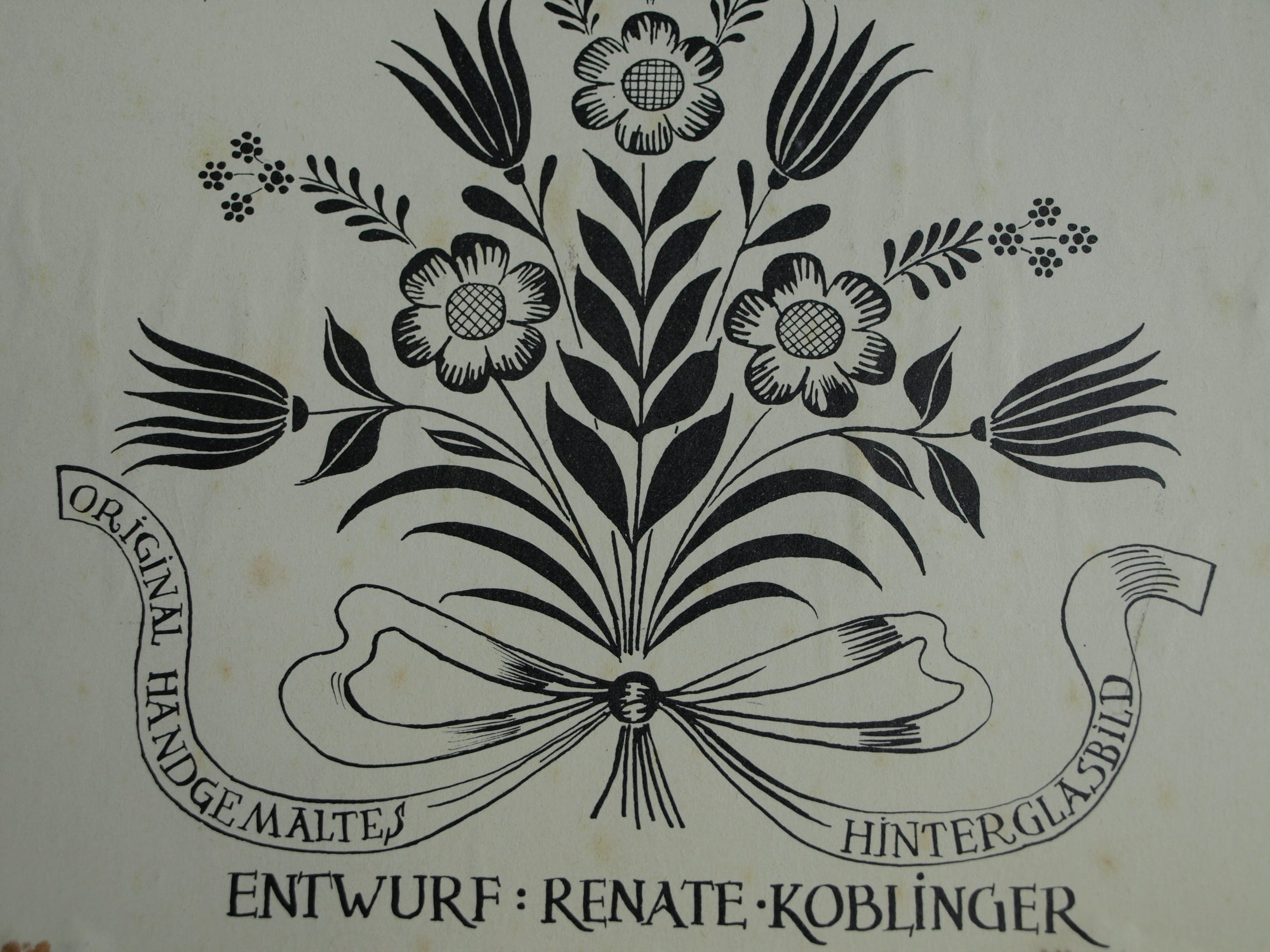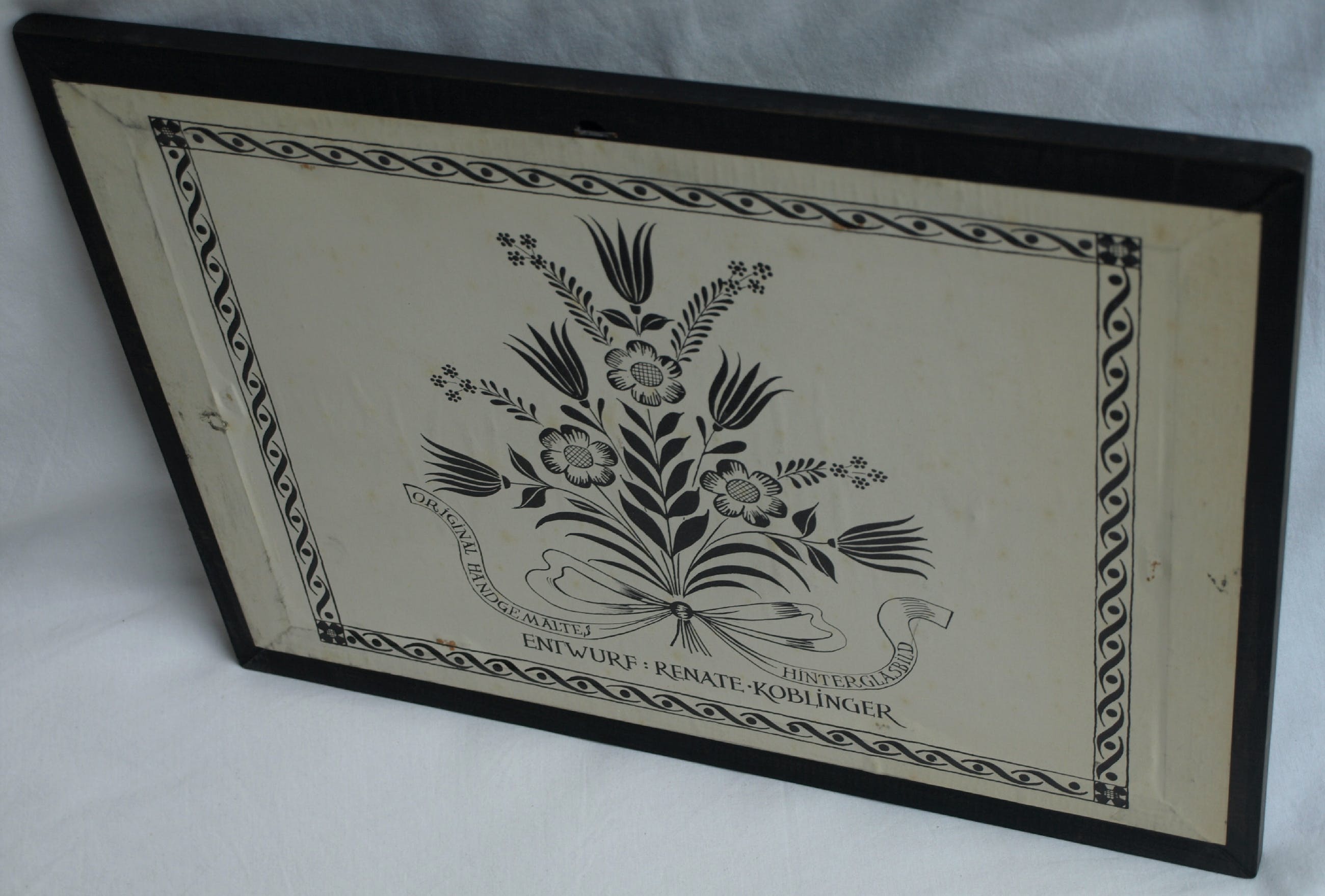 -Handgeschilderd op de achterkant van een glasplaat (“Hinterglasmalerei”, ‘Achterglasschildering’).