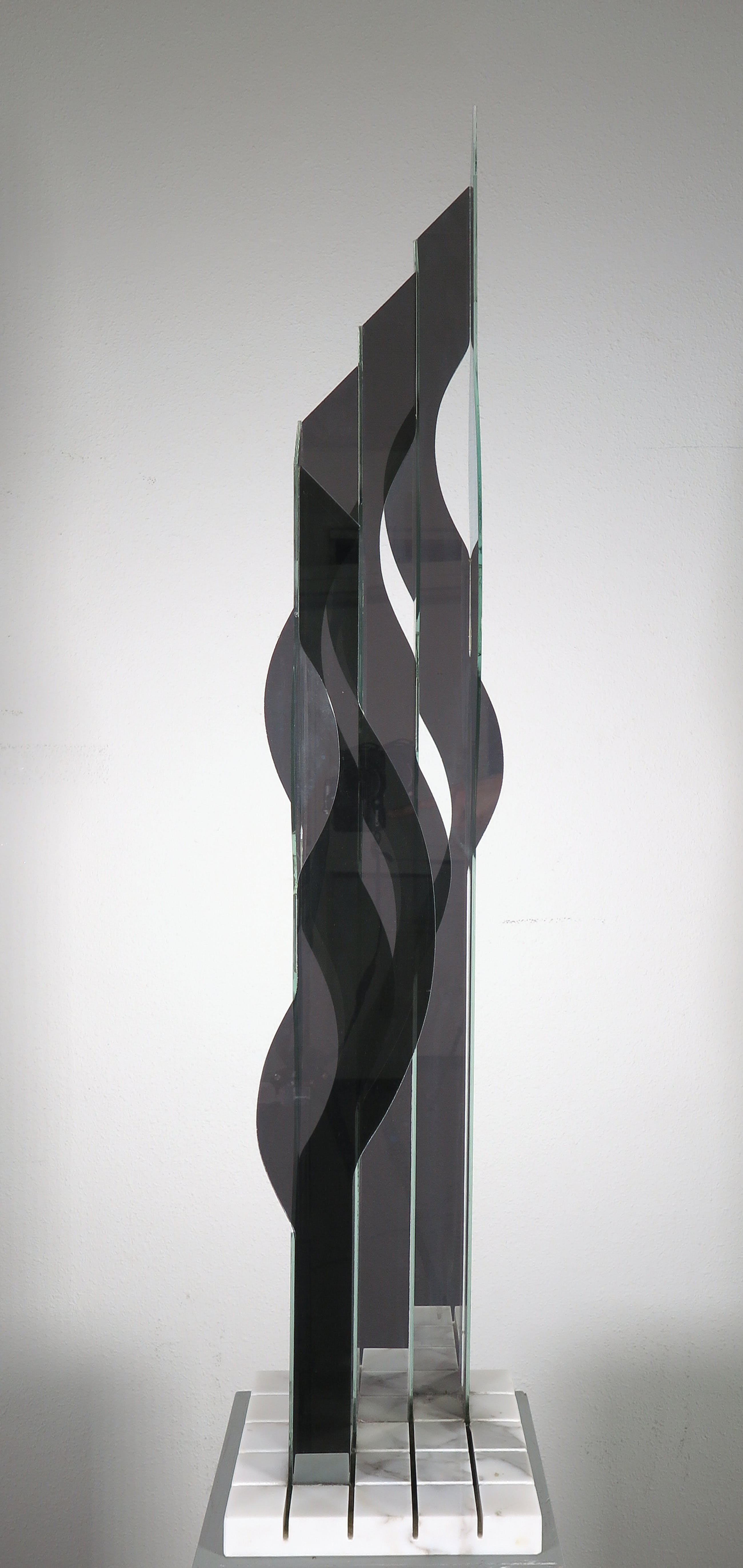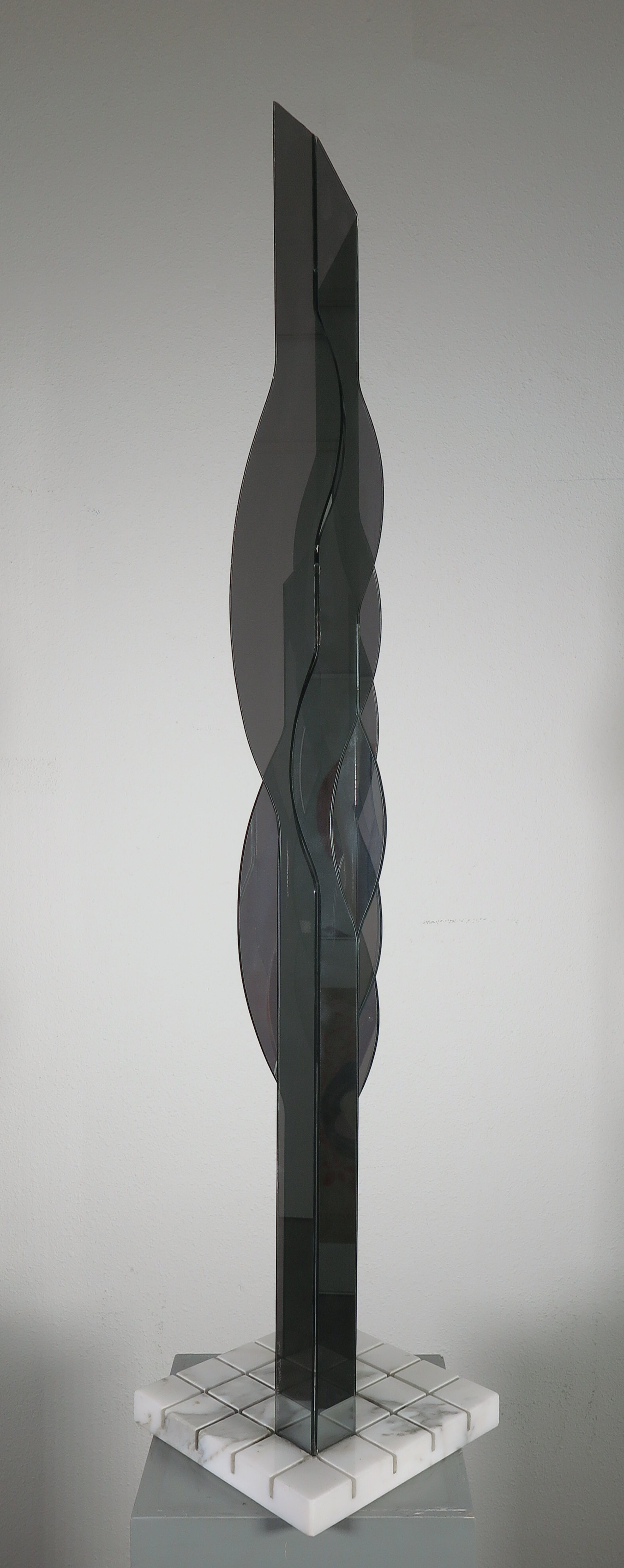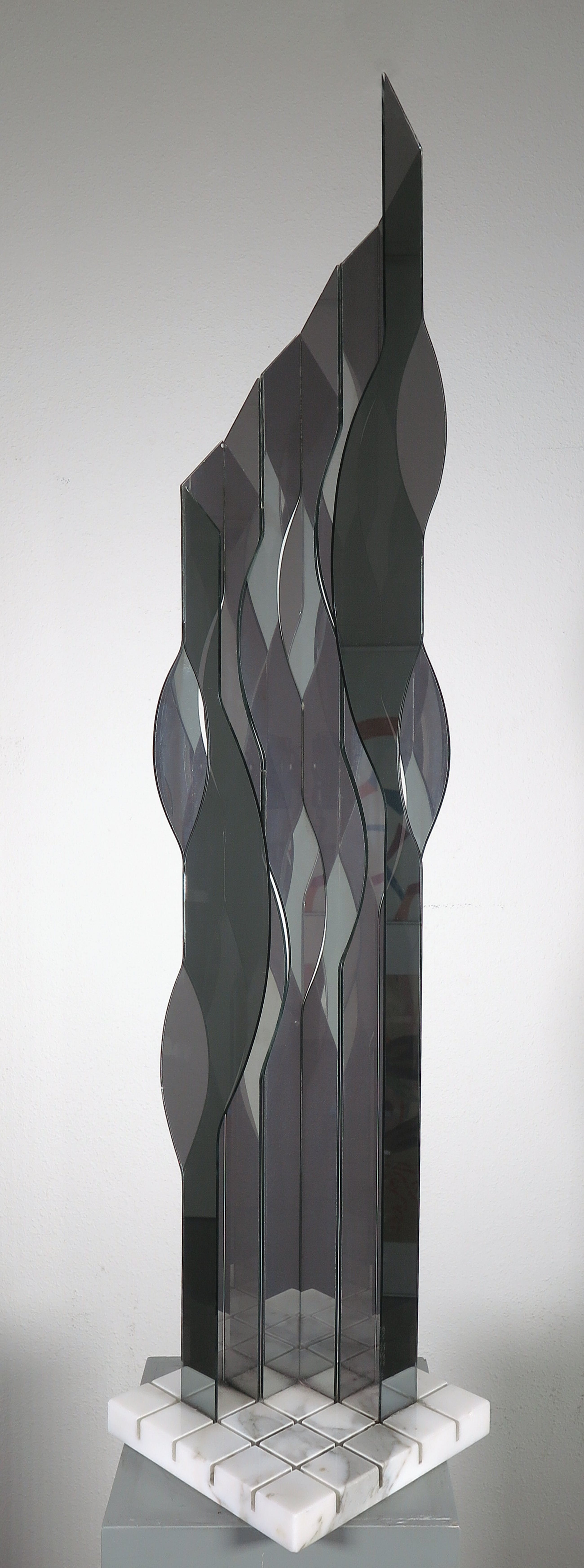 Groot object opgebouwd uit semi-doorzichtig gespiegeld glas, op een marmeren basement. Het werk is getiteld 'Modula III'.