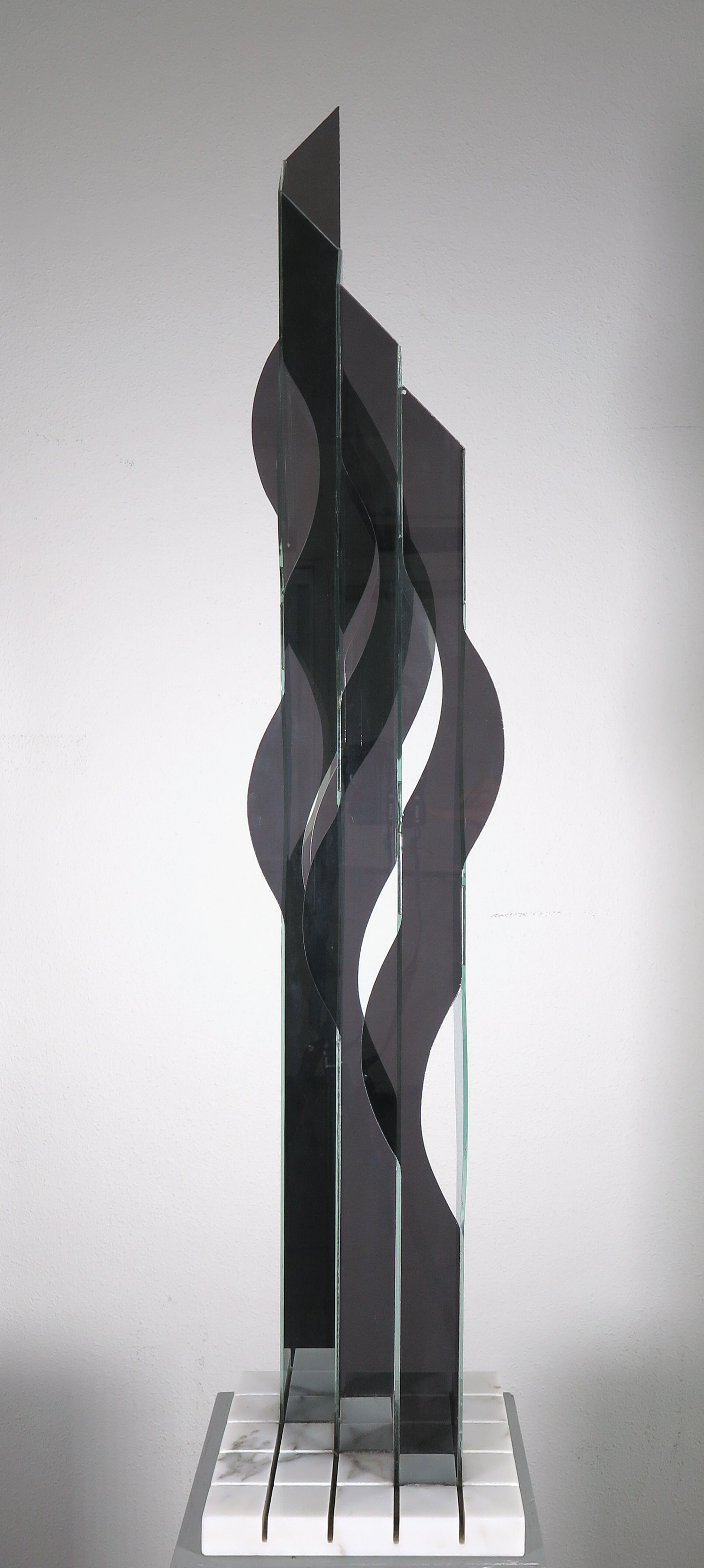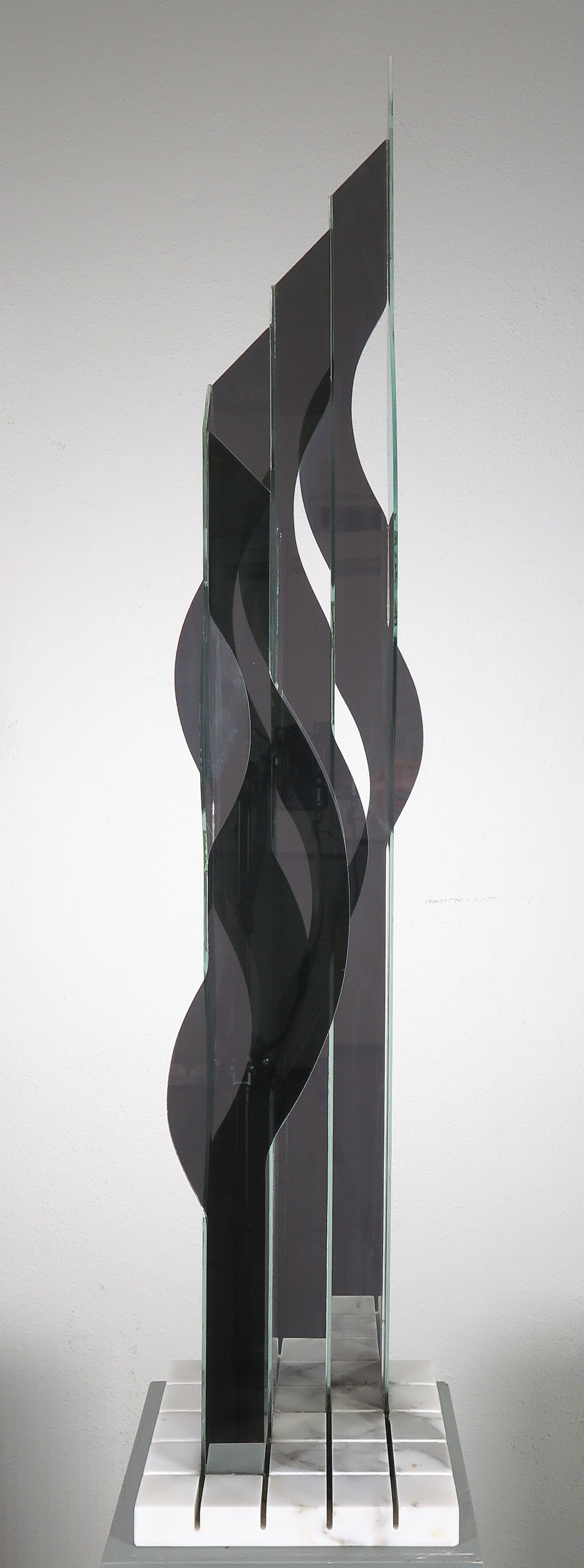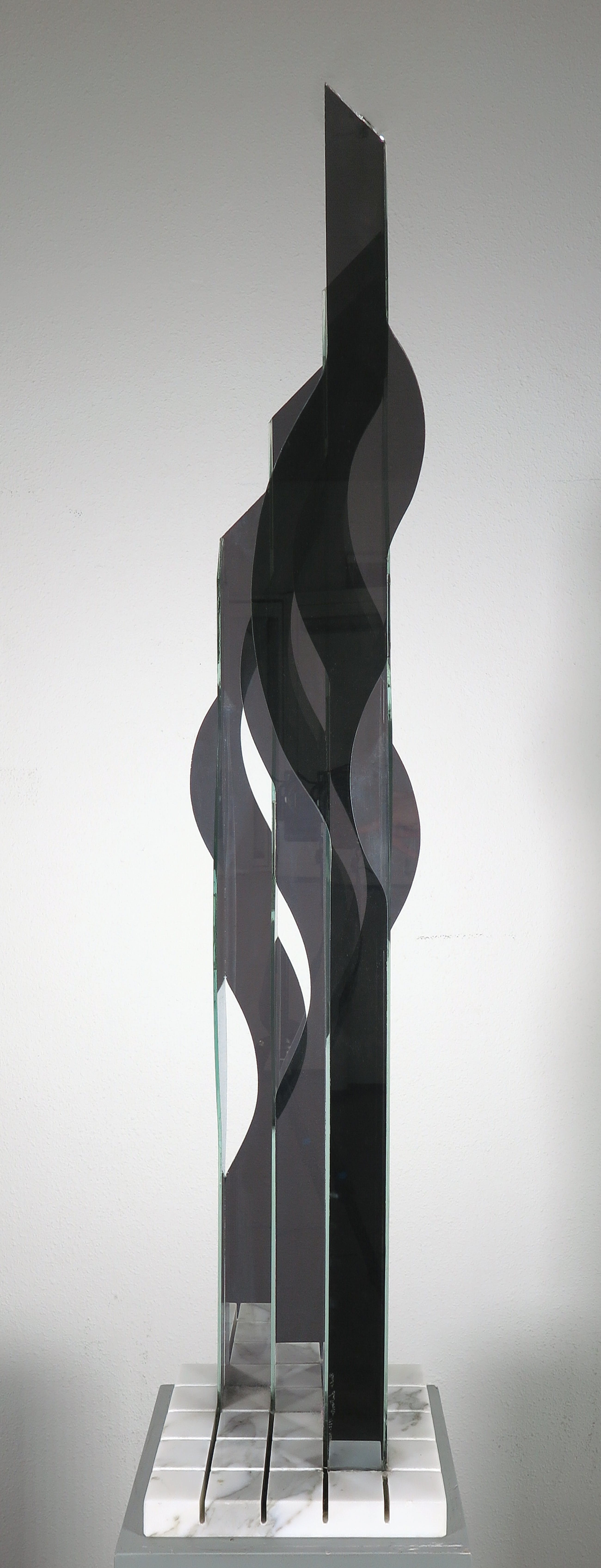 Groot object opgebouwd uit semi-doorzichtig gespiegeld glas, op een marmeren basement. Het werk is getiteld 'Modula III'.