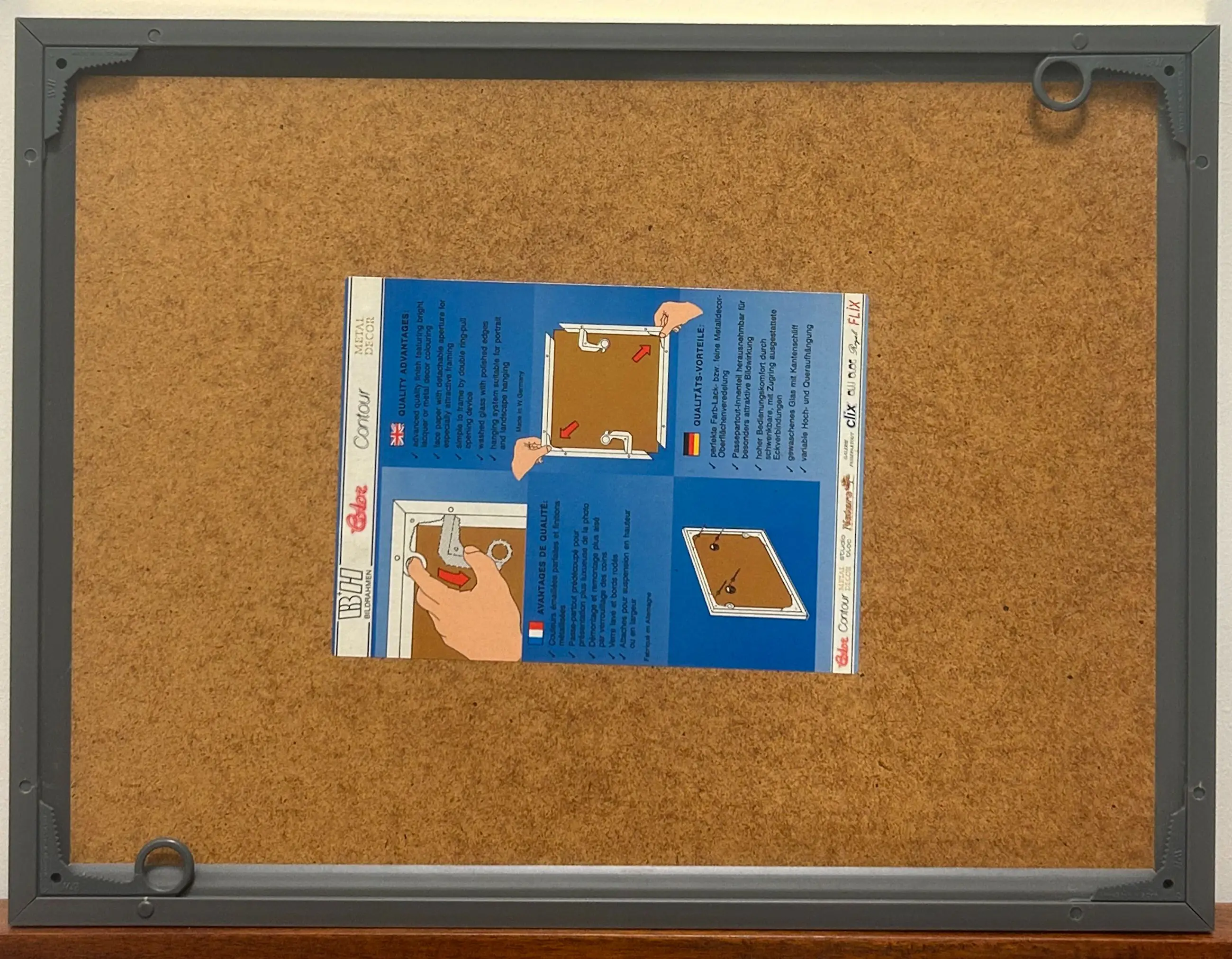 Het betreft een zeefdruk, gepresenteerd in een goudkleurig aluminium lijstje. Het lijstje vertoont hier en daar lichte gebruikssporen, passend bij de leeftijd, maar verkeert overall in nette staat.