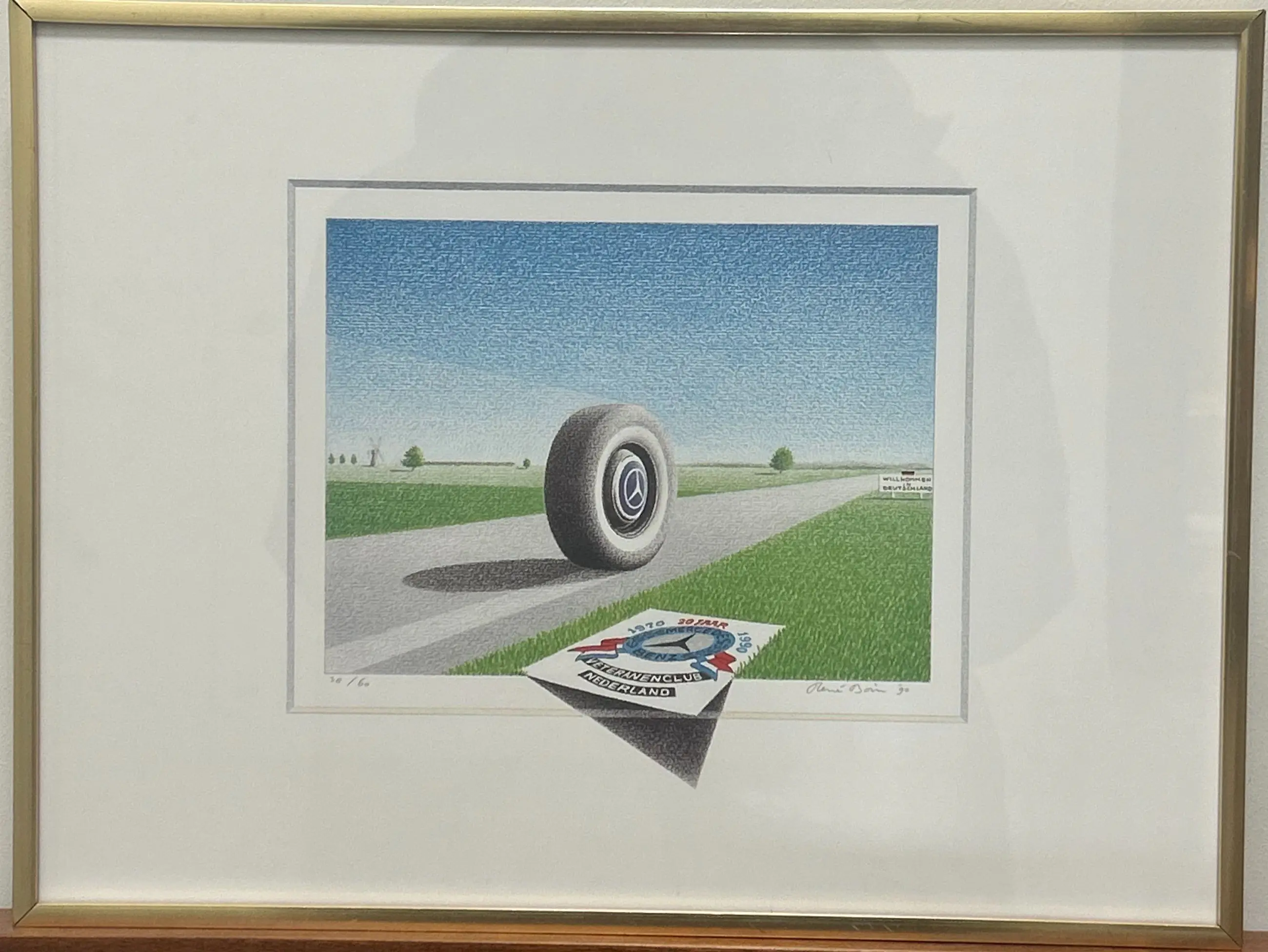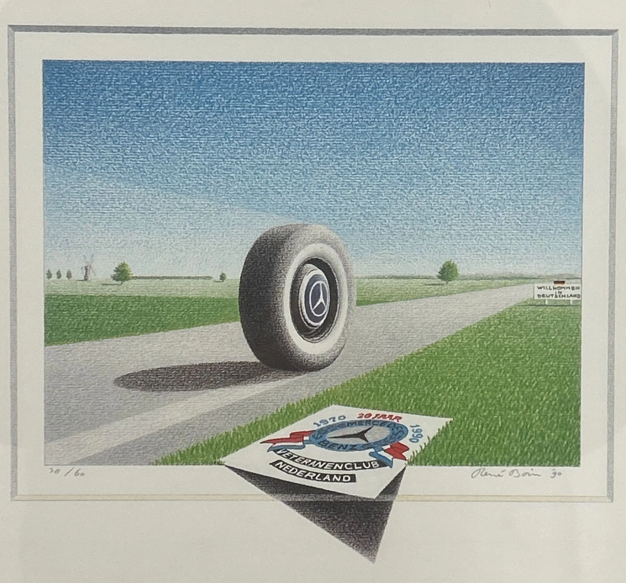 Dit schilderij is vervaardigd door René Boin in 1990. Het werk bevat de tekst “Veteranenclub Nederland 1970–1990 – 20 jaar – Willkommen in Deutschland – Mercedes-Benz” en verwijst naar het twintigjarig jubileum van de Veteranenclub Nederland, met een duidelijke link naar het merk Mercedes-Benz.