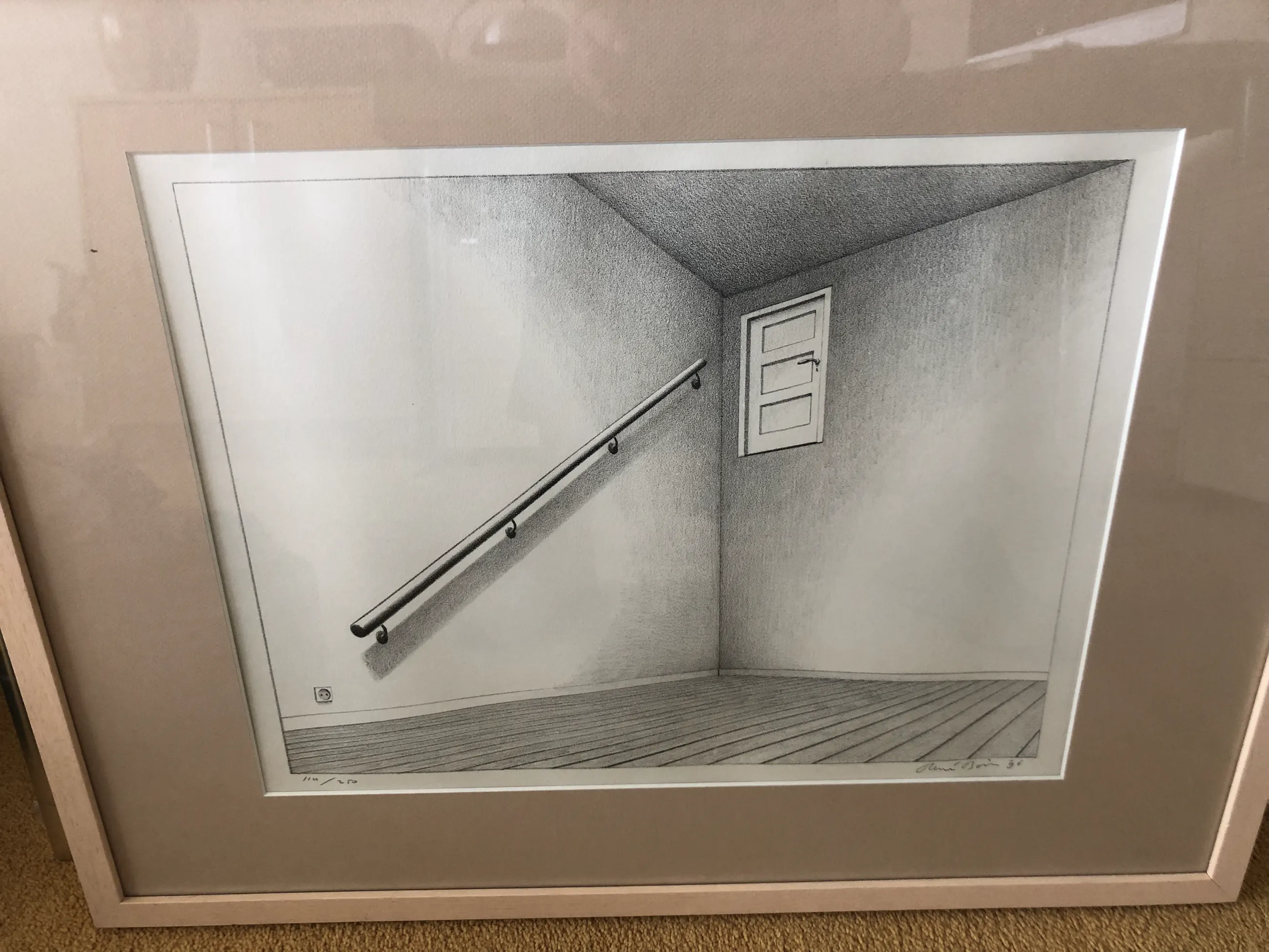 Getekende abstracte tekening waar kijker wordt verrast van alleen een trapleuning die leidt naar een deur. Nummer 114 van een oplage van 250.