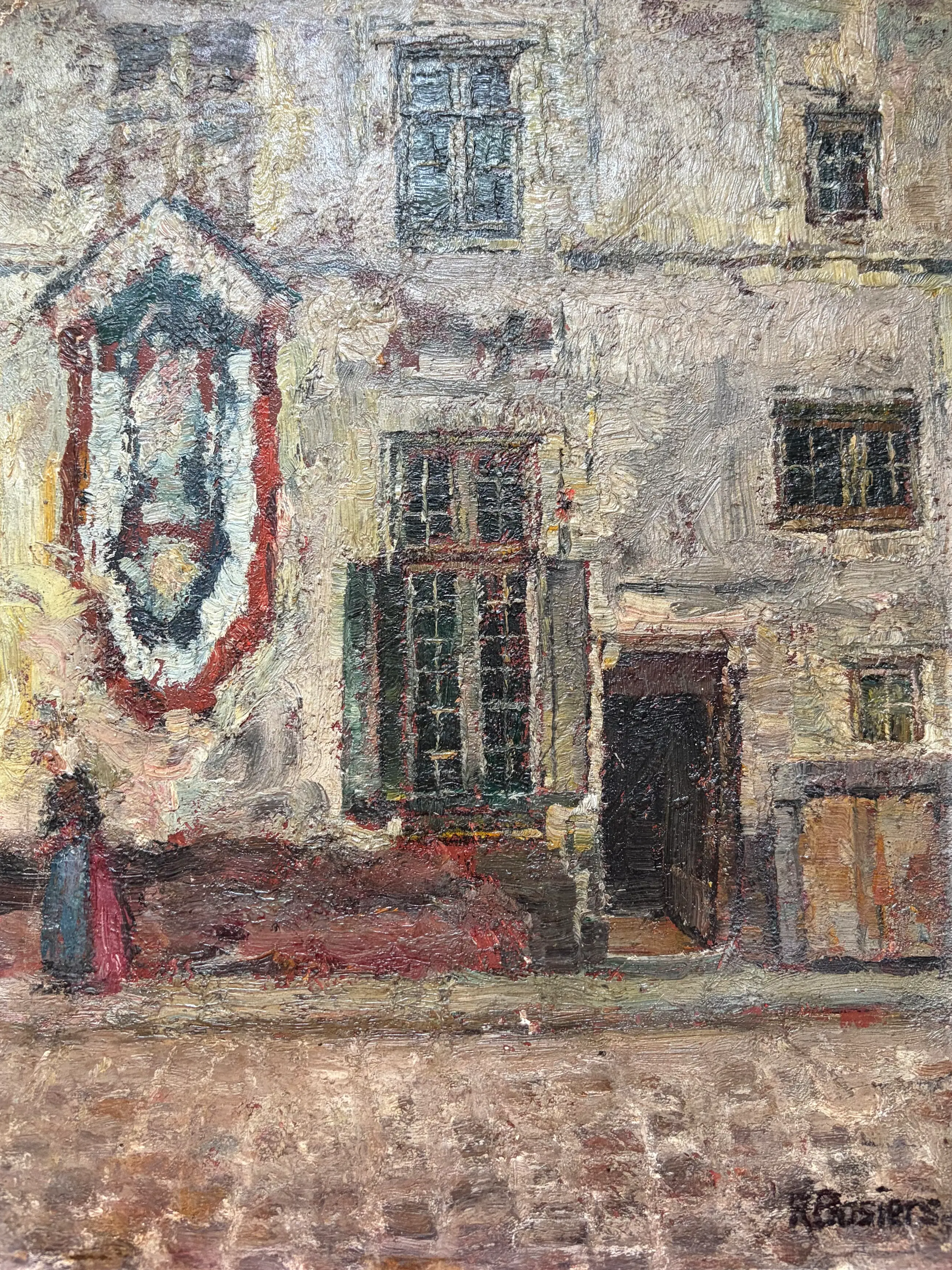Sfeervol stadsgezicht met een historische gevel en een religieuze nis, uitgevoerd in olieverf op doek. Het schilderij toont een karakteristieke architecturale scène met verweerde muren, houten vensters en een kleine passerende figuur, geschilderd in een warm en gedempt kleurenpalet van oker-, rood- en grijstinten.