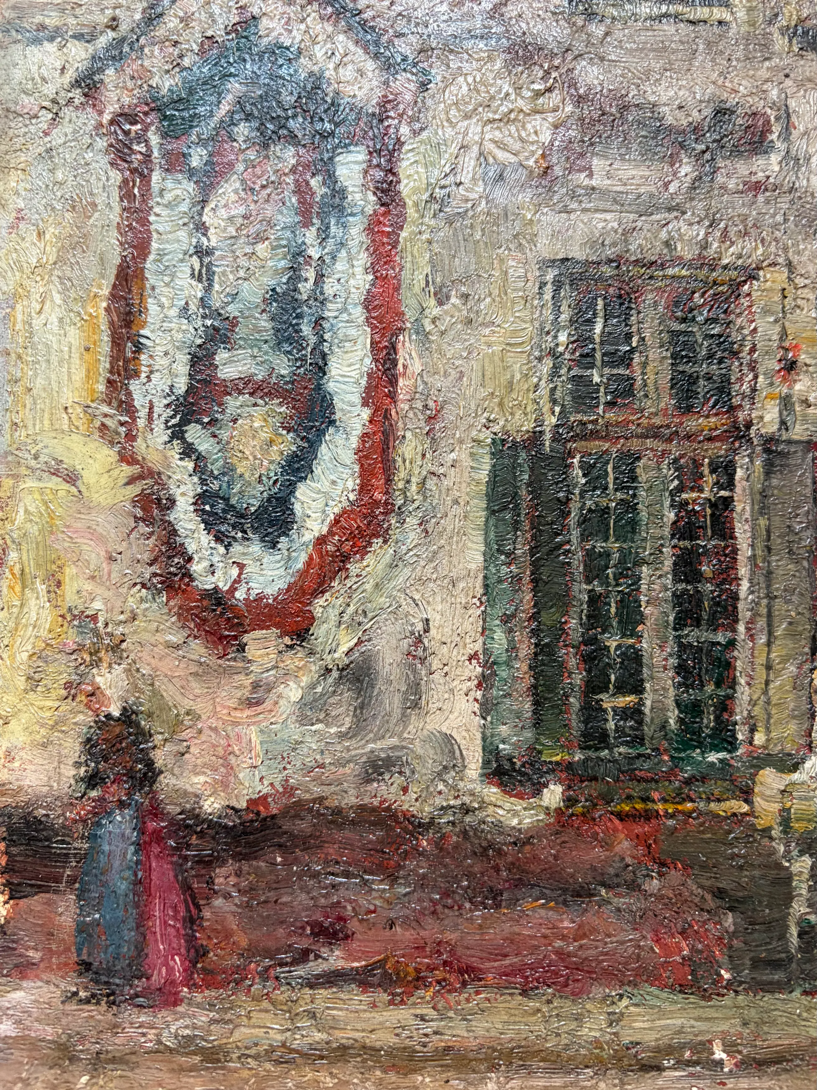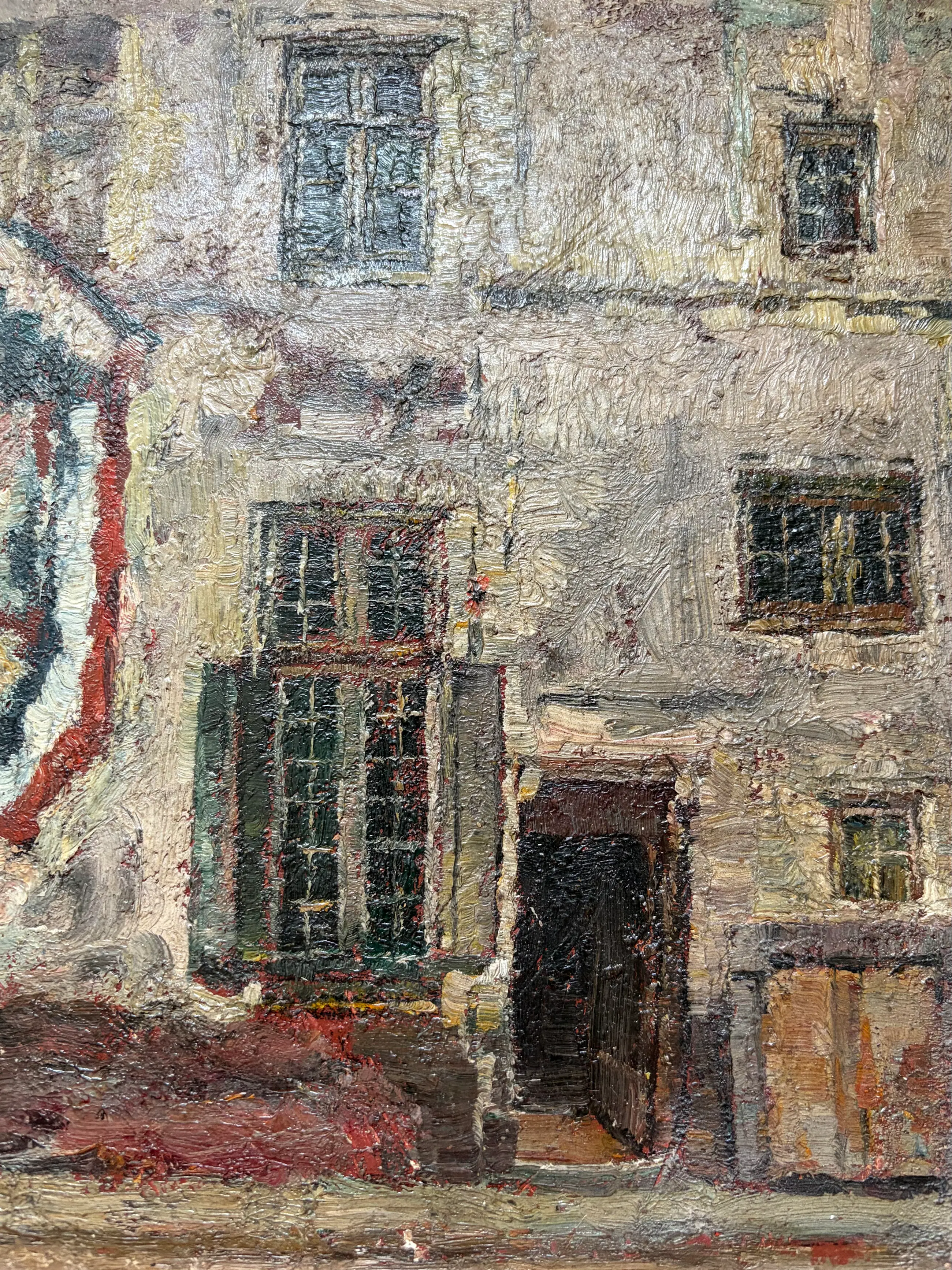 De verf is met zichtbaar penseelwerk en lichte impasto aangebracht, waardoor de structuur van pleisterwerk en baksteen subtiel tot leven komt. Het geheel ademt de nostalgische sfeer van het vroeg-20e-eeuwse stadsleven.