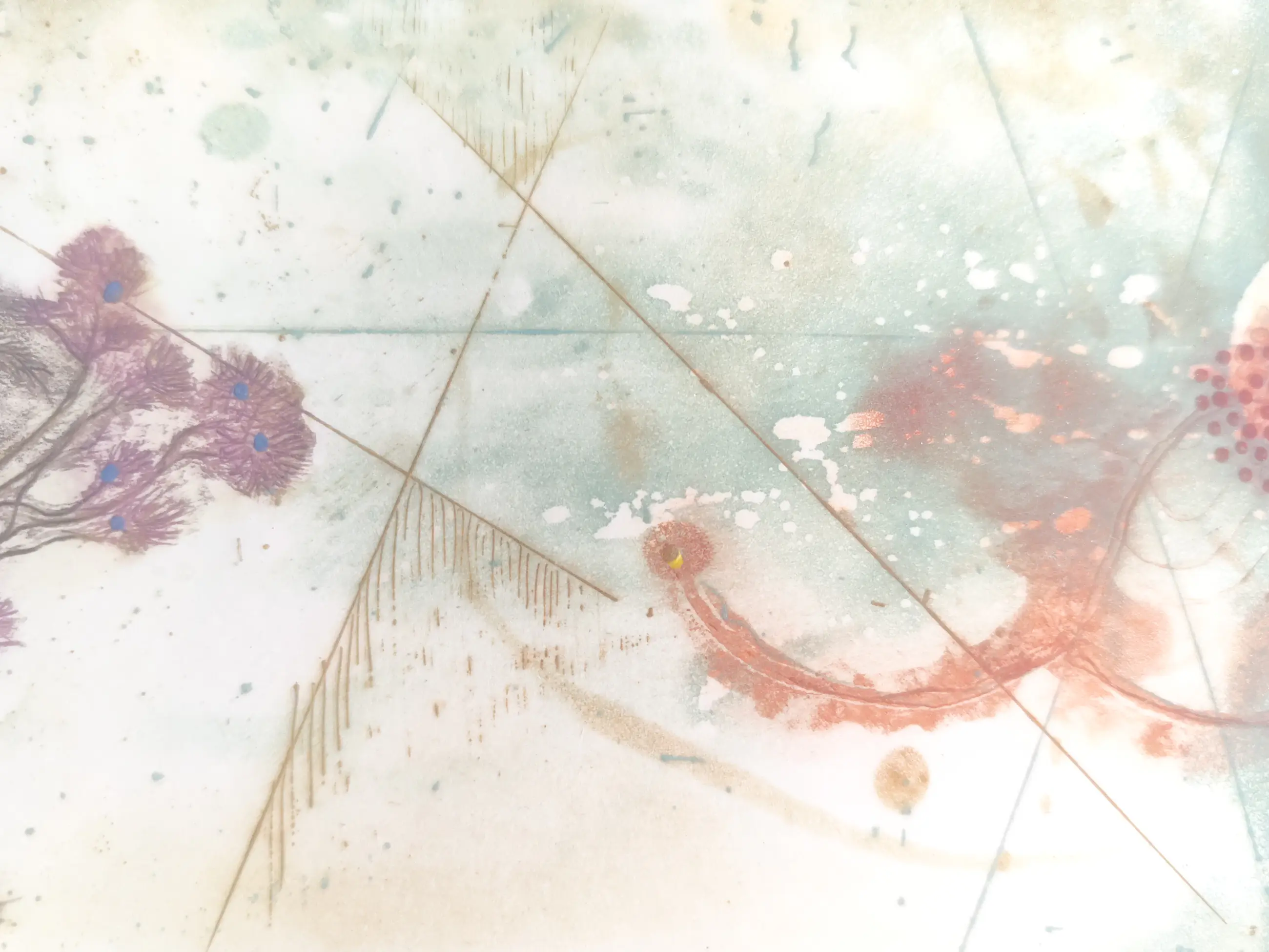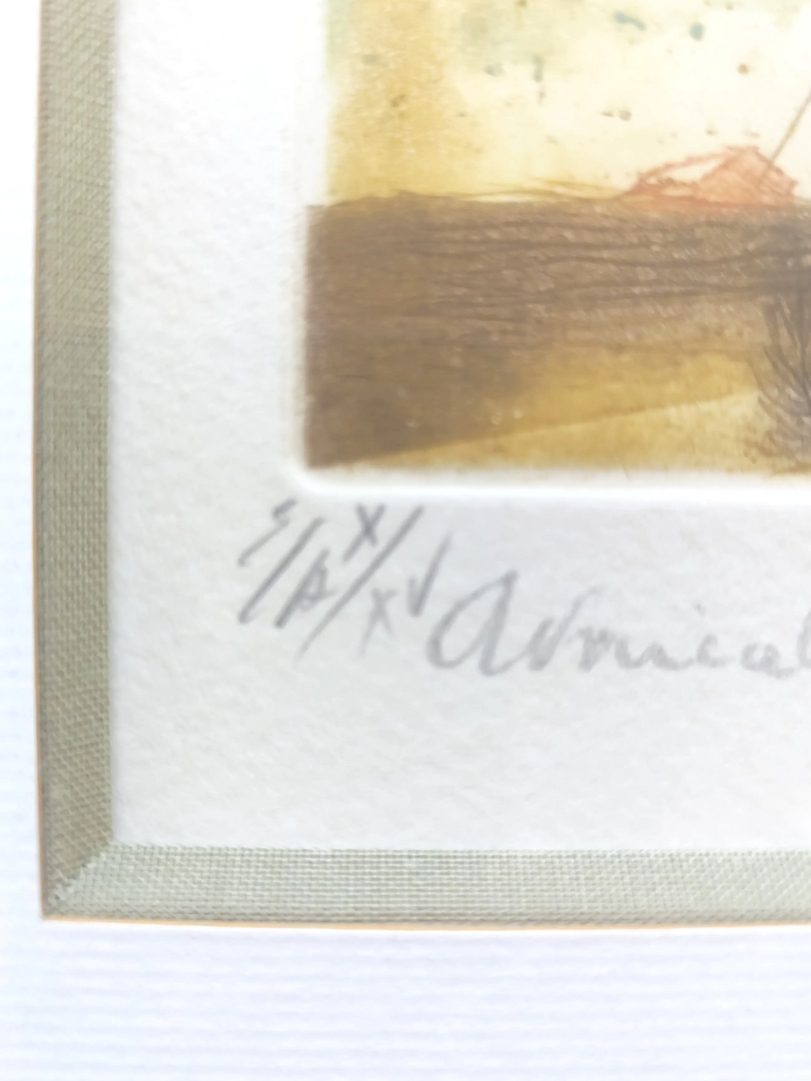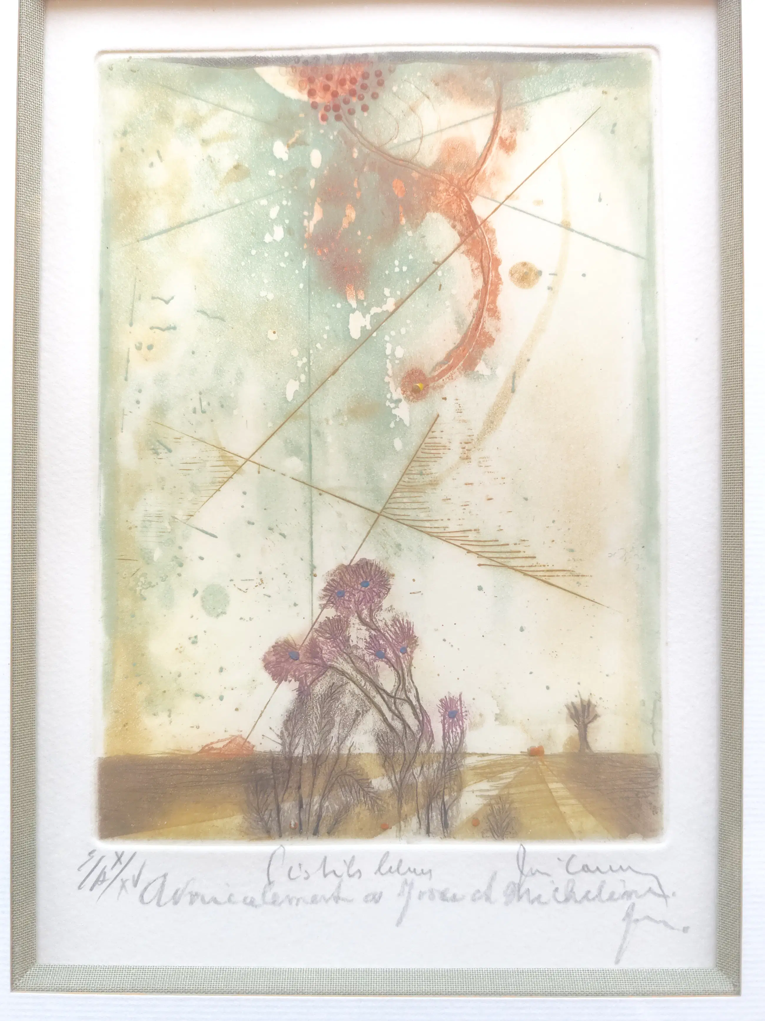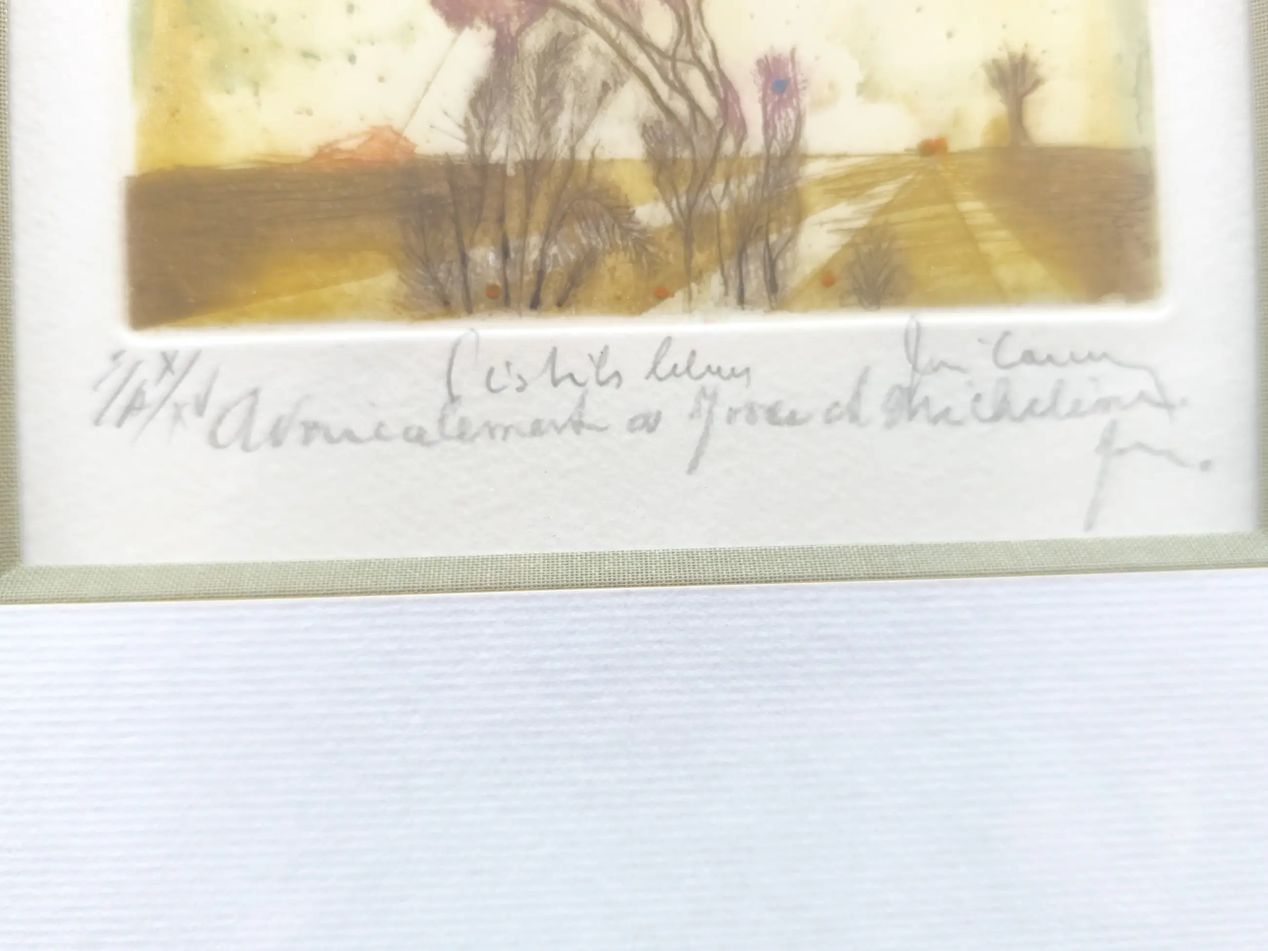 Kunstenaar: René Carcan (België) Titel: Blauwe liedjes Techniek: Originele kleurenets en aquatint op kunstpapier. Jaar: 1990 (periode van volledige rijping). Editie: Artist's Proof (E/A) – Niet te koop, zeer beperkte oplage. Het werk is rechtsonder met potlood gesigneerd door de kunstenaar en gedateerd "90". Het bevat een persoonlijke, handgeschreven opdracht: "Met genegenheid voor Josée en Micheline". Deze opdracht garandeert een directe herkomst uit het atelier van de kunstenaar.