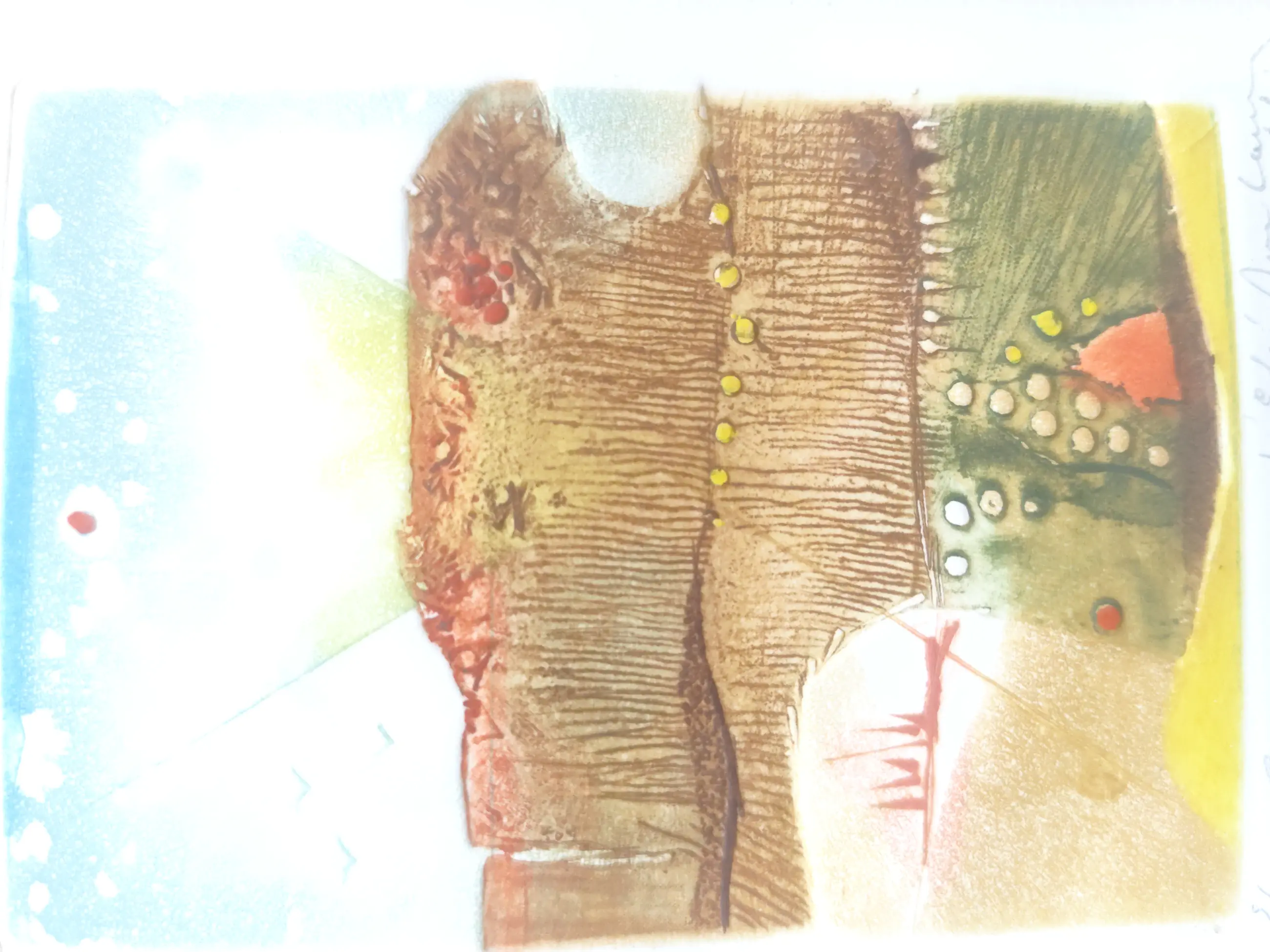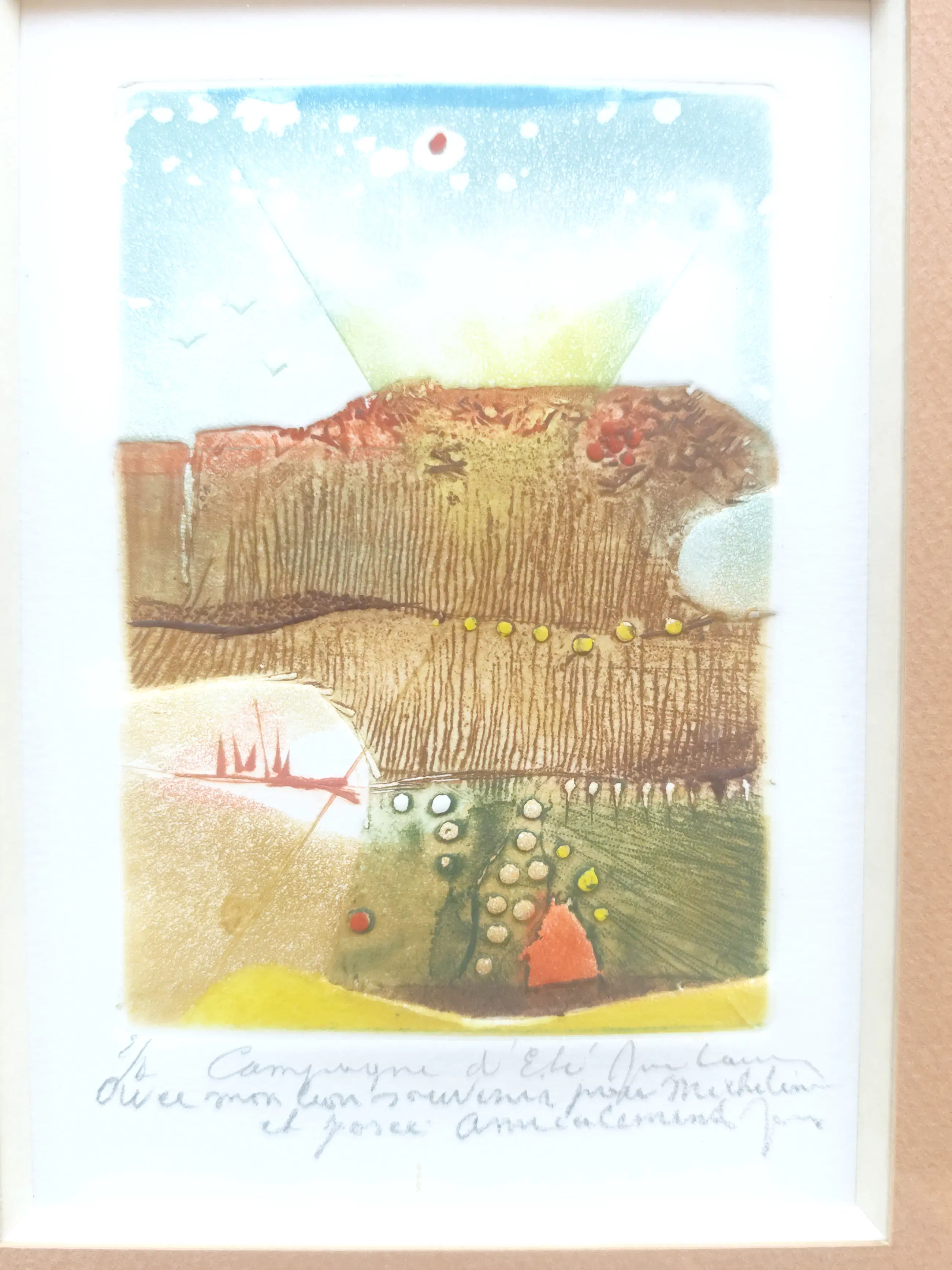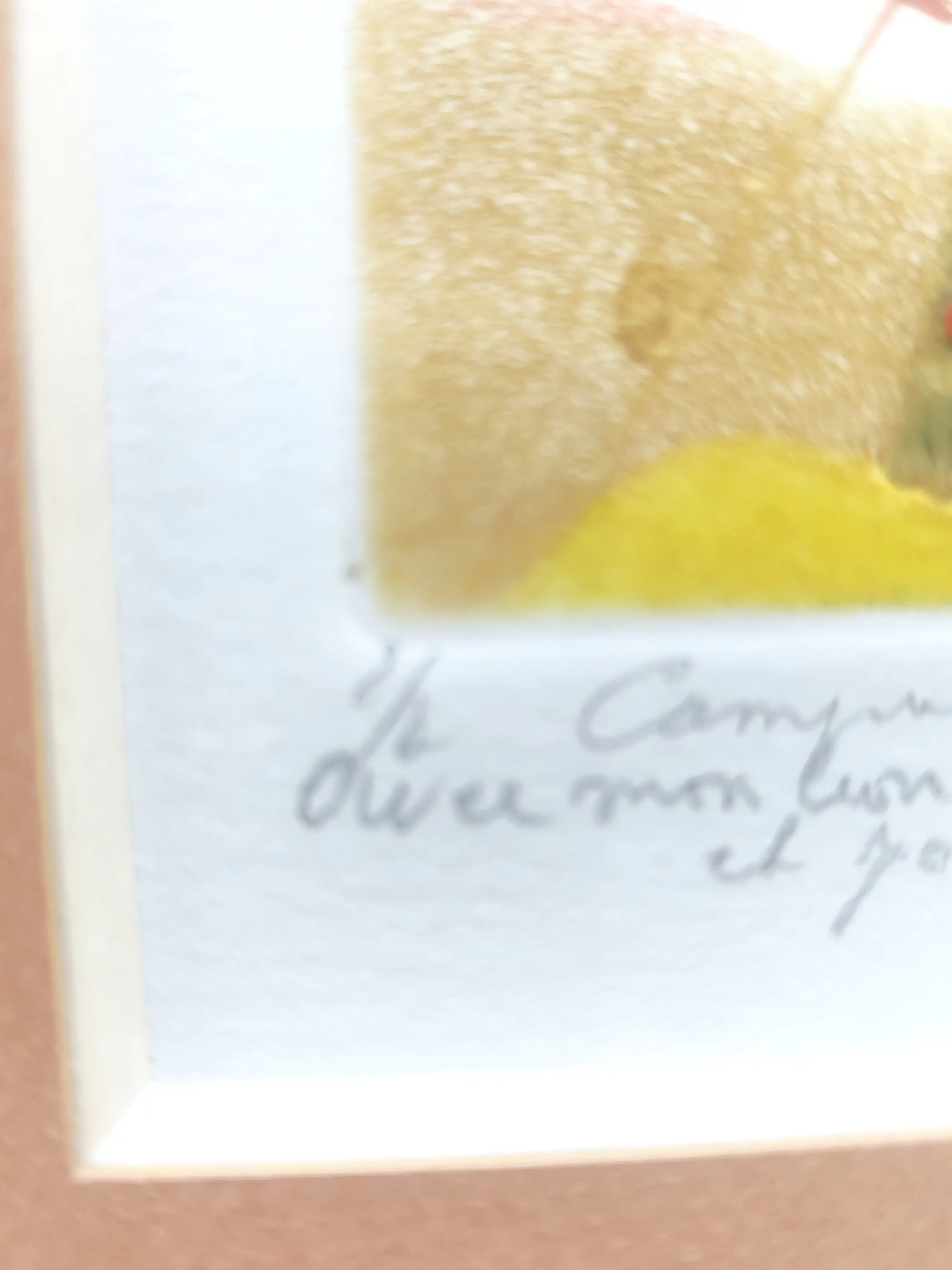 Het werk is voorzien van een hartelijke, handgeschreven opdracht van de kunstenaar: "Met warme herinneringen aan Micheline en Josée, de uwe." Handgeschreven handtekening R. Carcan, gedateerd 1990.