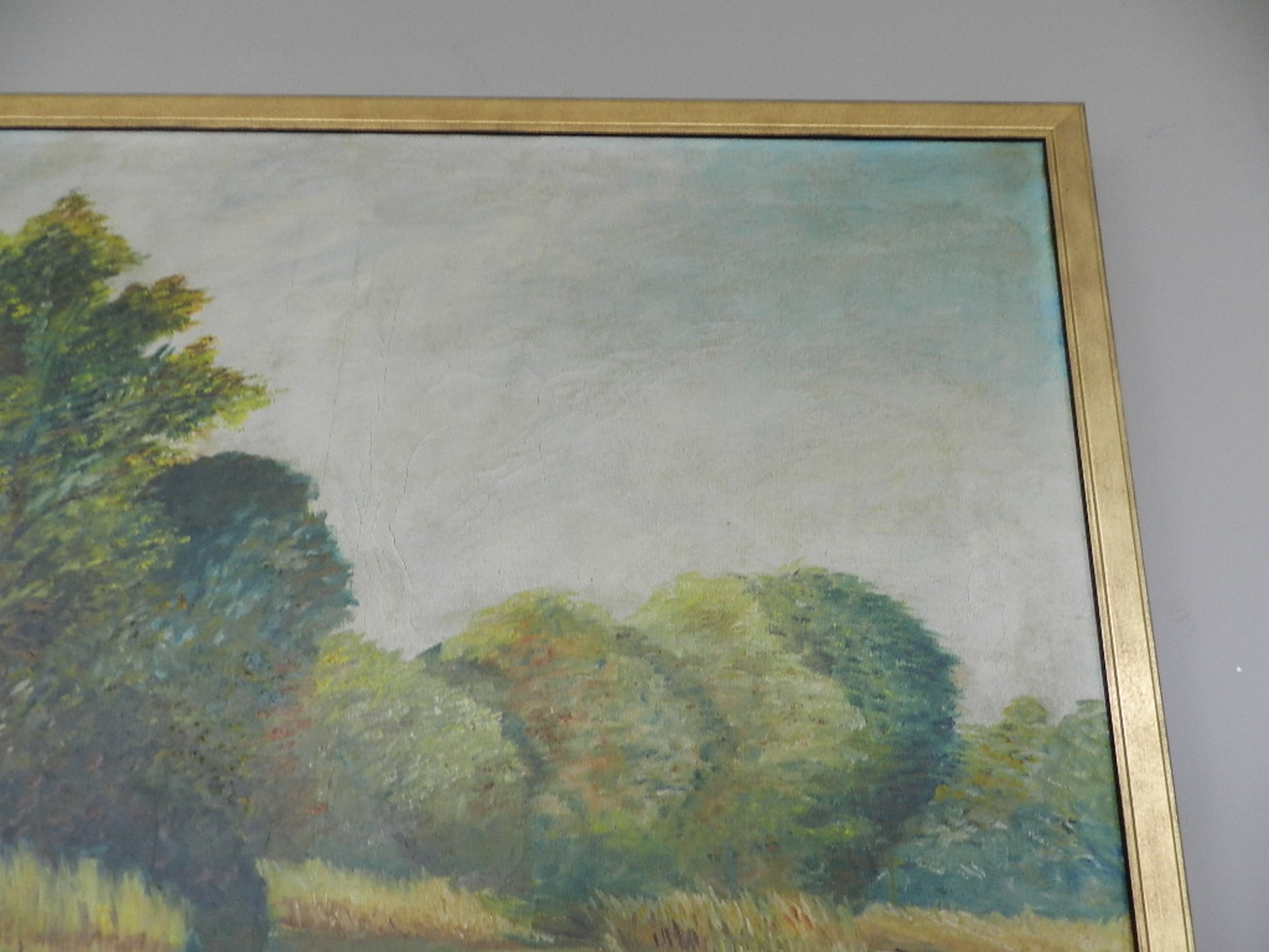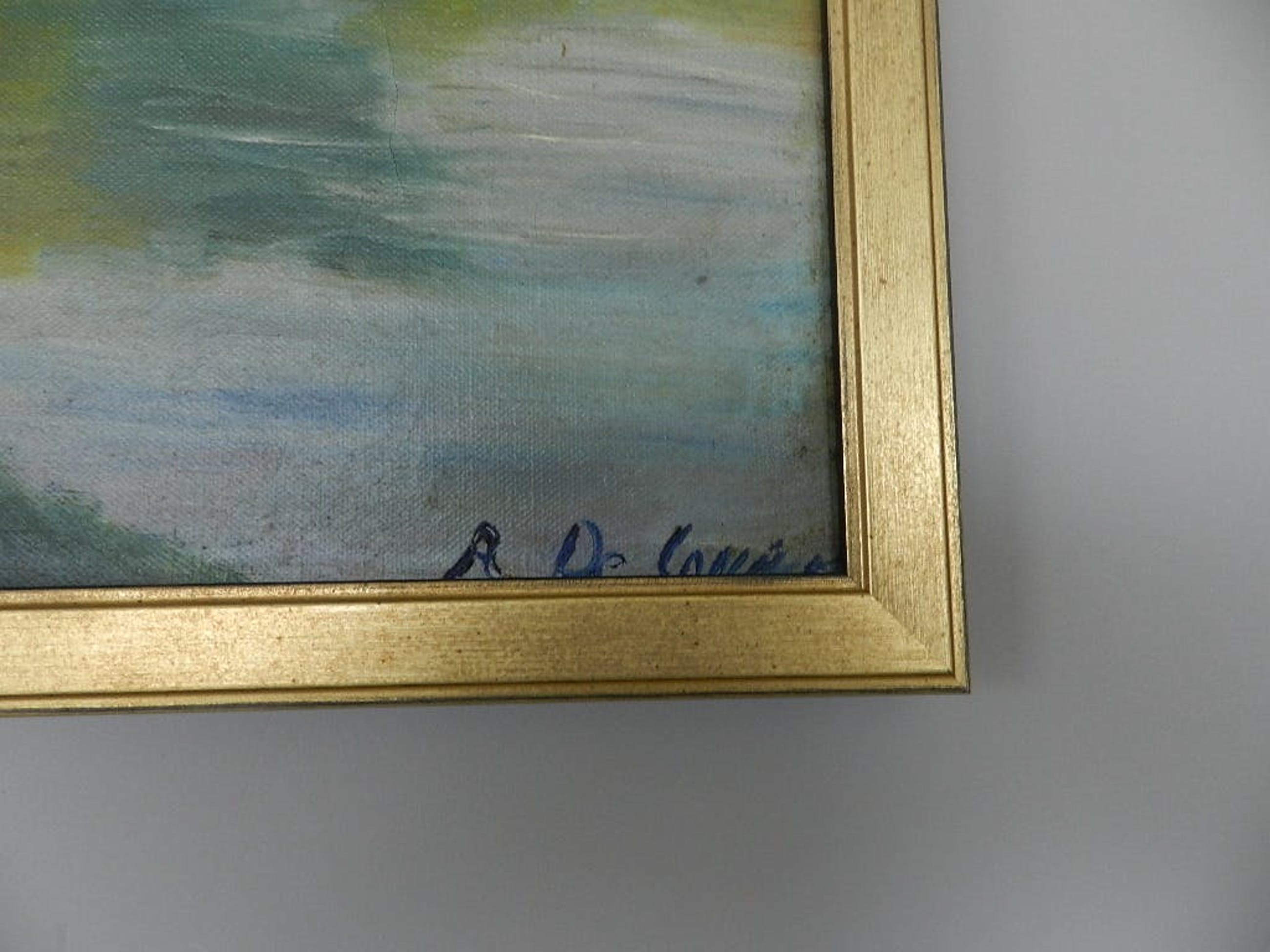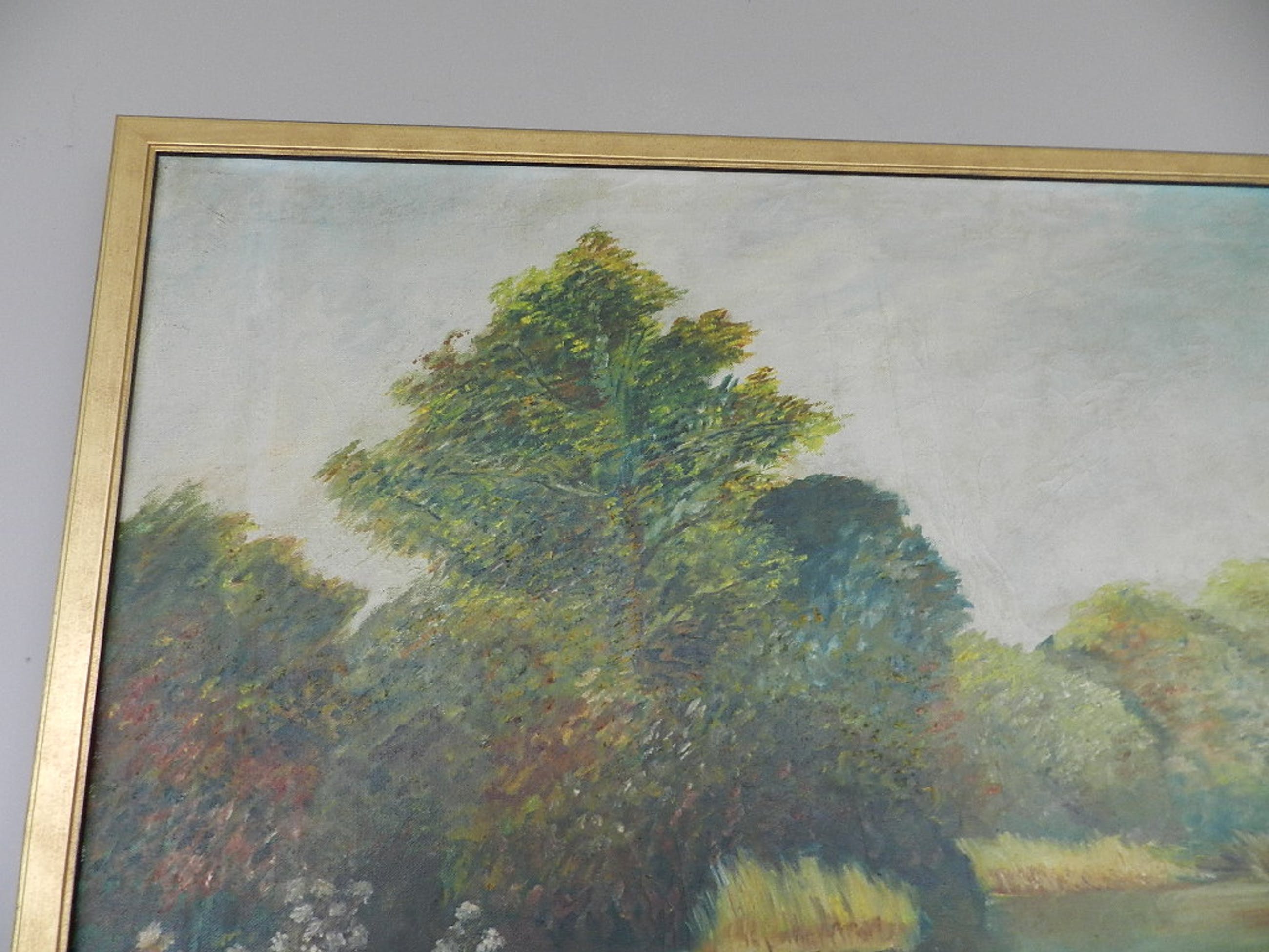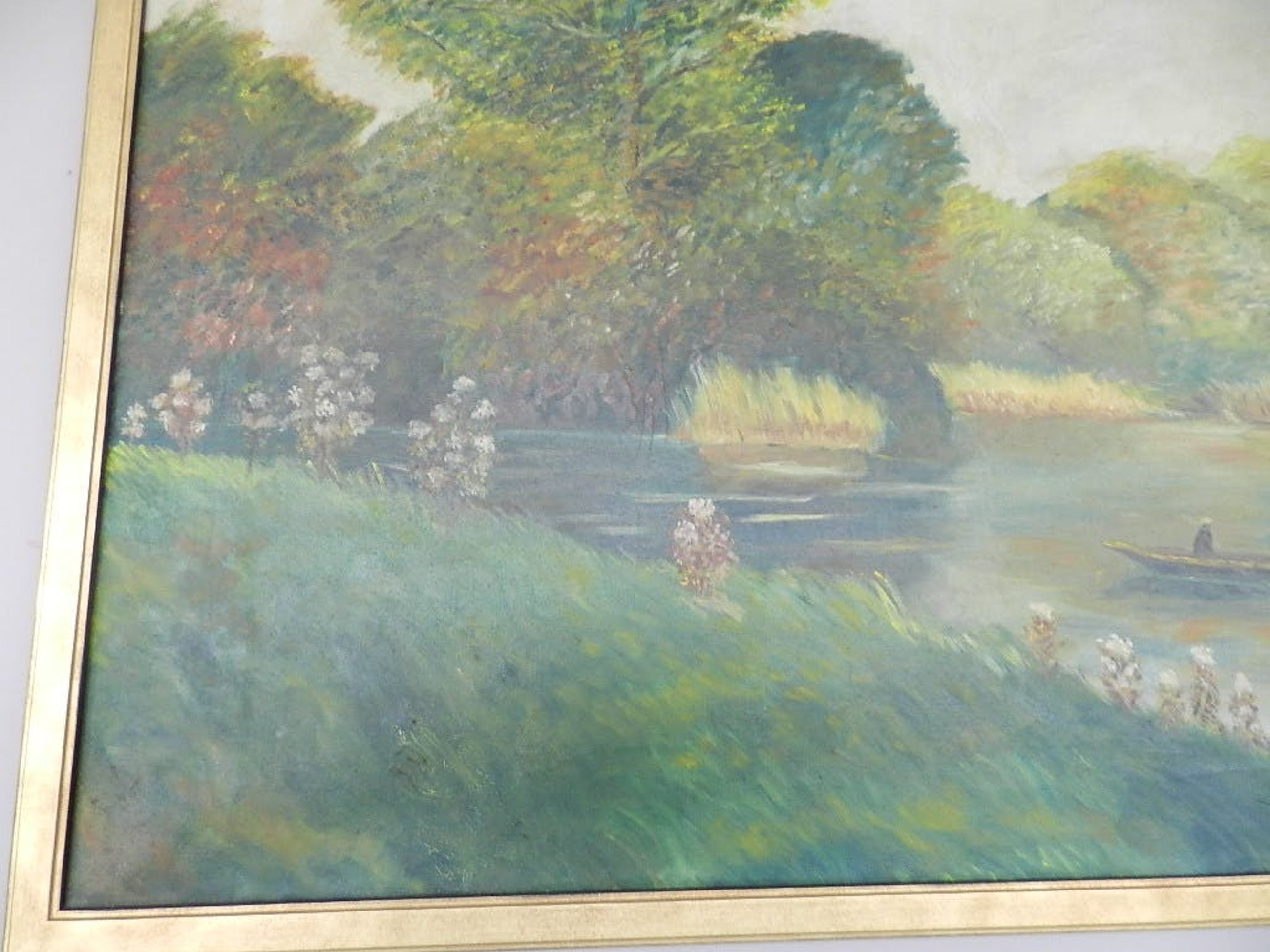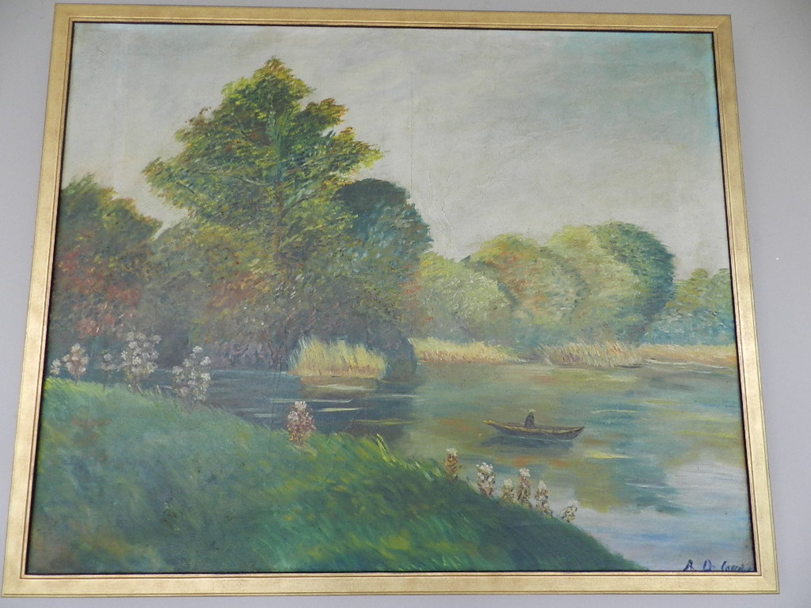 Een typisch kleurrijk rvier- landschap van deze bekende Vlaamse schilder en etser . Het werk is in uitstekende staat met een mooie goudkleurige lijst .