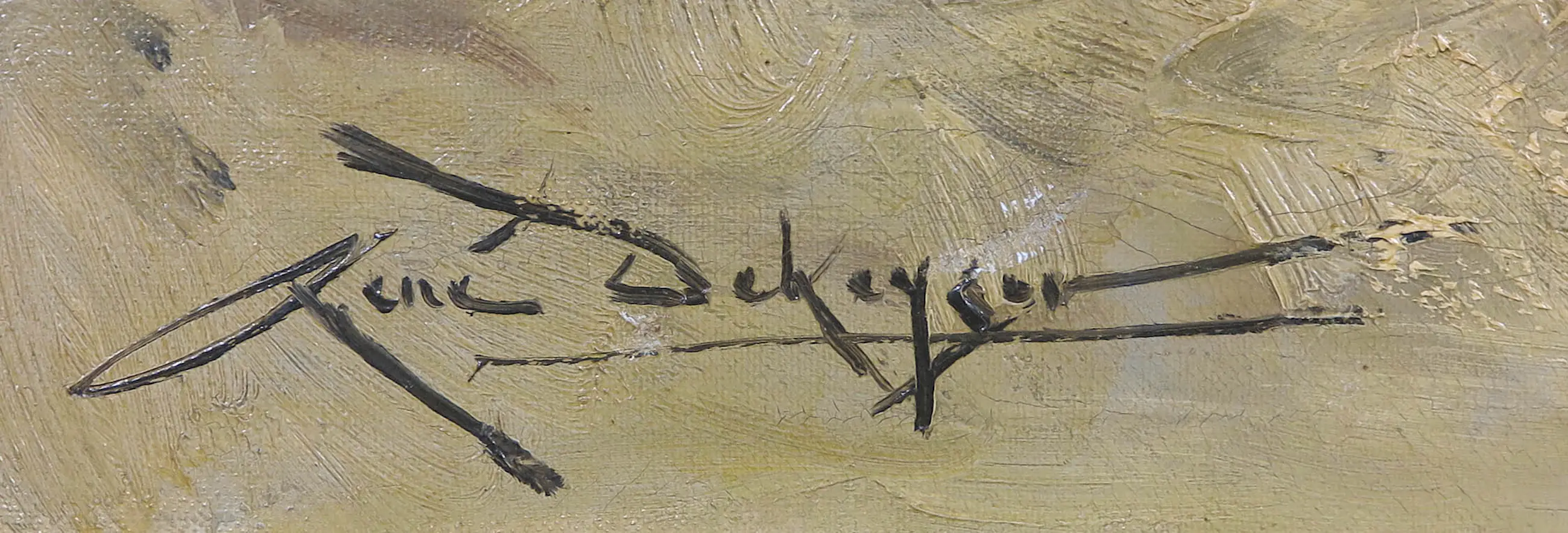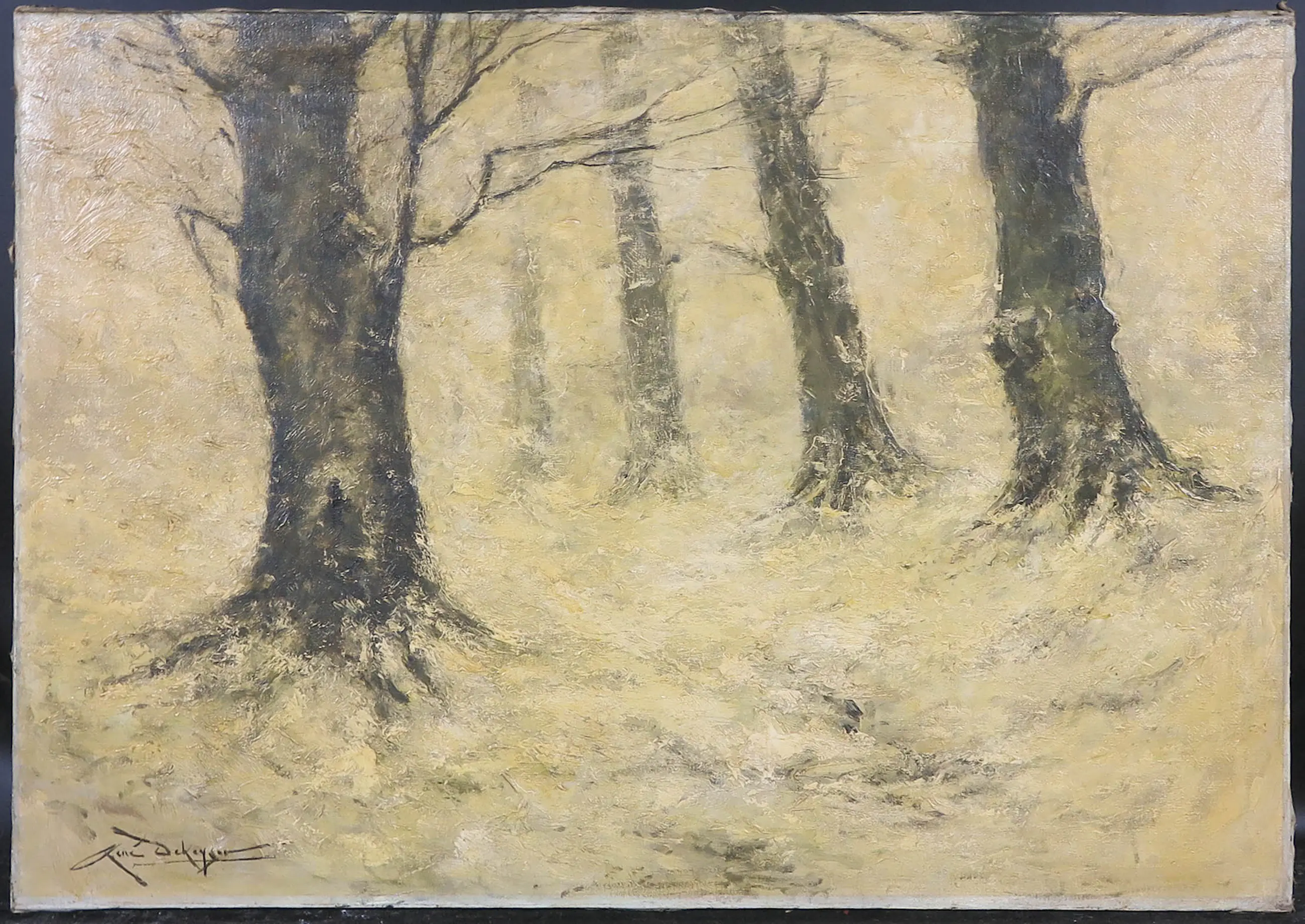 Olieverfschilderij van René Dekeyser met gezicht op een bos. Dekeyser was een Belgisch kunstenaar en staat vooral bekend om zijn romantische landschappen. Het werk is linksonder handgesigneerd door de kunstenaar.
