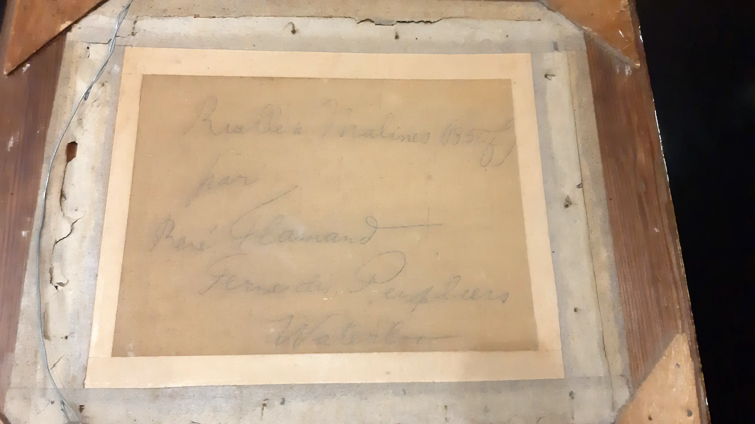 Het betreft hier vermoedelijk het straatje achter de Jezuspoort in Mechelen. Op de achterkant de tekst: Ruelle à Malines par René Flamand Ferme des Peupliers Waterloo