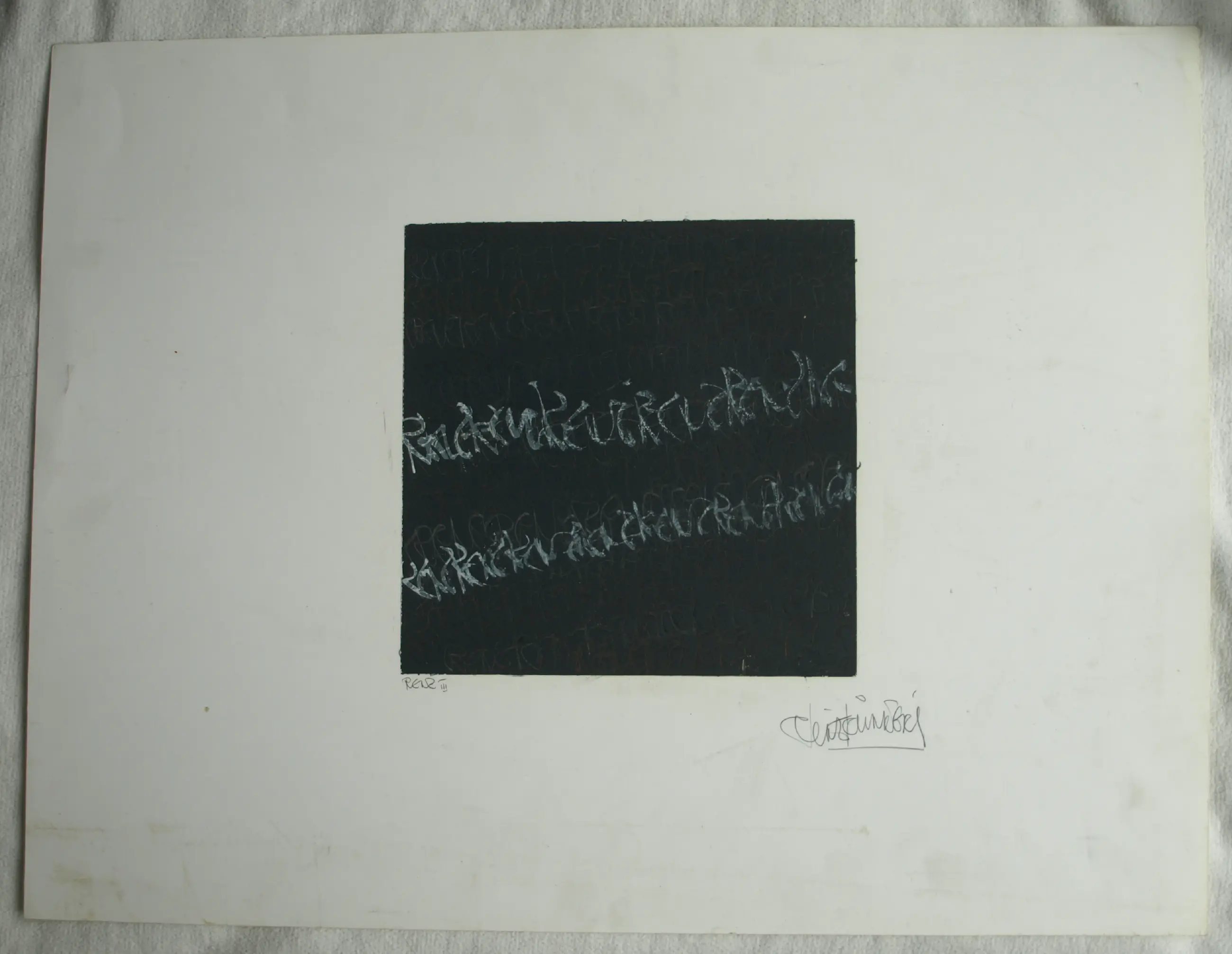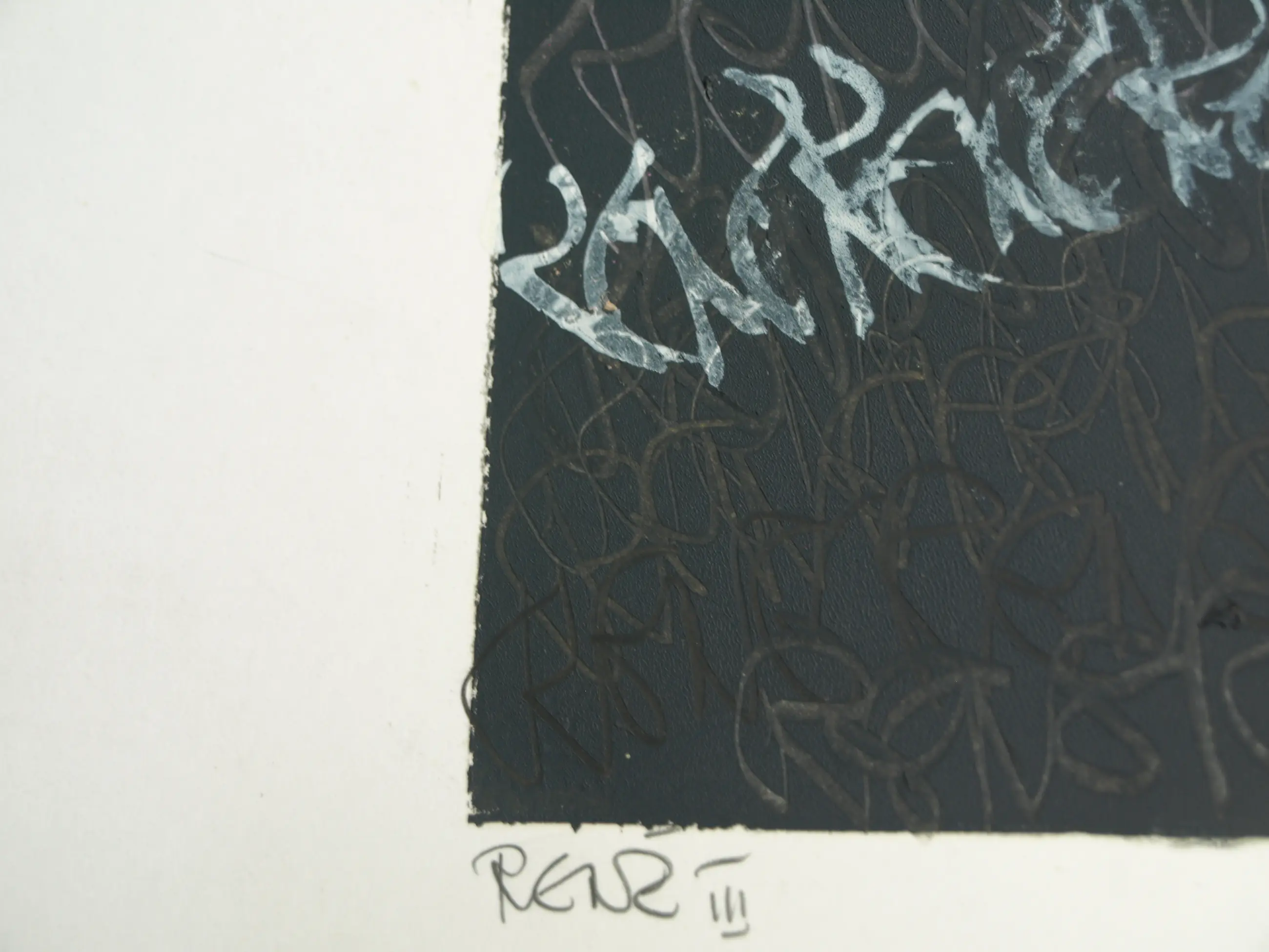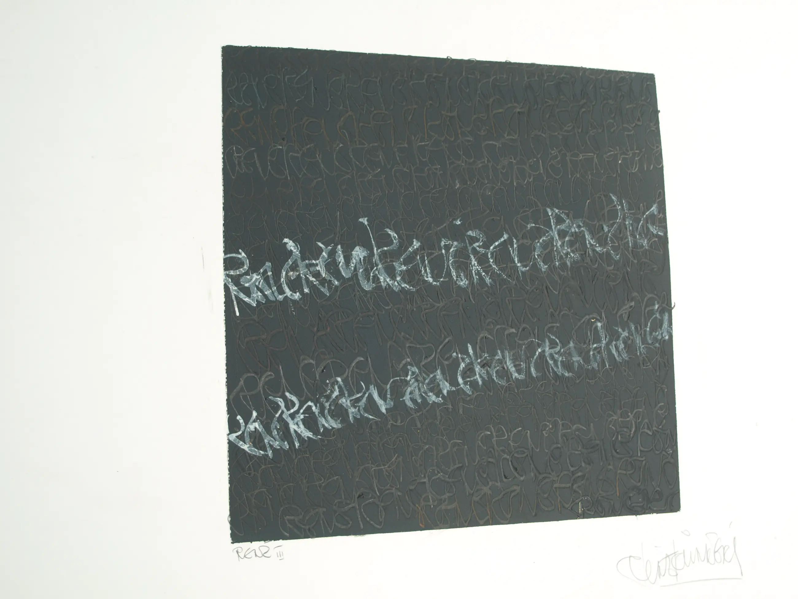 Een minimalistisch werk op papier van de Nederlandse kunstenaar René Klinkers (1943-2011), getiteld “René III”. -Techniek: Een dikke laag (druk)inkt op papier waarbij de kunstenaar, in de nog natte inkt, onafgebroken zijn naam ‘René’ schrijft. -Gesigneerd rechtsonder. -Niet ingelijst en ook nooit ingelijst geweest. -Jaartal onbekend. -Afmetingen: Blad, 50 x 65 cm. Beeld, 25 x 25 cm. -Herkomst: Uit de nalatenschap van de kunstenaar, overleden in 2011 in het Rosa Spierhuis in Laren. -Conditie: In goede staat. Het blad is, buiten beeld, vlekkerig. Zie ook de foto’s.