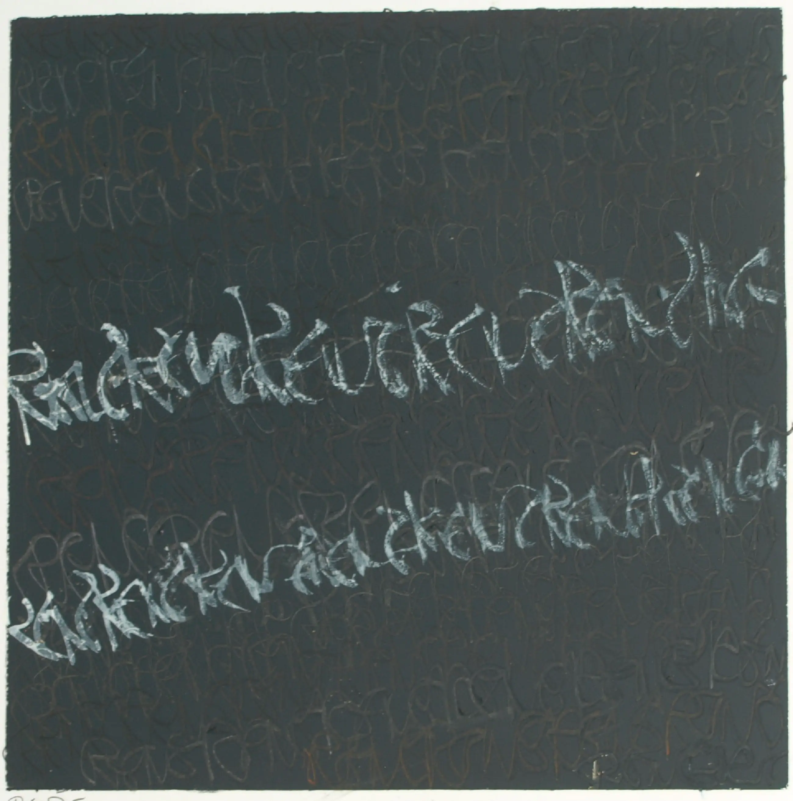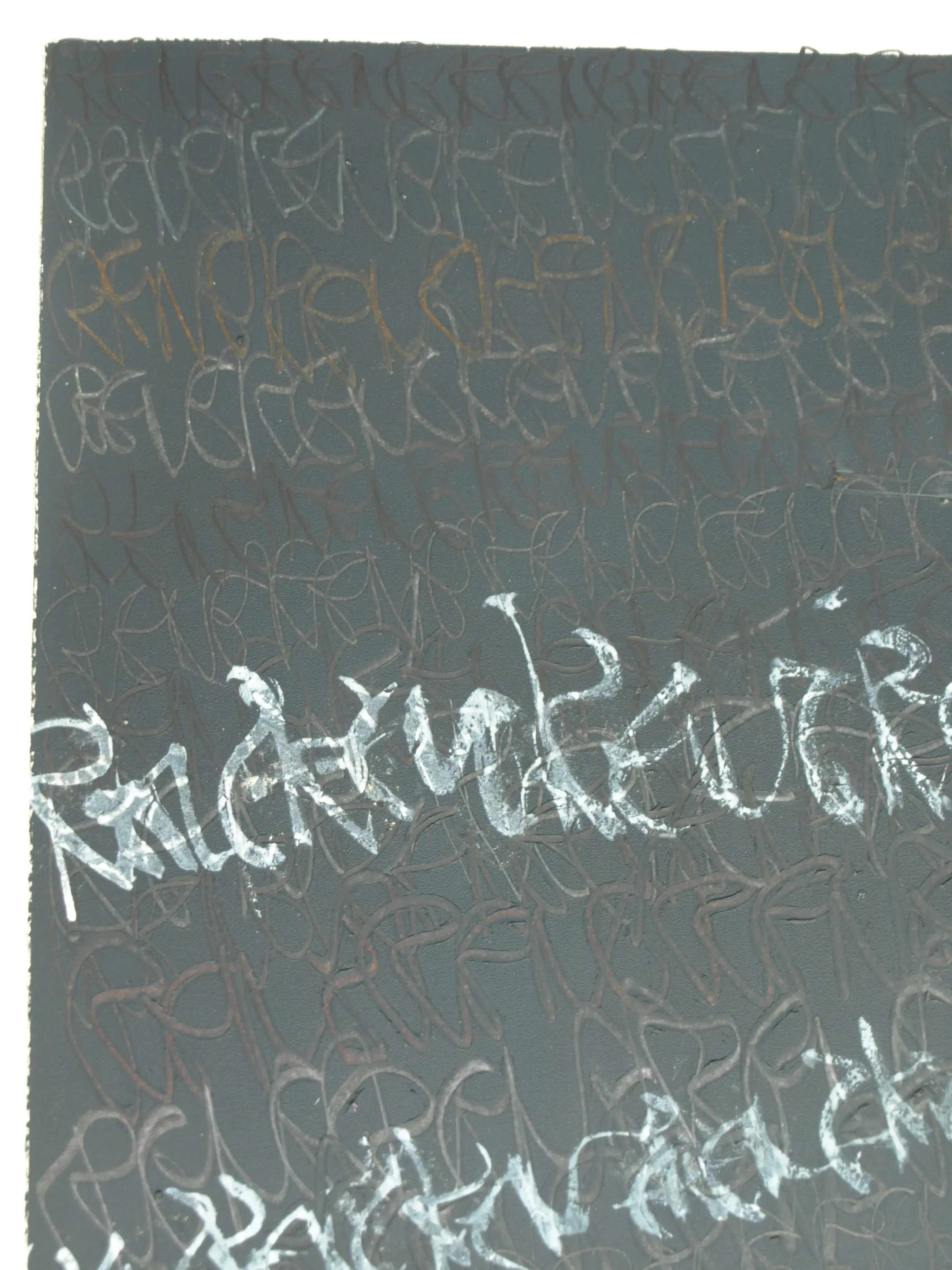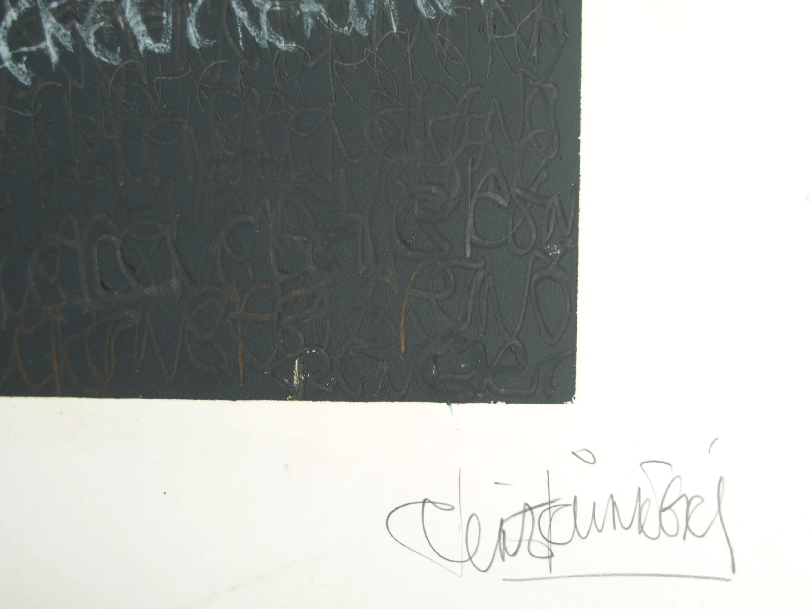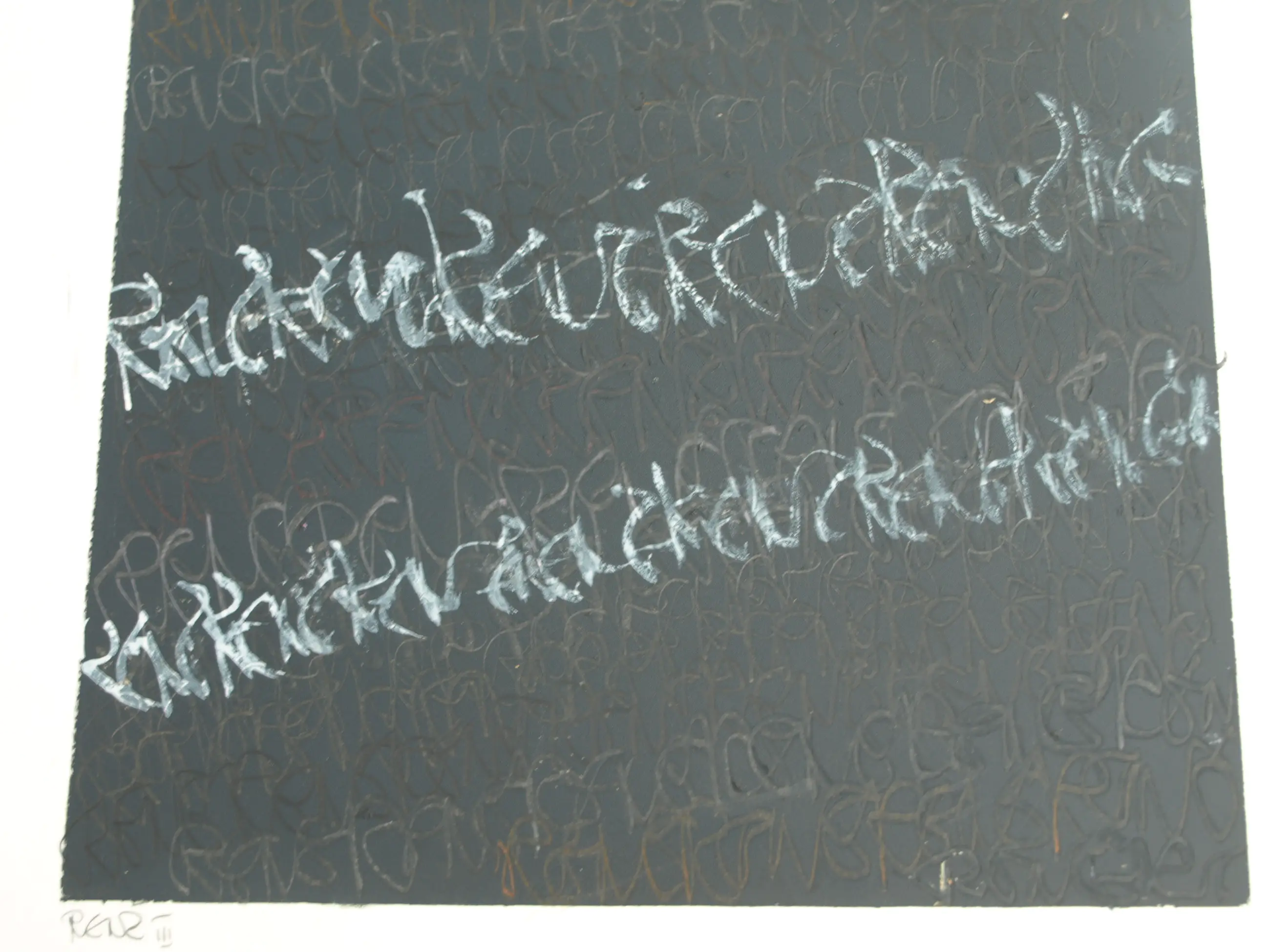 Een minimalistisch werk op papier van de Nederlandse kunstenaar René Klinkers (1943-2011), getiteld “René III”. -Techniek: Een dikke laag (druk)inkt op papier waarbij de kunstenaar, in de nog natte inkt, onafgebroken zijn naam ‘René’ schrijft. -Gesigneerd rechtsonder. -Niet ingelijst en ook nooit ingelijst geweest. -Jaartal onbekend. -Afmetingen: Blad, 50 x 65 cm. Beeld, 25 x 25 cm. -Herkomst: Uit de nalatenschap van de kunstenaar, overleden in 2011 in het Rosa Spierhuis in Laren. -Conditie: In goede staat. Het blad is, buiten beeld, vlekkerig. Zie ook de foto’s.
