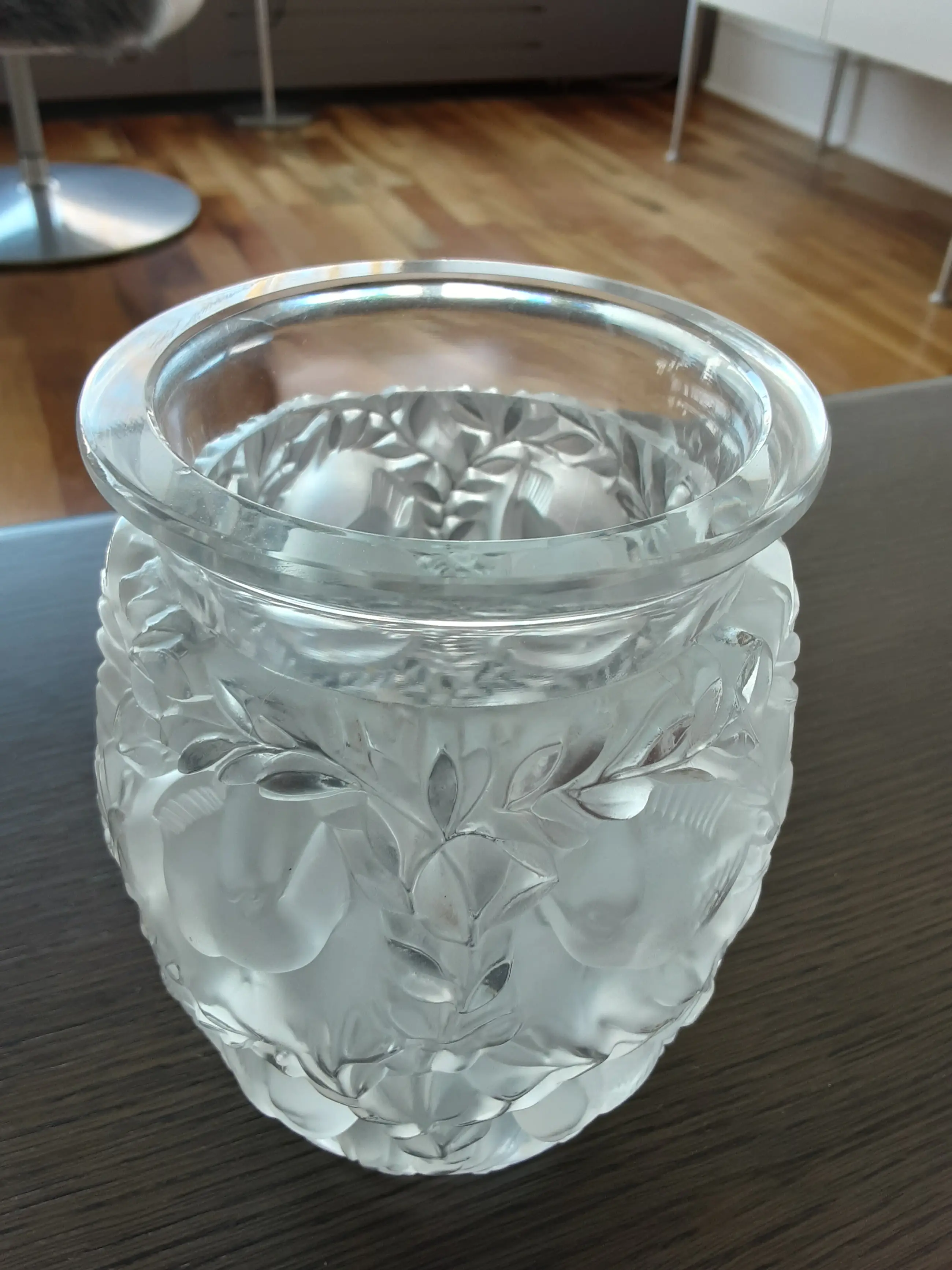 Mooi zware vaas met vogeltjes deels gepatineerd. Onderzijde met diamantstift gesigneerd,(r?)laligue france. Zie foto. In zeer goede staat ,met gebruikskrasjes op onderkant, daardoor niet met zekerheid de r te zien.