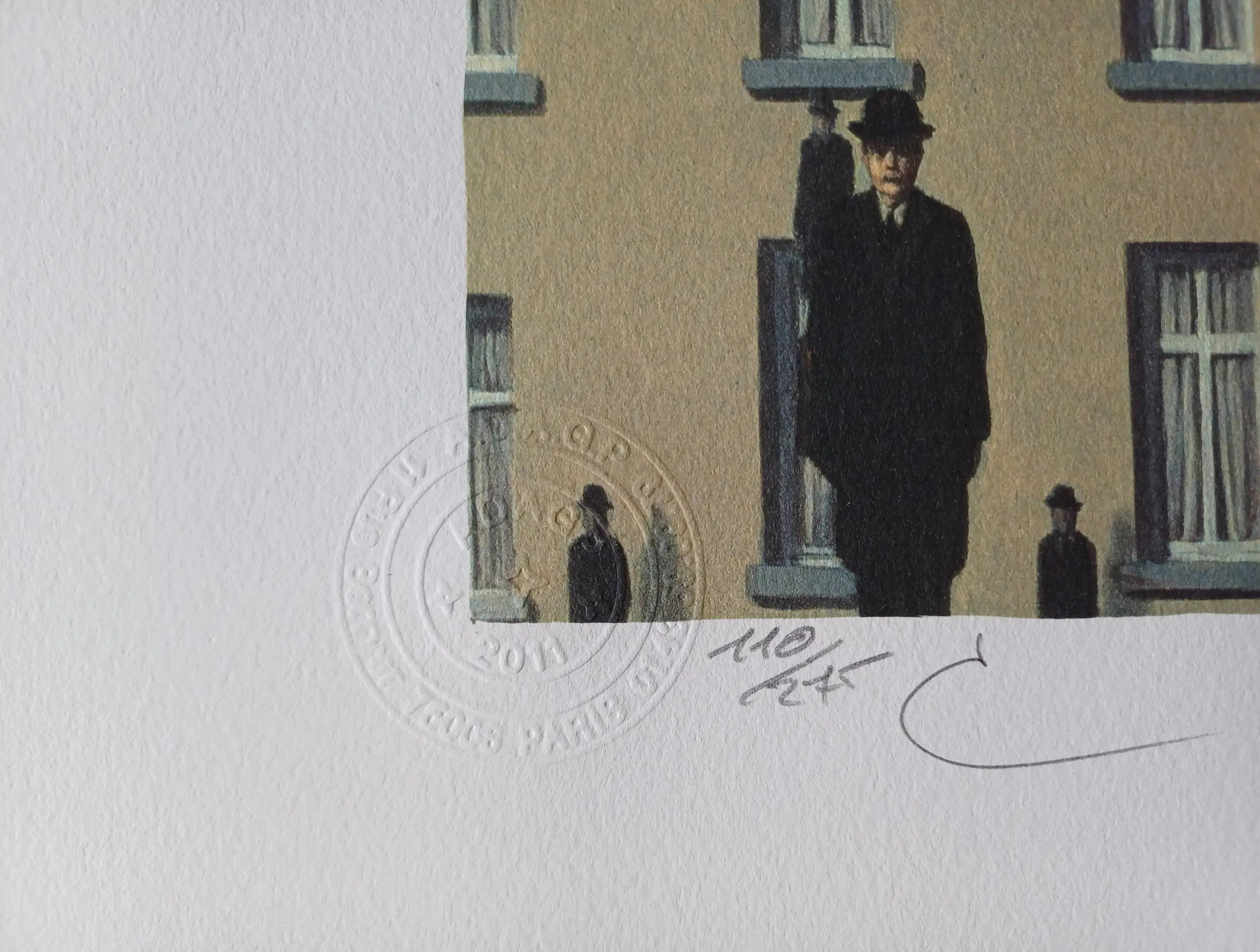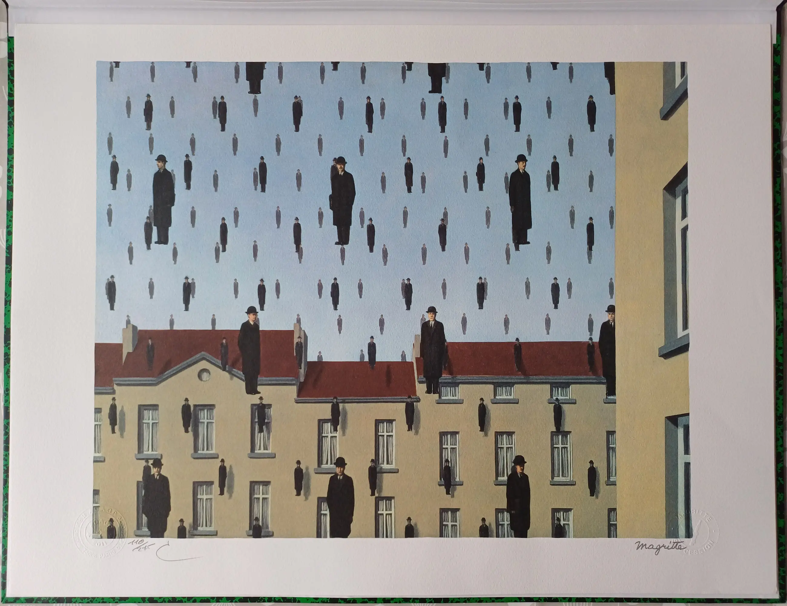 Lithografie naar het werk 'GOLCONDE'. Voorzien van de droogstempel van ADAPG en van de Succession Magritte.Alsook de paraaf van Charly Herscovici,de voorzitter van de stichting Magritte. Genummerd in potlood 110/275.