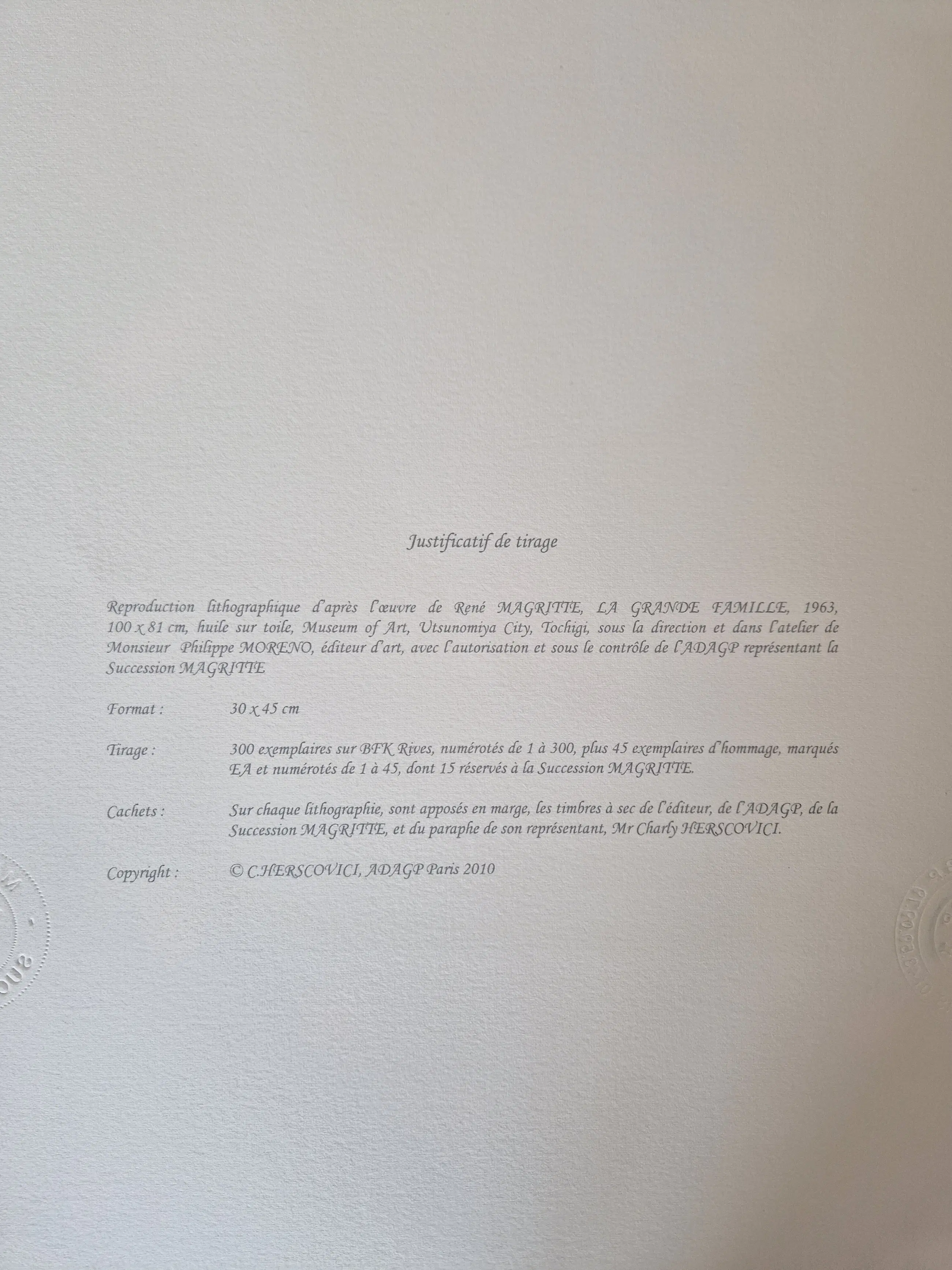 Deze lithografie werd geautoriseerd, gecontroleerd en gevalideerd door de ADAGP (Society of Authors in Graphic and Plastic Arts) en door de heer Charly Herscovici, voorzitter van de Stichting Magritte, voorzitter van het Magritte Museum en enige vertegenwoordiger van de Nalatenschap Magritte.