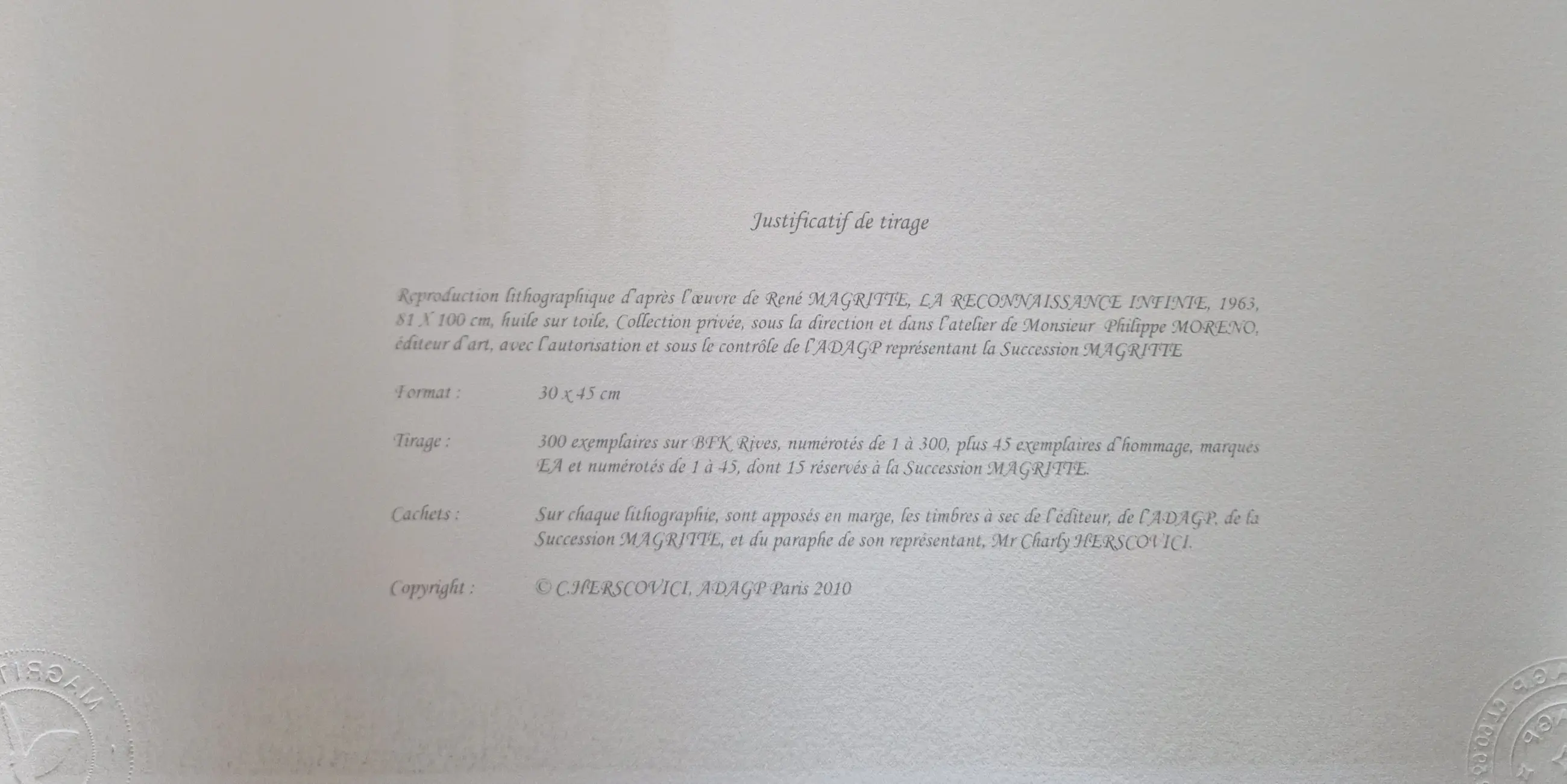 Deze lithografie werd geautoriseerd, gecontroleerd en gevalideerd door de ADAGP (Society of Authors in Graphic and Plastic Arts) en door de heer Charly Herscovici, voorzitter van de Stichting Magritte, voorzitter van het Magritte Museum en enige vertegenwoordiger van de Nalatenschap Magritte.
