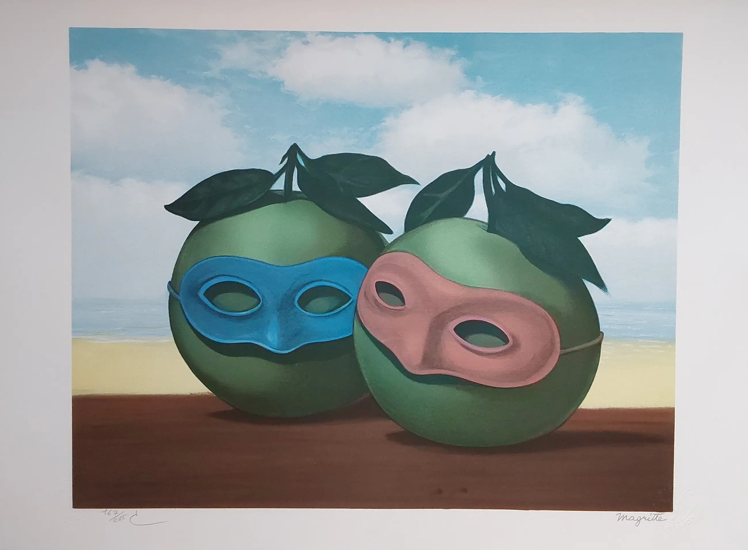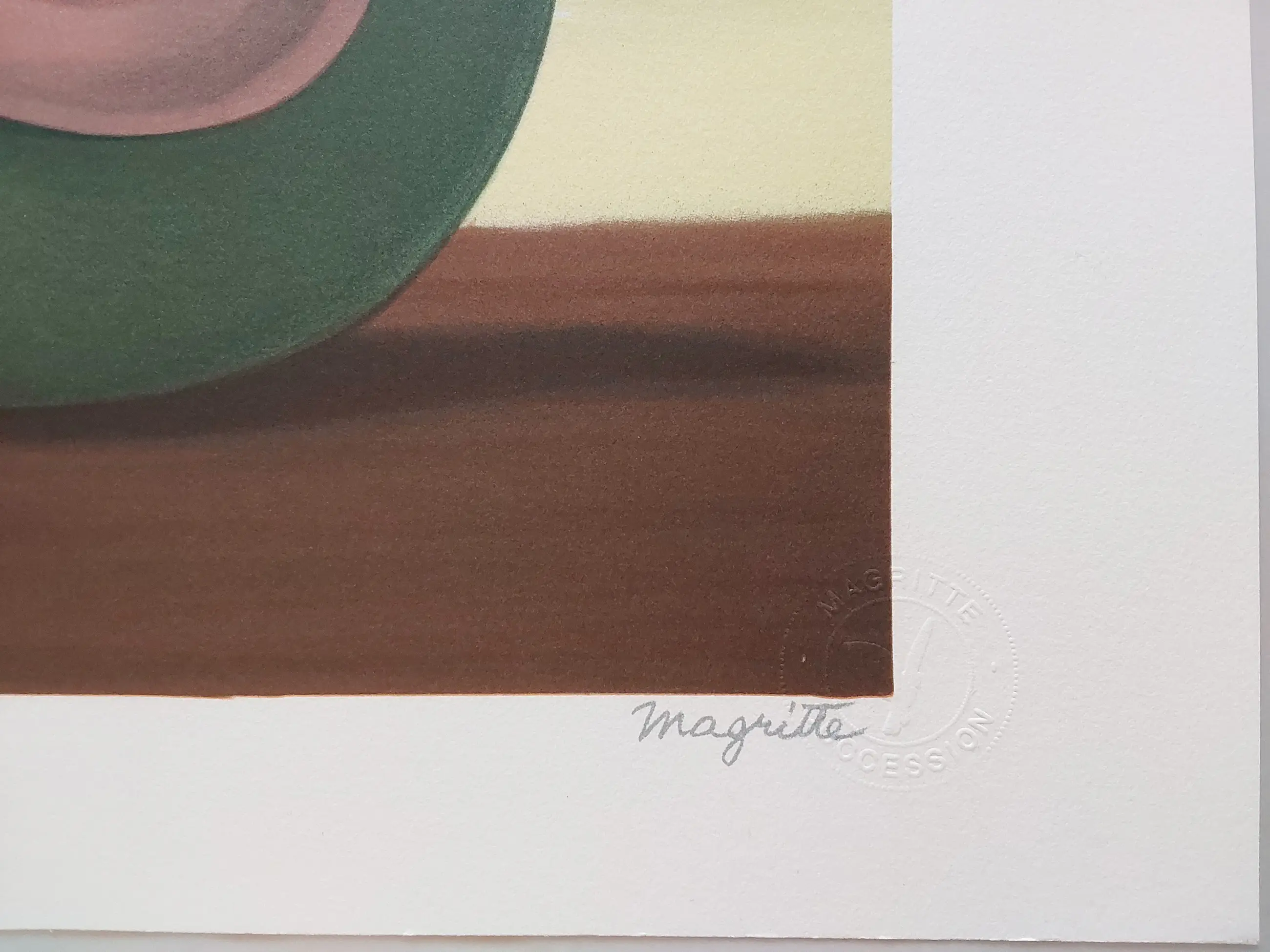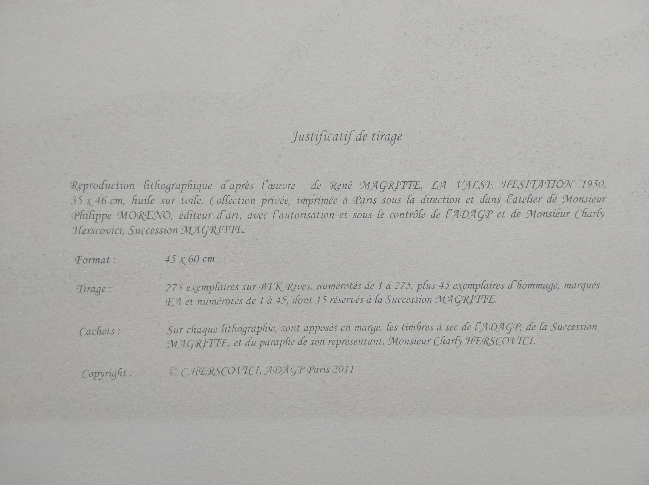 Lithografie naar het werk ’LA VALSE HESITATION ’. Voorzien van de droogstempel van ADAPG en van de Succession Magritte.Alsook de paraaf van Charly Herscovici,de voorzitter van de stichting Magritte. Genummerd in potlood 167/275.