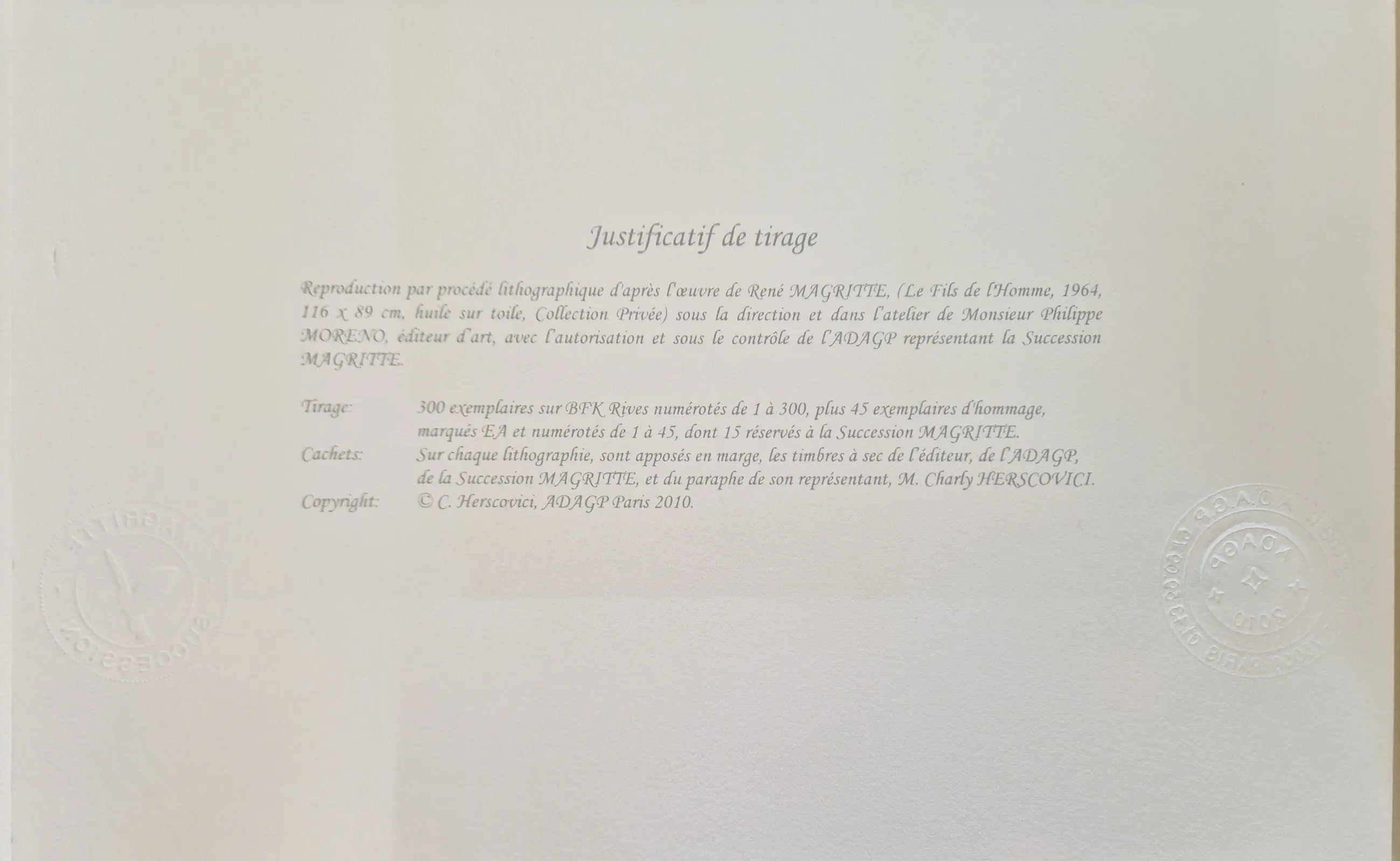Deze lithografie werd geautoriseerd, gecontroleerd en gevalideerd door de ADAGP (Society of Authors in Graphic and Plastic Arts) en door de heer Charly Herscovici, voorzitter van de Stichting Magritte, voorzitter van het Magritte Museum en enige vertegenwoordiger van de Nalatenschap Magritte.