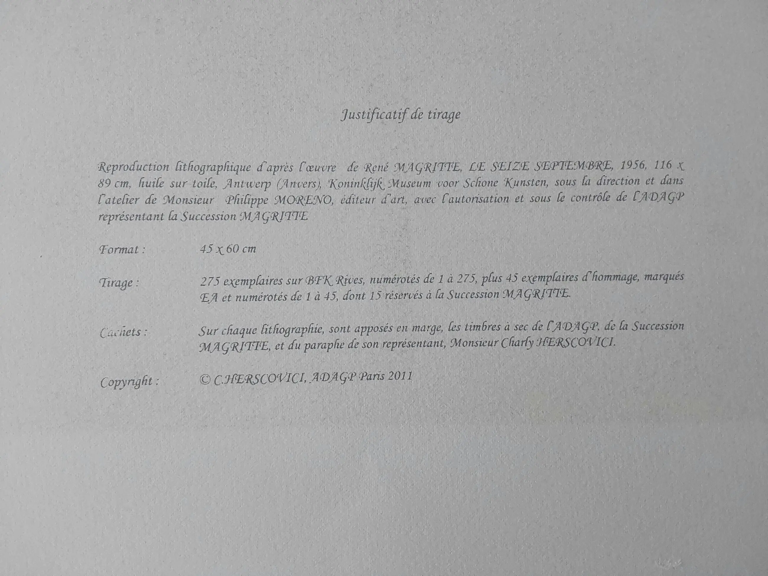Lithografie naar het werk ´Le Seize Septembre´. Voorzien van de droogstempel van ADAPG en van de Succession Magritte.Alsook de paraaf van Charly Herscovici, de voorzitter van de stichting Magritte. Genummerd in potlood 17/275.
