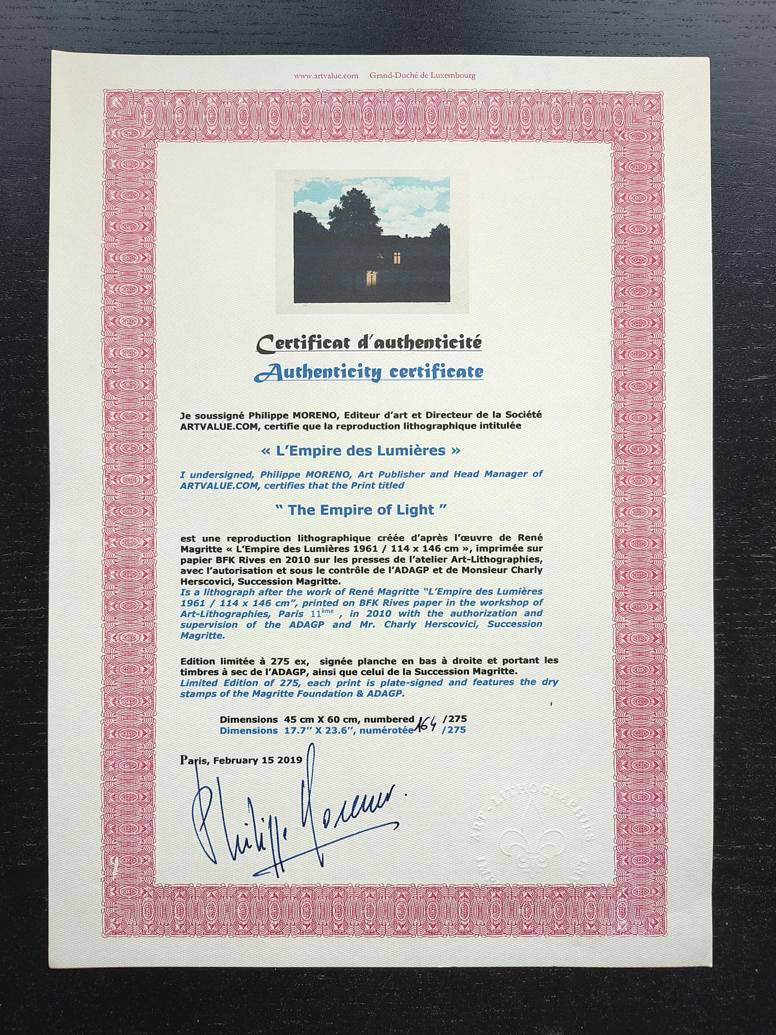 De lithografie draagt de droge stempels van de Stichting Magritte & ADAGP en is met potlood gecontrasigneerd door de heer Charly Herscovici, voorzitter van de Stichting Magritte, voorzitter van het Magritte Museum en uniek vertegenwoordiger van het Magritte-erfgoed. Op de achterzijde van de lithografie is een proefdruk afgedrukt, die de authenticiteit garandeert.