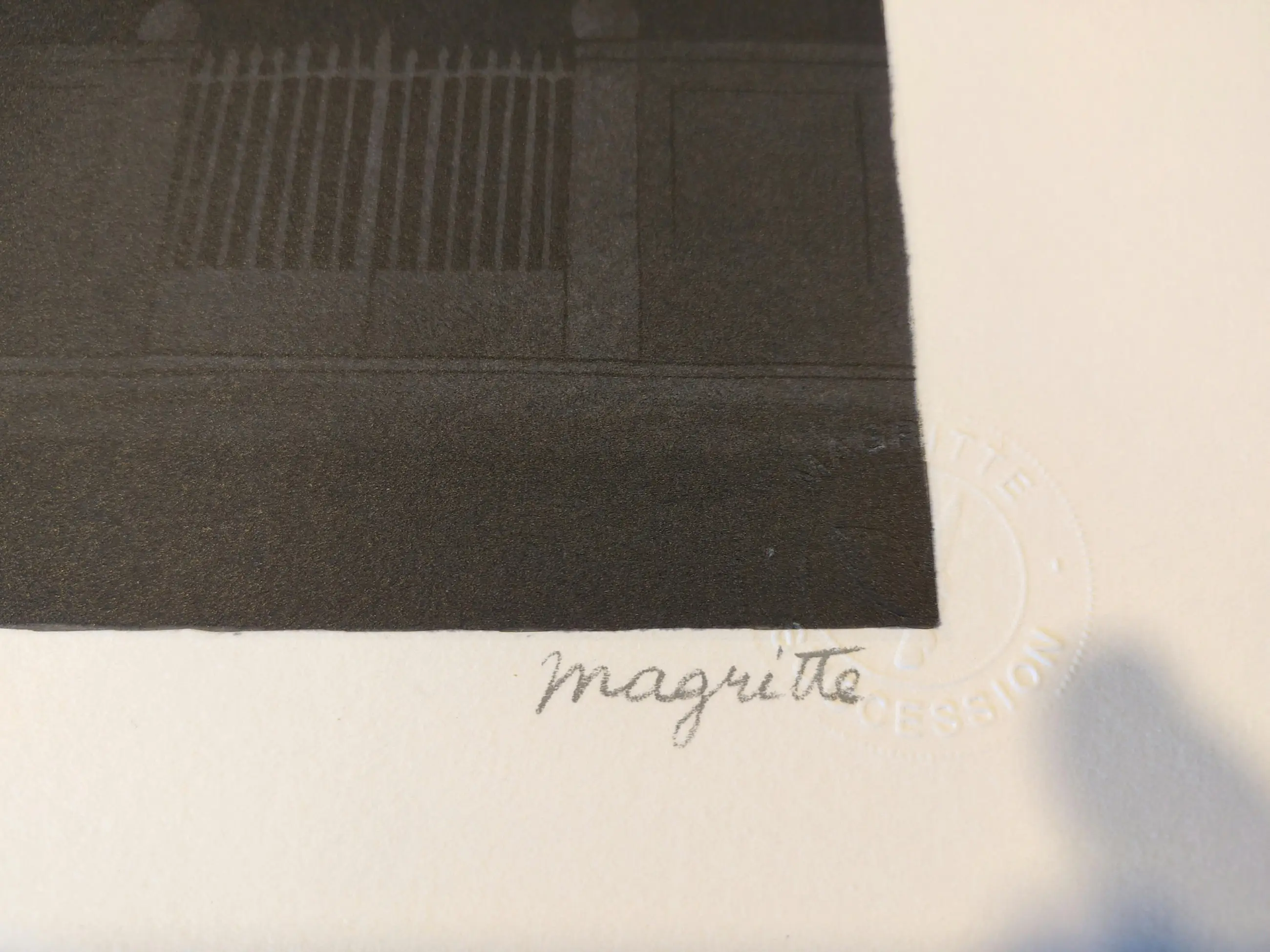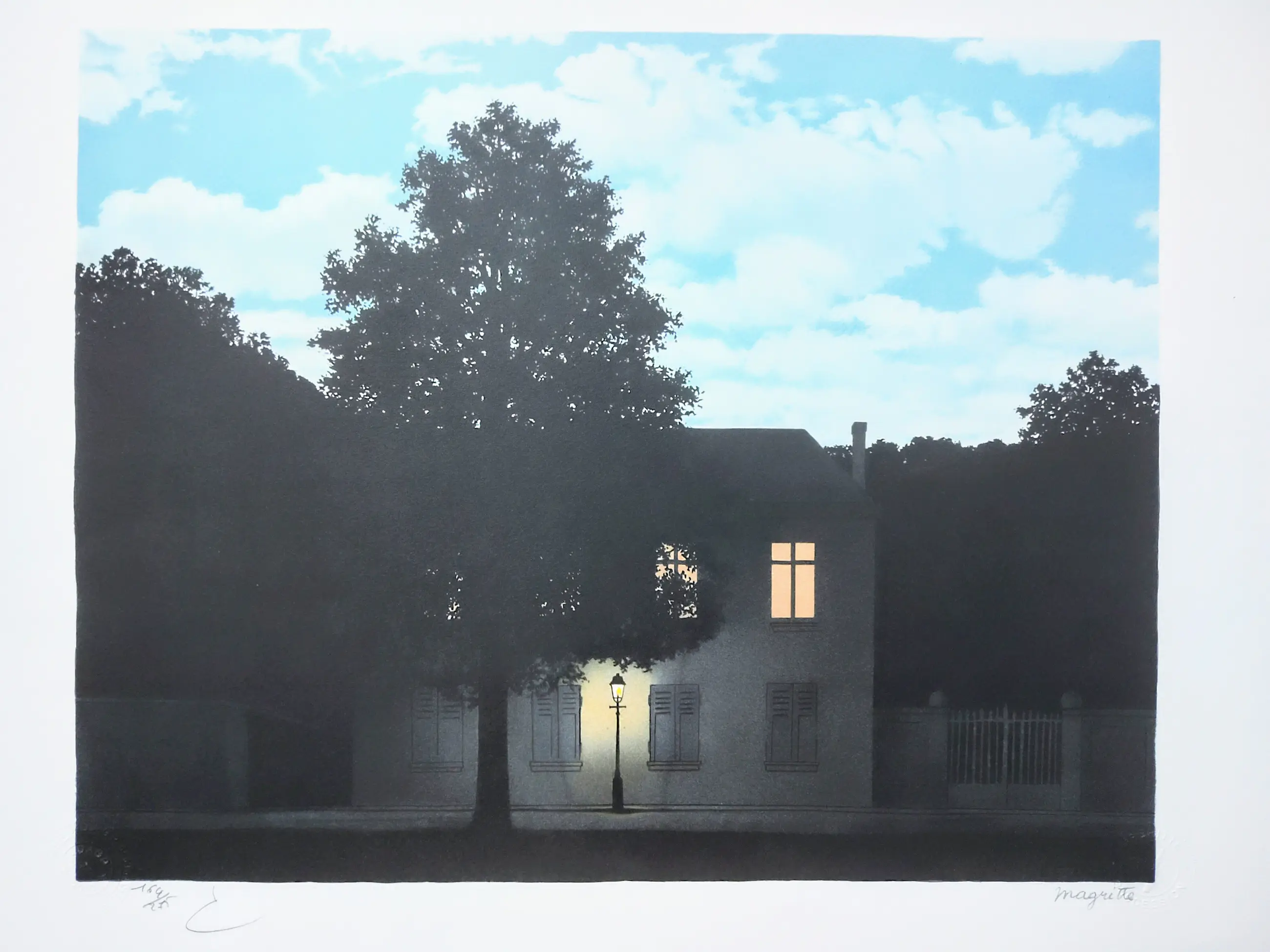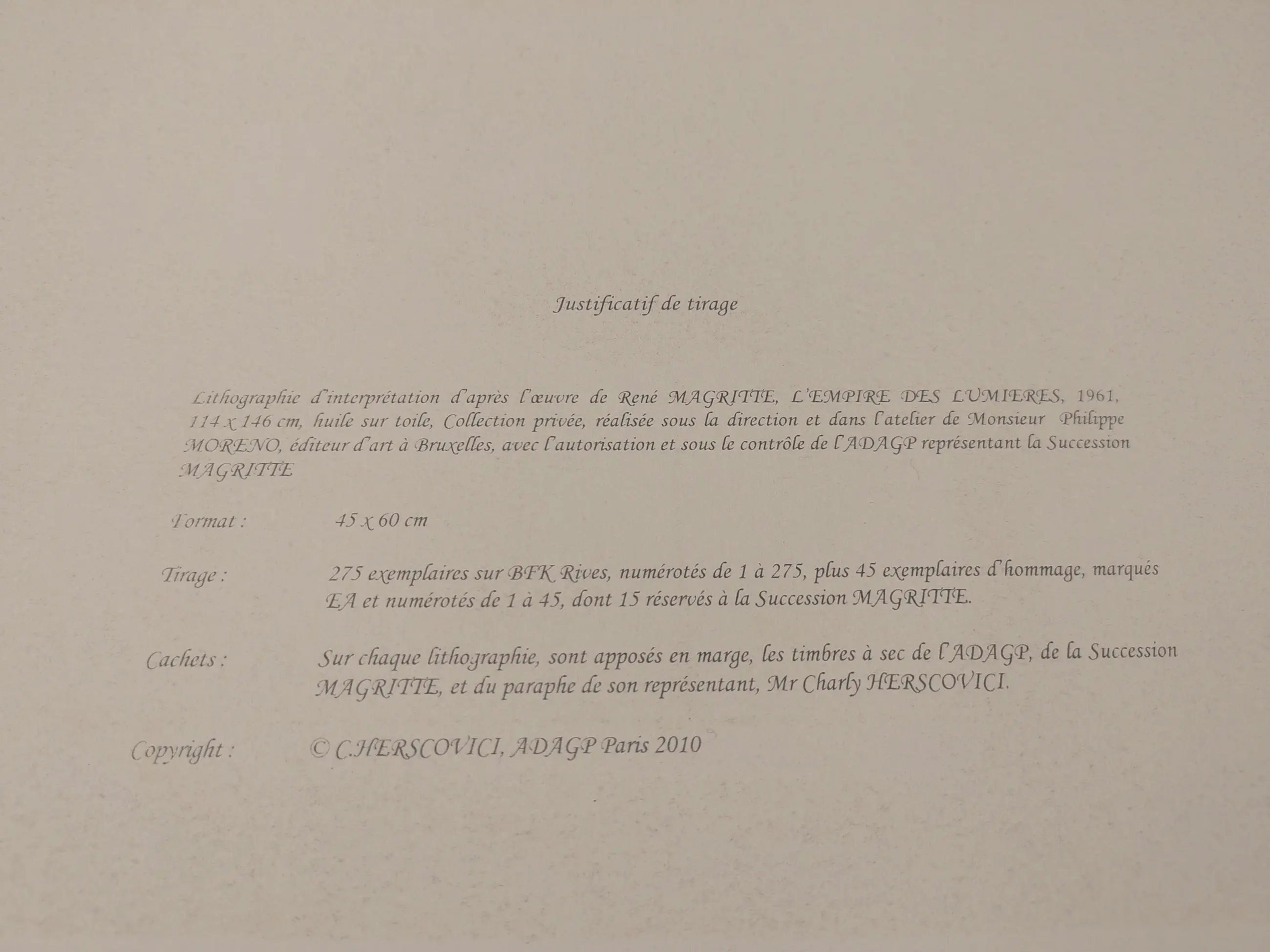 The lithograph bears the dry stamps of the Magritte Foundation & ADAGP and is countersigned in pencil by Mr. Charly Herscovici, chairman of the Magritte Foundation, president of the Magritte Museum, and unique representative of the Magritte estate. A proof is printed on the back of the lithograph, guaranteeing its authenticity.