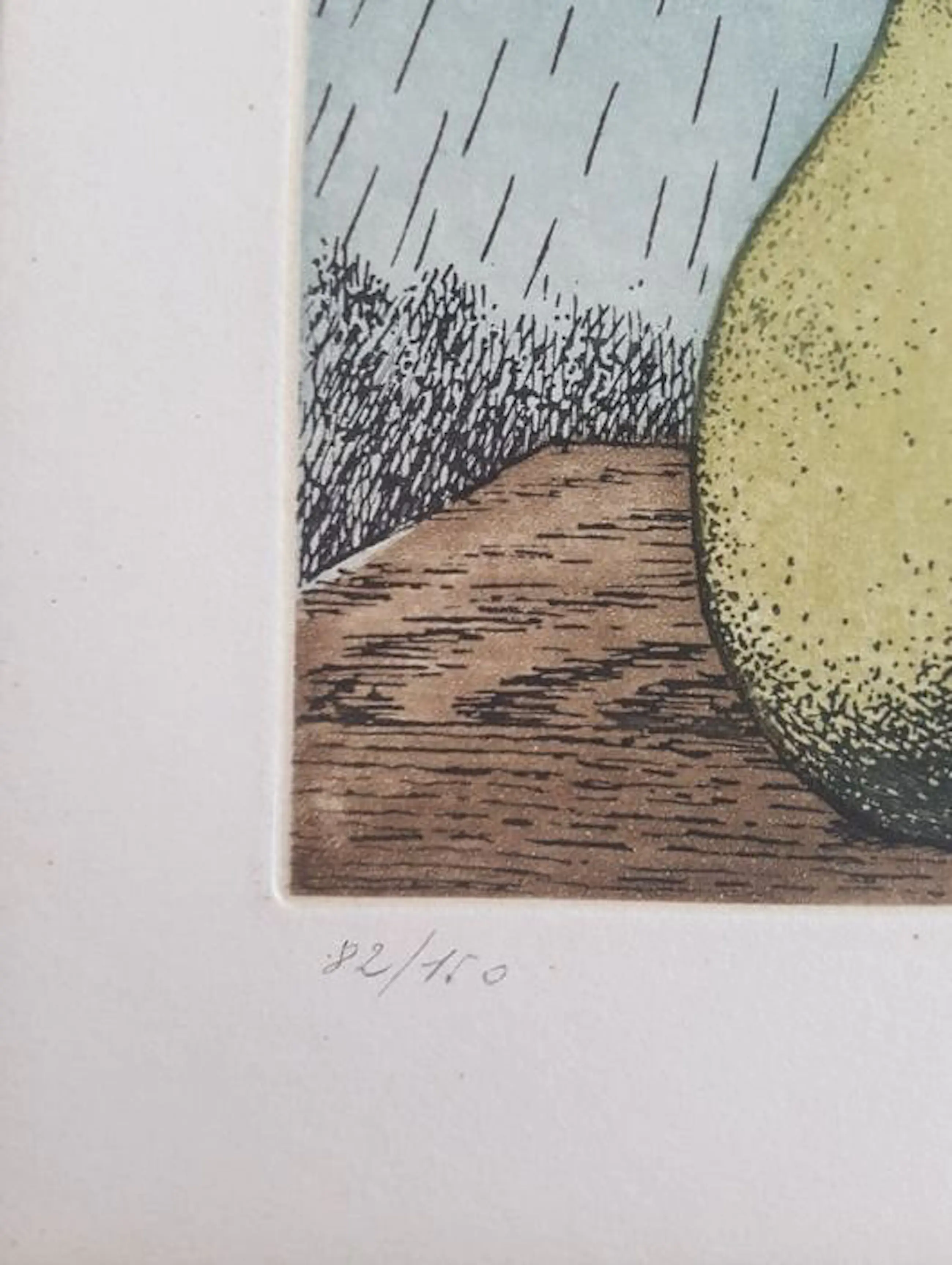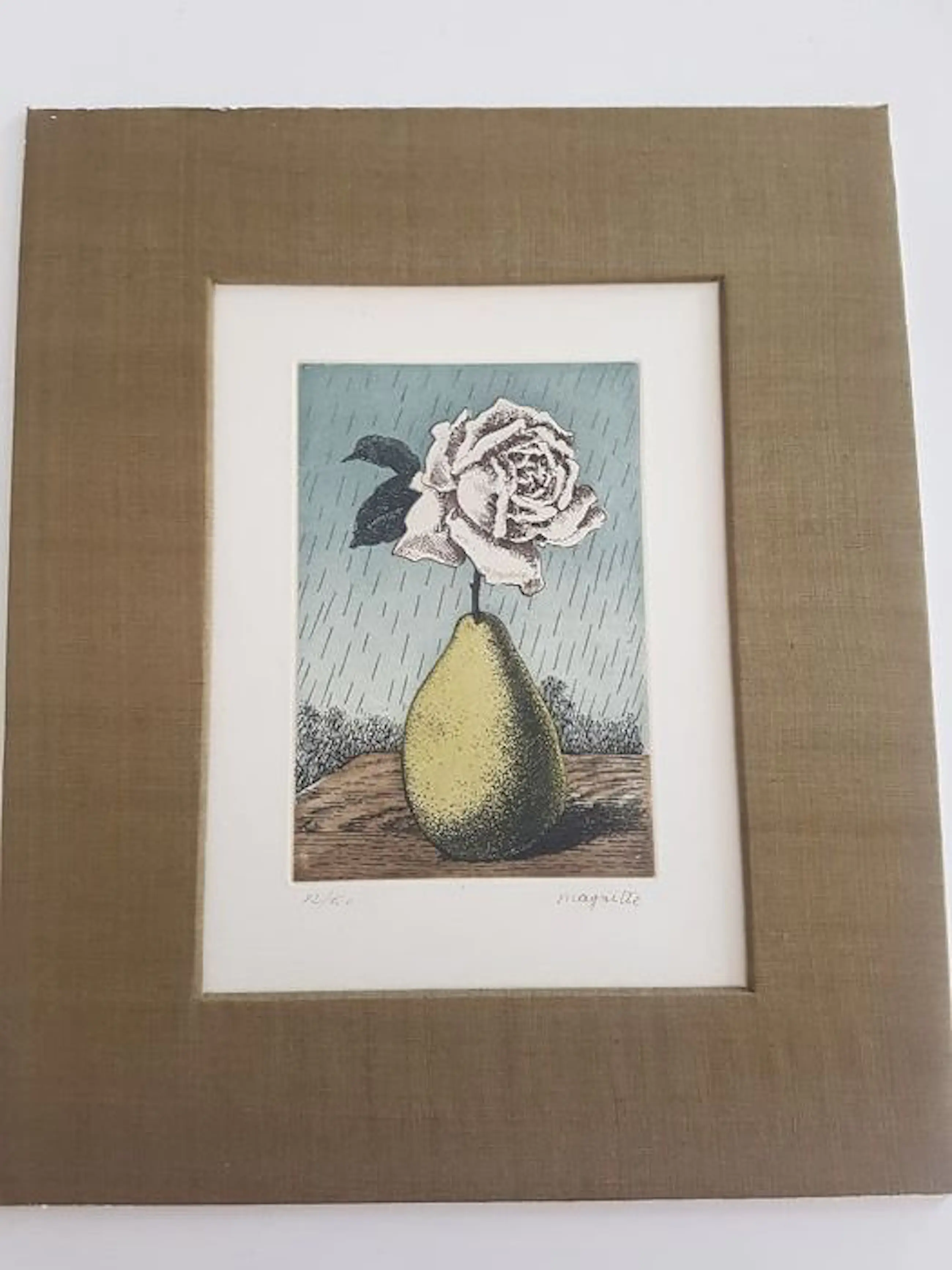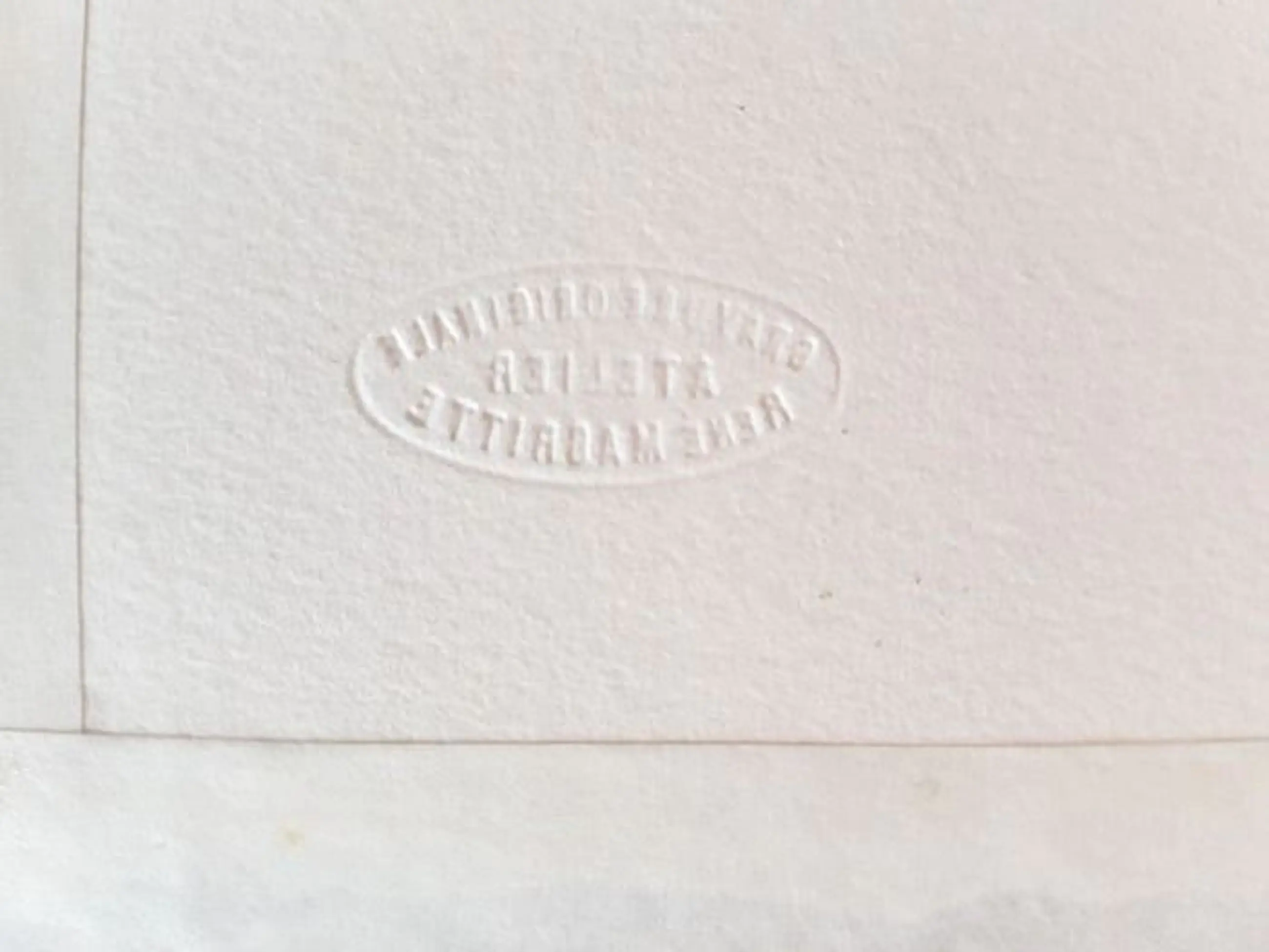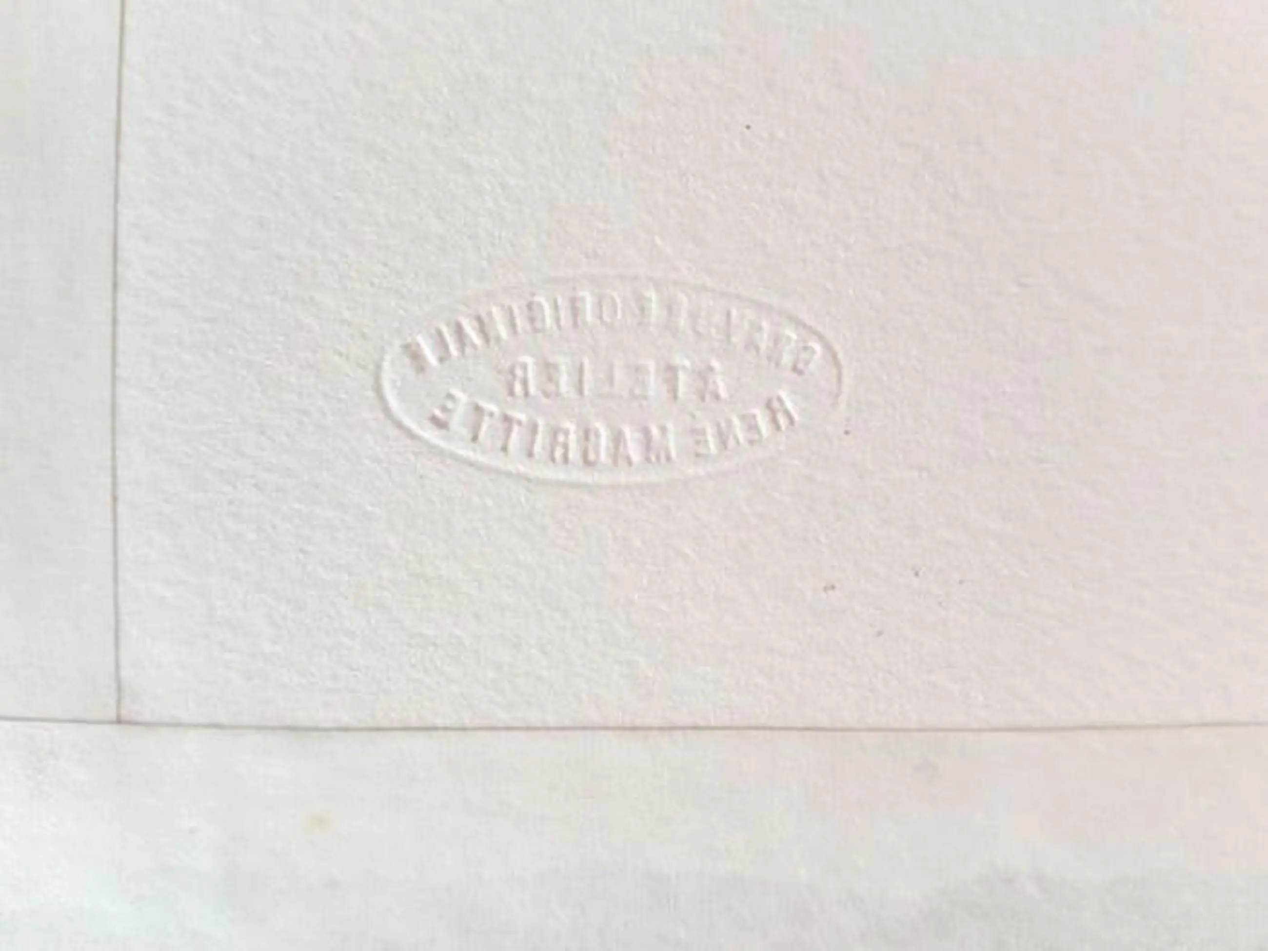 Met de gestempelde handtekening van Magritte in de rechterbenedenhoek en blindstempel op de achterzijde 'Gravure Originale Atelier René Magritte'