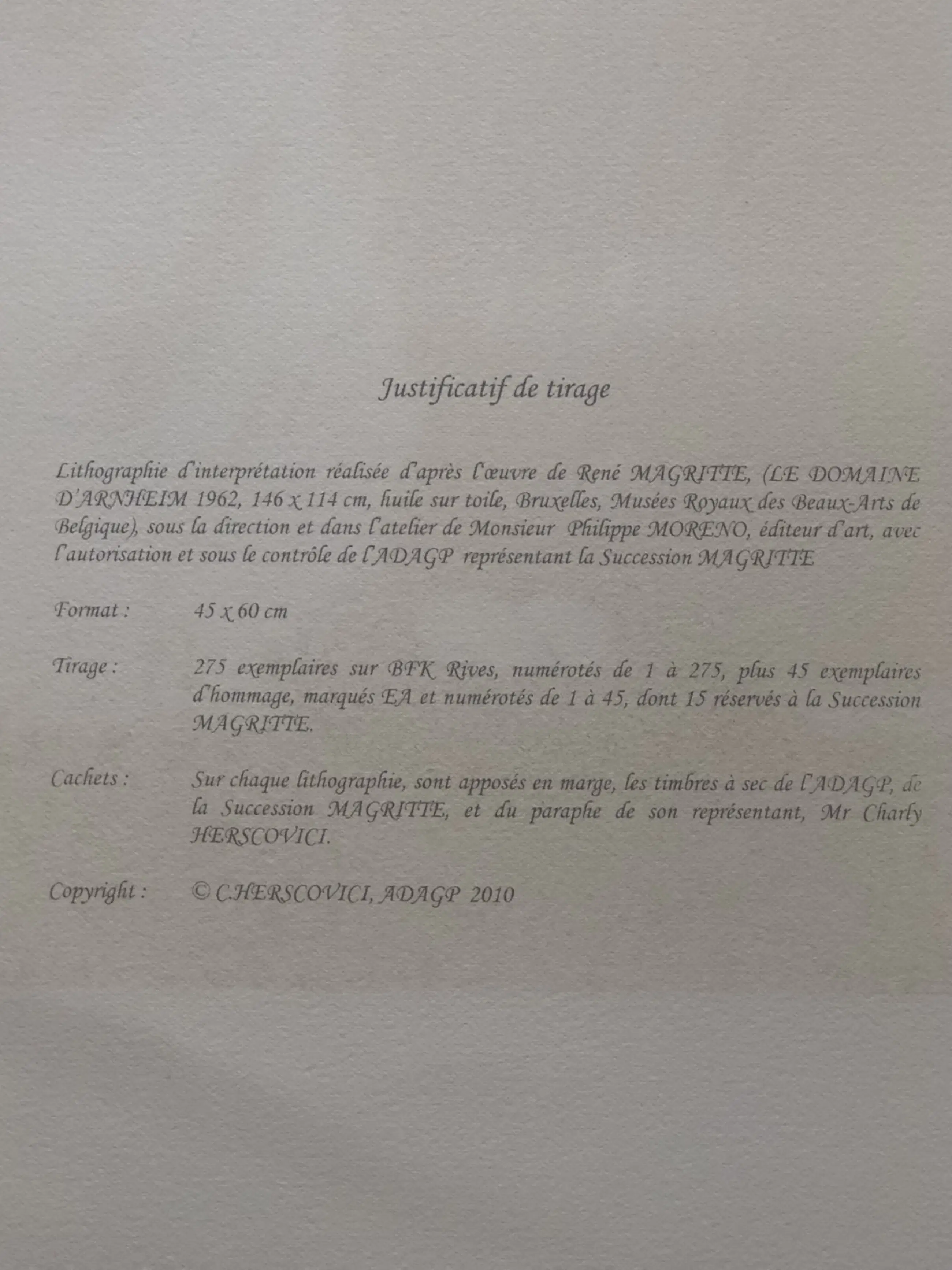 Lithografie genummerd 178/275 in potlood en in druk gesigneerd "Magritte" rechtsonder. Voorzien van 2 droogstempels (ADAGP en van de Succession Magritte) en geparafeerd in potlood door Charly Herscovice (vertegenwoordiger Magritte foundation). Naar een werk van René Magritte uit 1929. Inclusief certificaat verso.