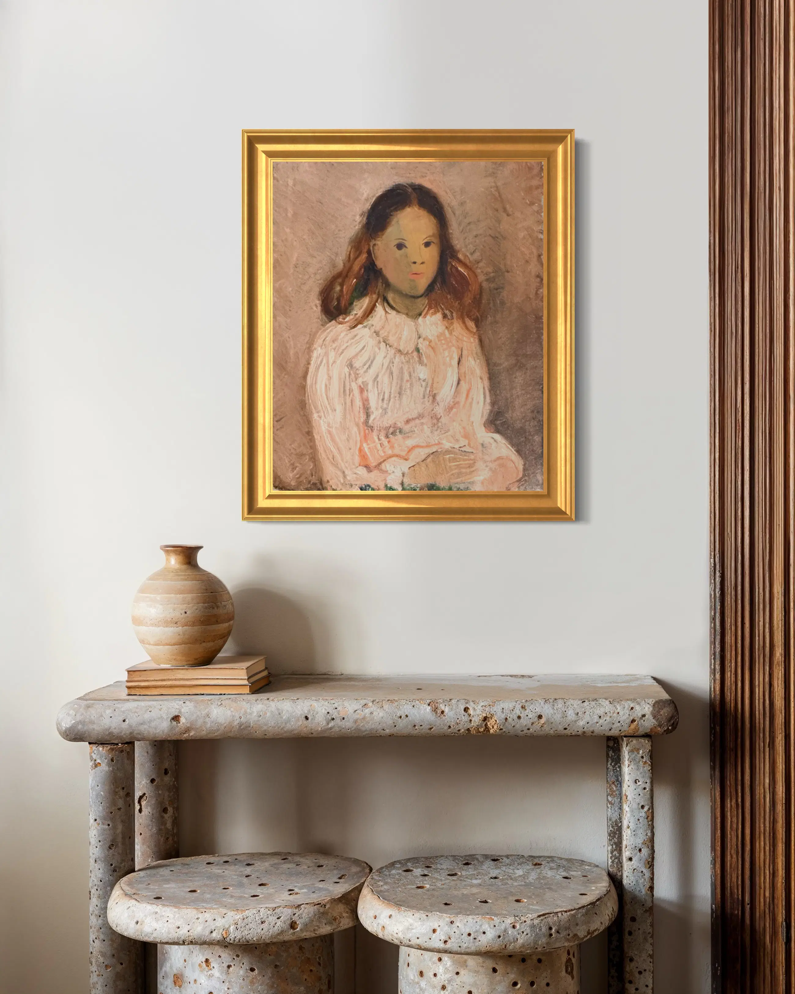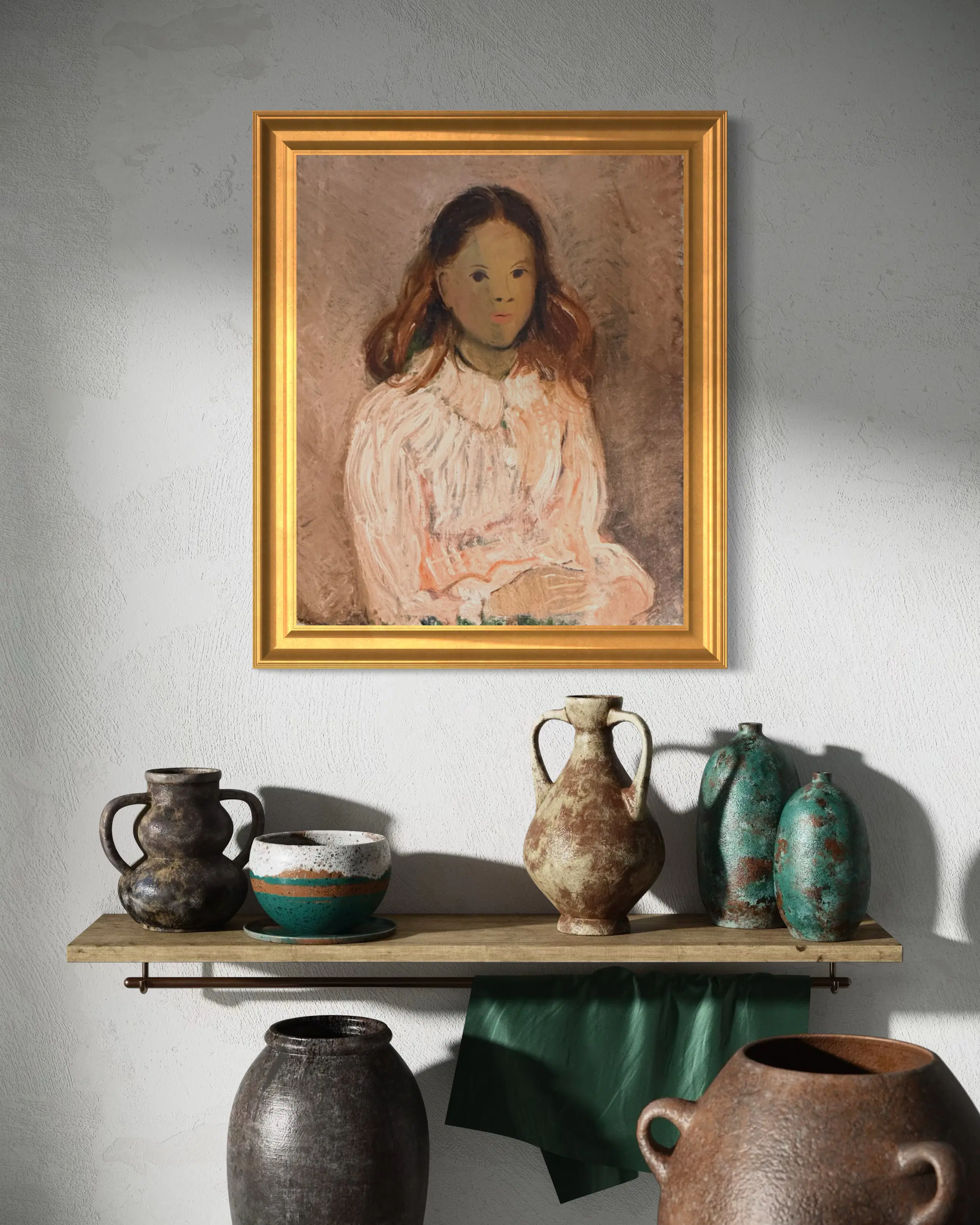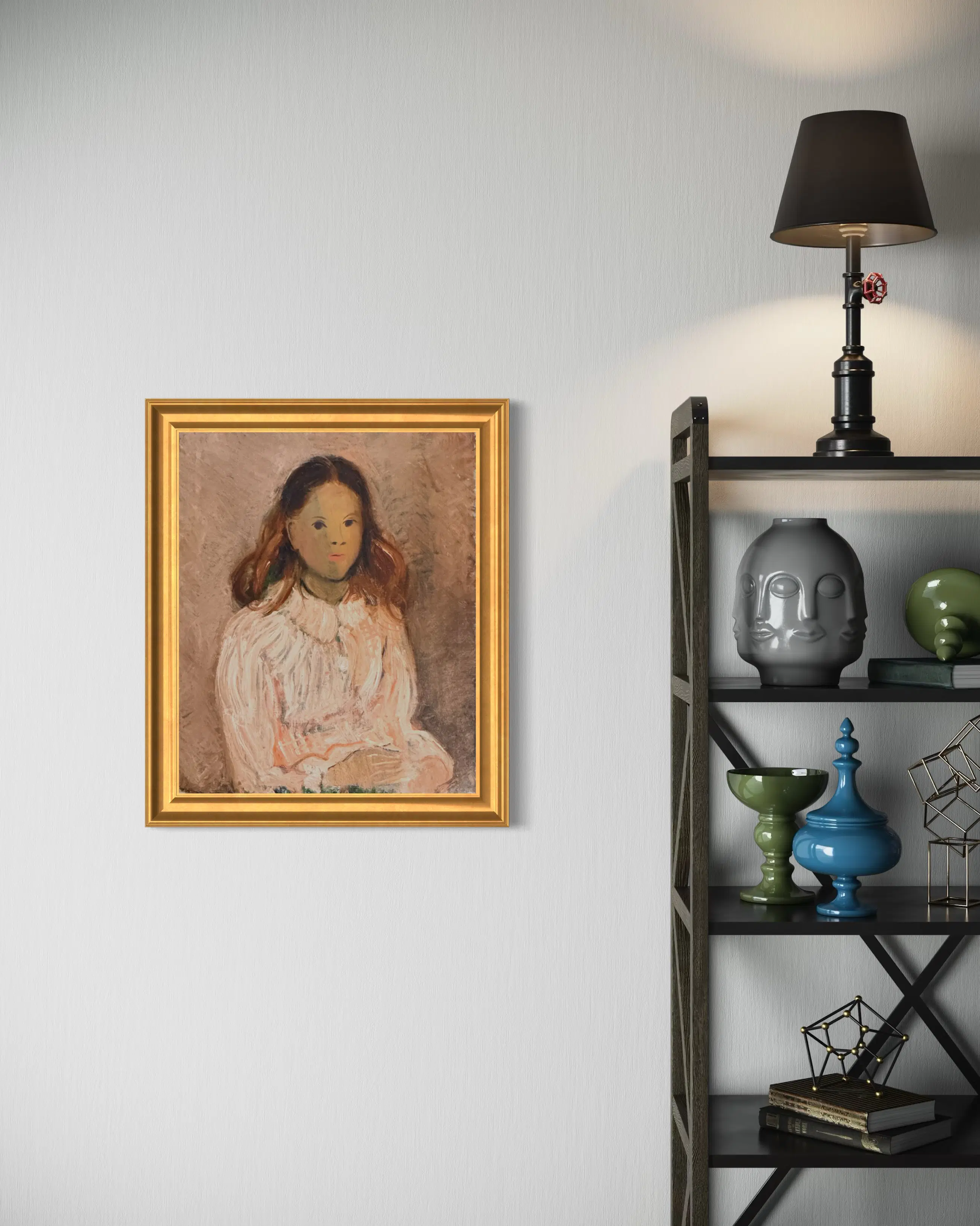 Dit portret van een jong meisje, geschilderd rond 1940, illustreert René Mels' meest gevoelige figuratieve periode, gekenmerkt door een zoektocht naar evenwicht tussen formele strengheid en picturale emotie. De kunstenaar gebruikt een subtiel palet van roze, oker en bruin, waarbij het licht uit de verf zelf lijkt te komen.