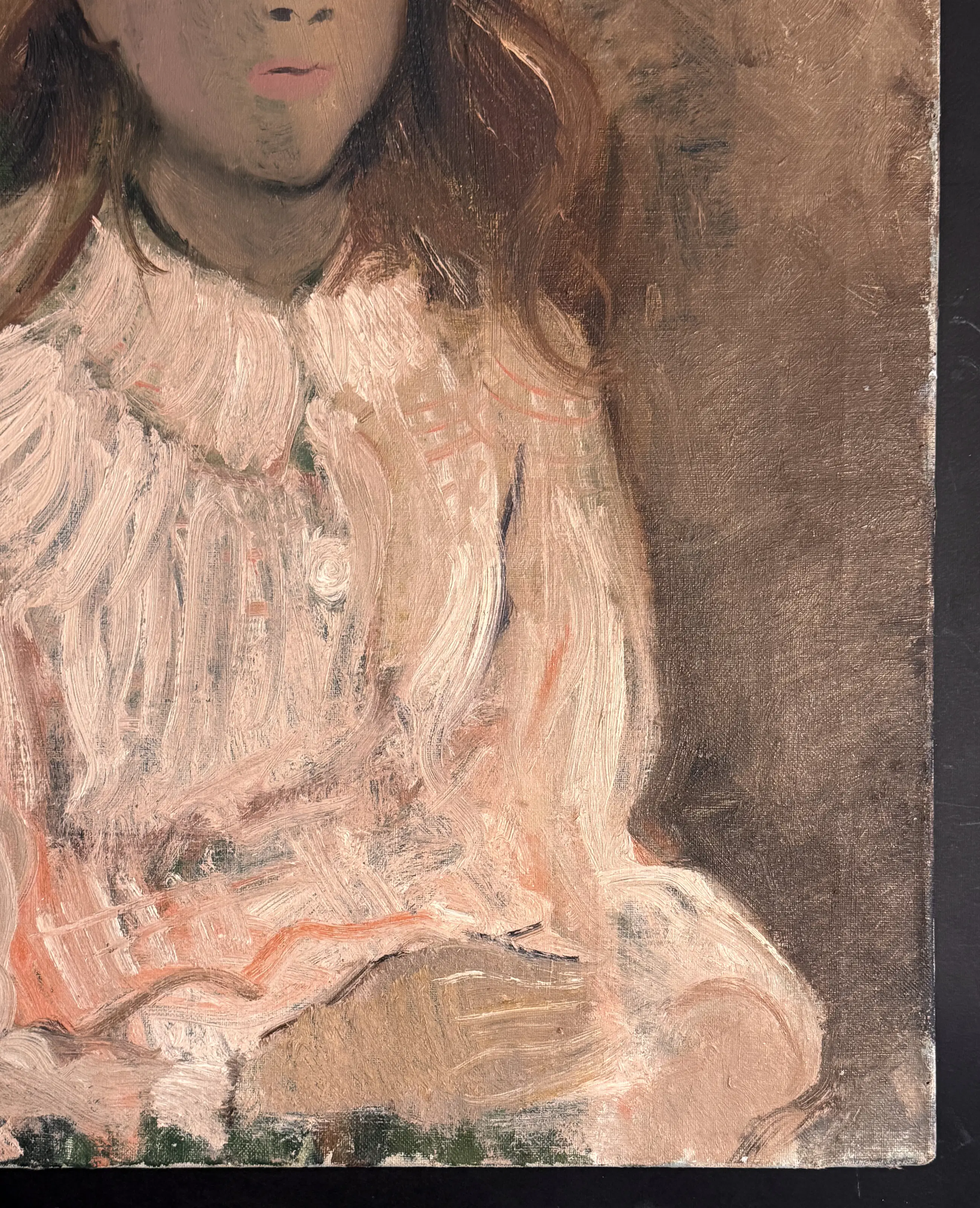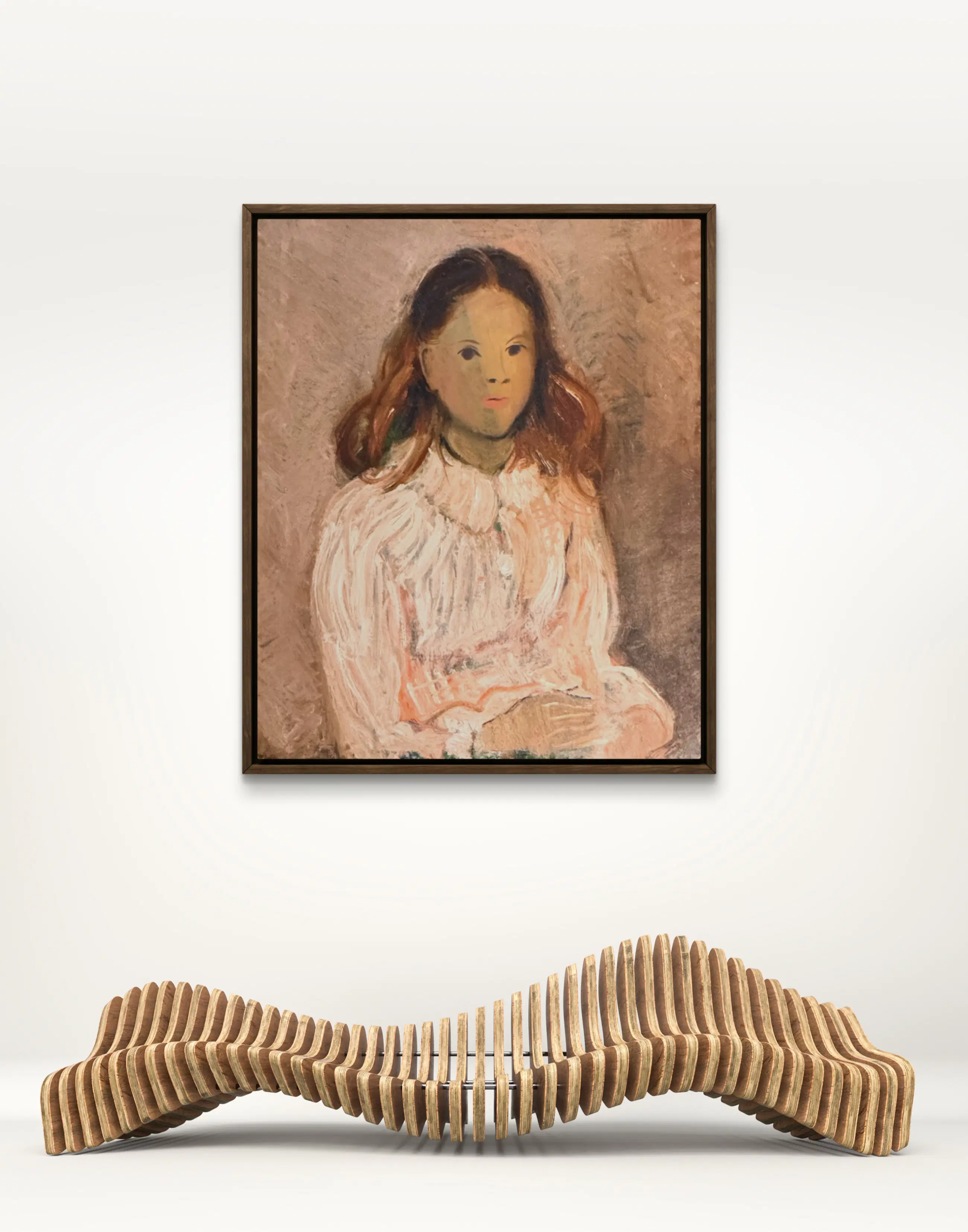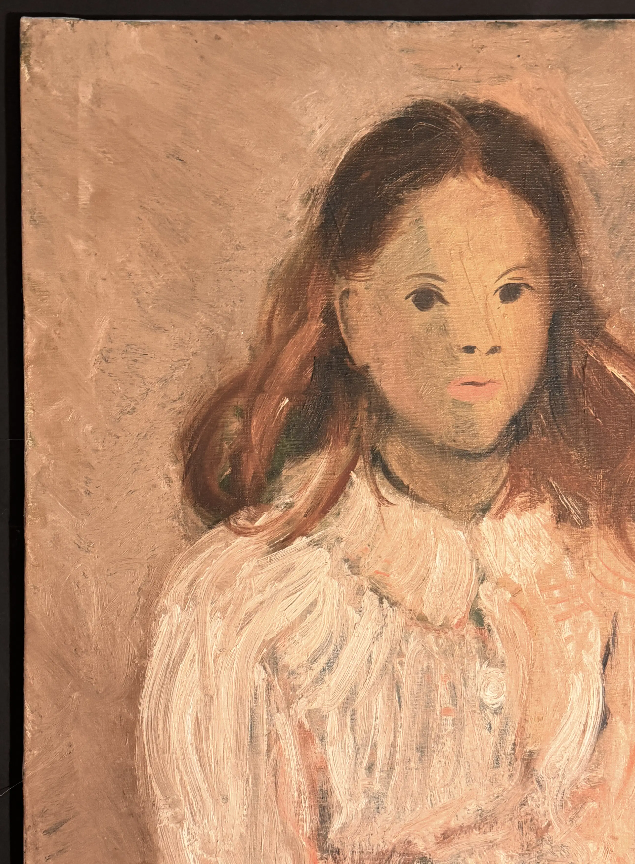 Dit portret van een jong meisje, geschilderd rond 1940, illustreert René Mels' meest gevoelige figuratieve periode, gekenmerkt door een zoektocht naar evenwicht tussen formele strengheid en picturale emotie. De kunstenaar gebruikt een subtiel palet van roze, oker en bruin, waarbij het licht uit de verf zelf lijkt te komen.