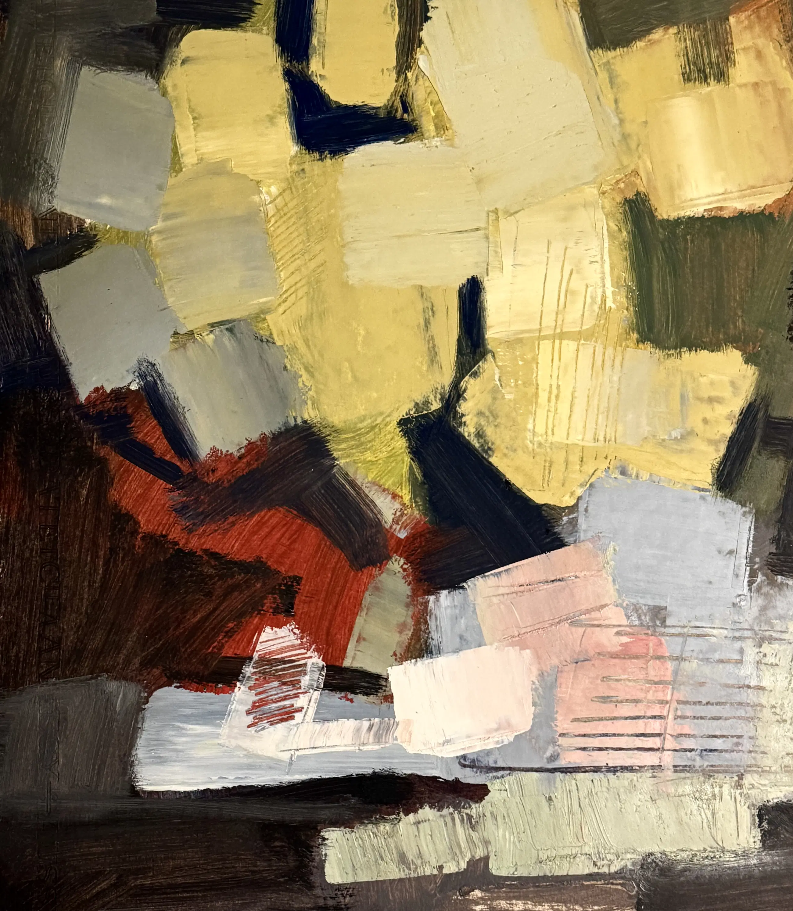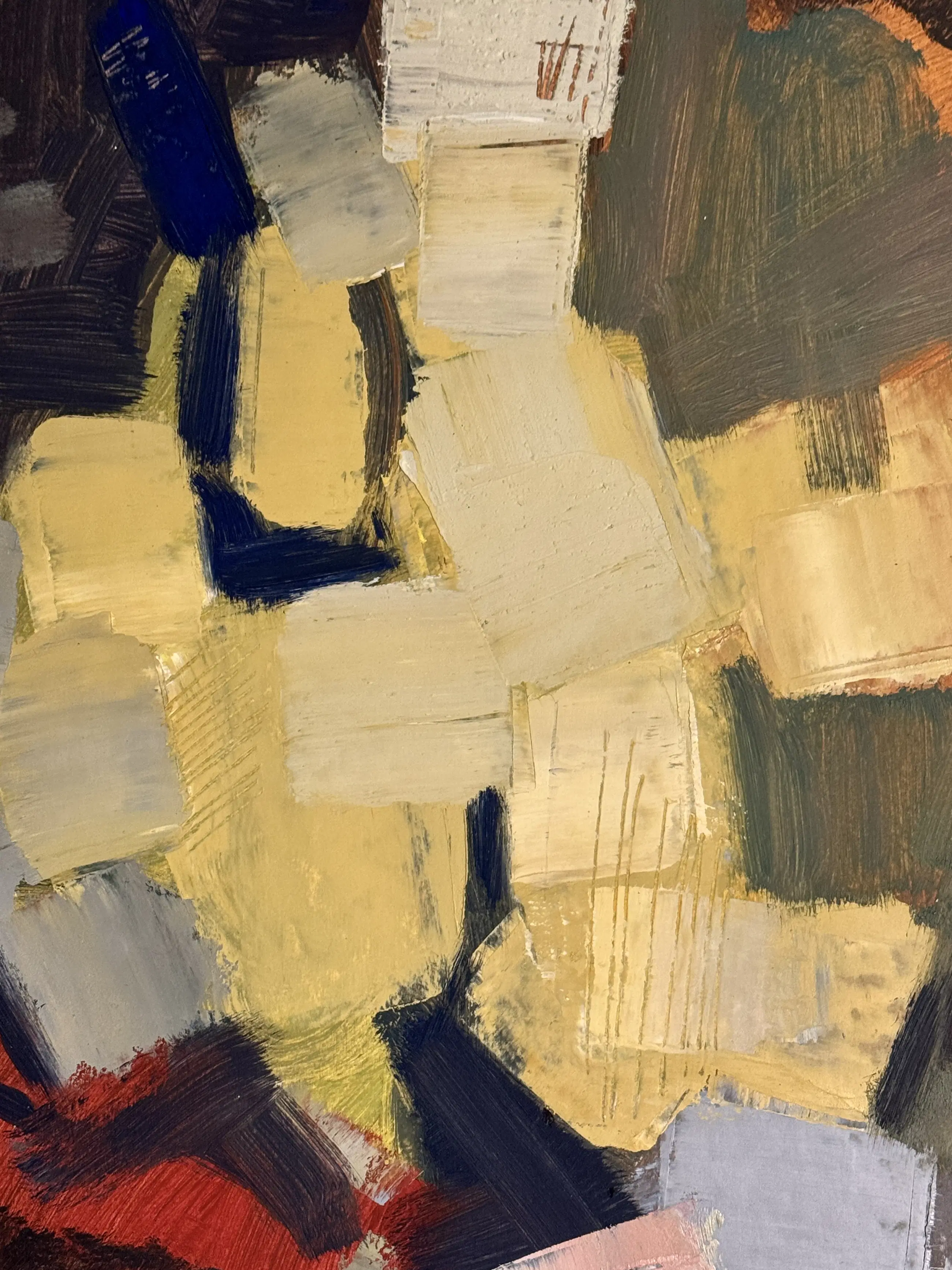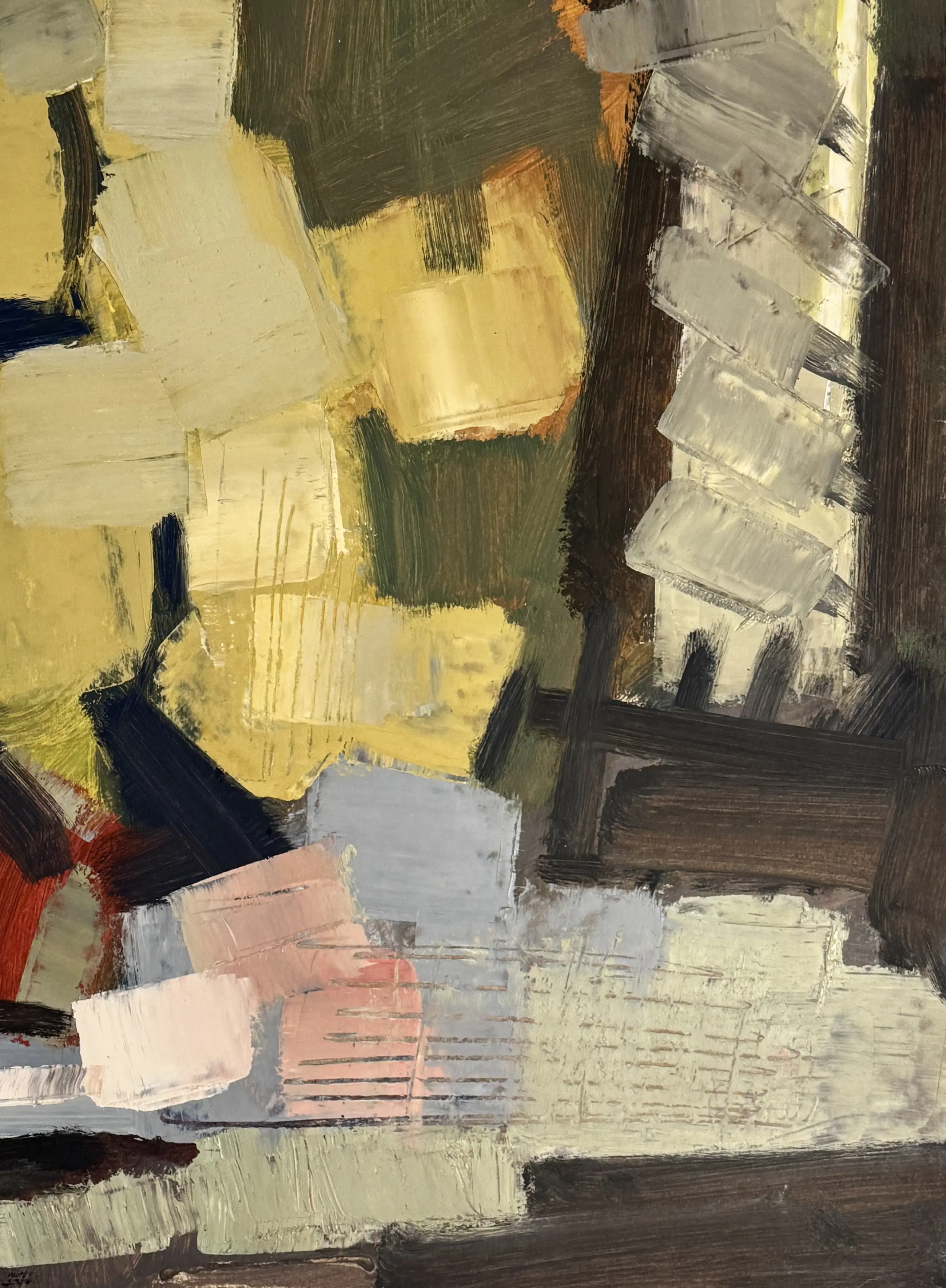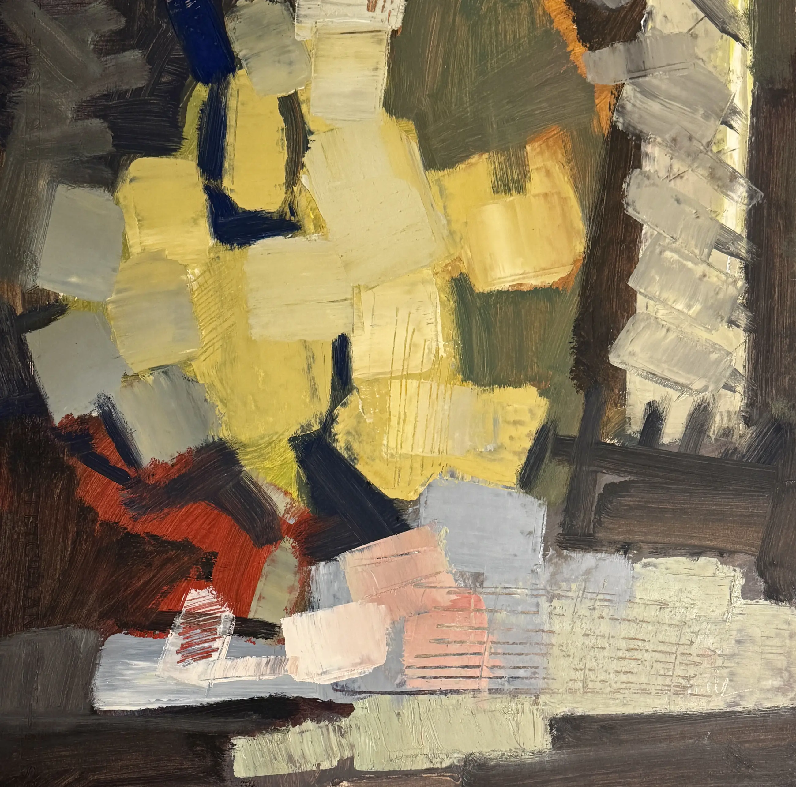 De compositie, gestructureerd maar toch vrij, onthult een harmonieuze spanning tussen strengheid en spontaniteit. De kleurvlakken – gedomineerd door heldere gele tinten, diepe bruine kleuren en blauwgrijze tinten – spelen een subtiel spel van contrasten en transparanties met elkaar. De energieke en royale penseelstreken verlenen het geheel een bijna architectonische levendigheid, doordrenkt met een diepe gevoeligheid.