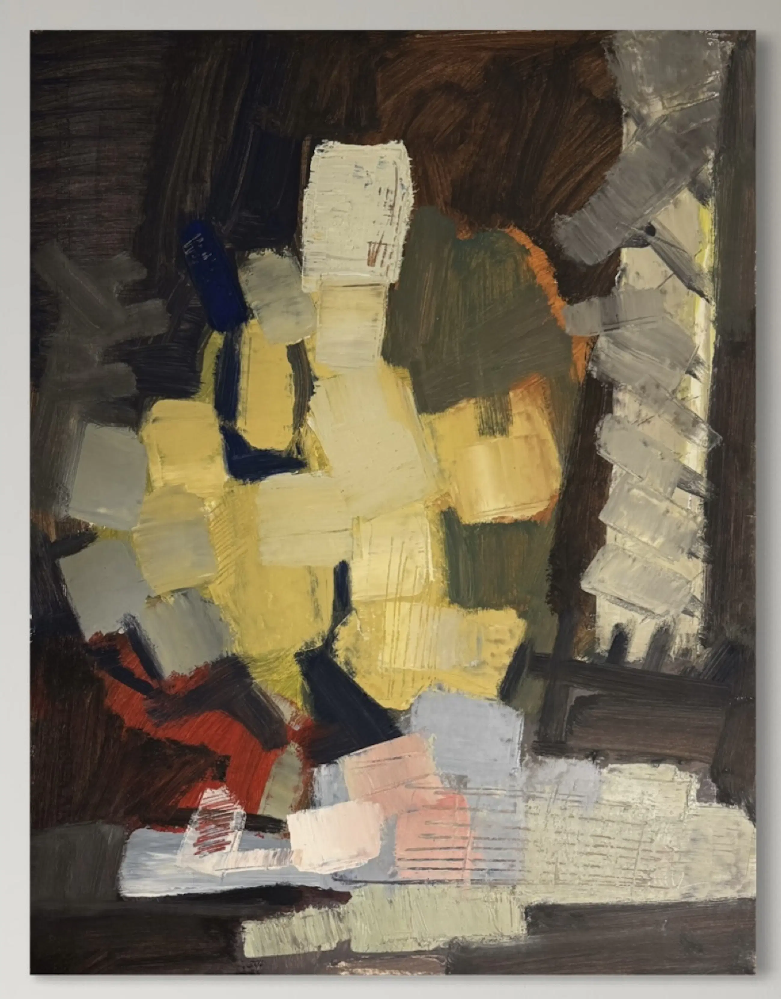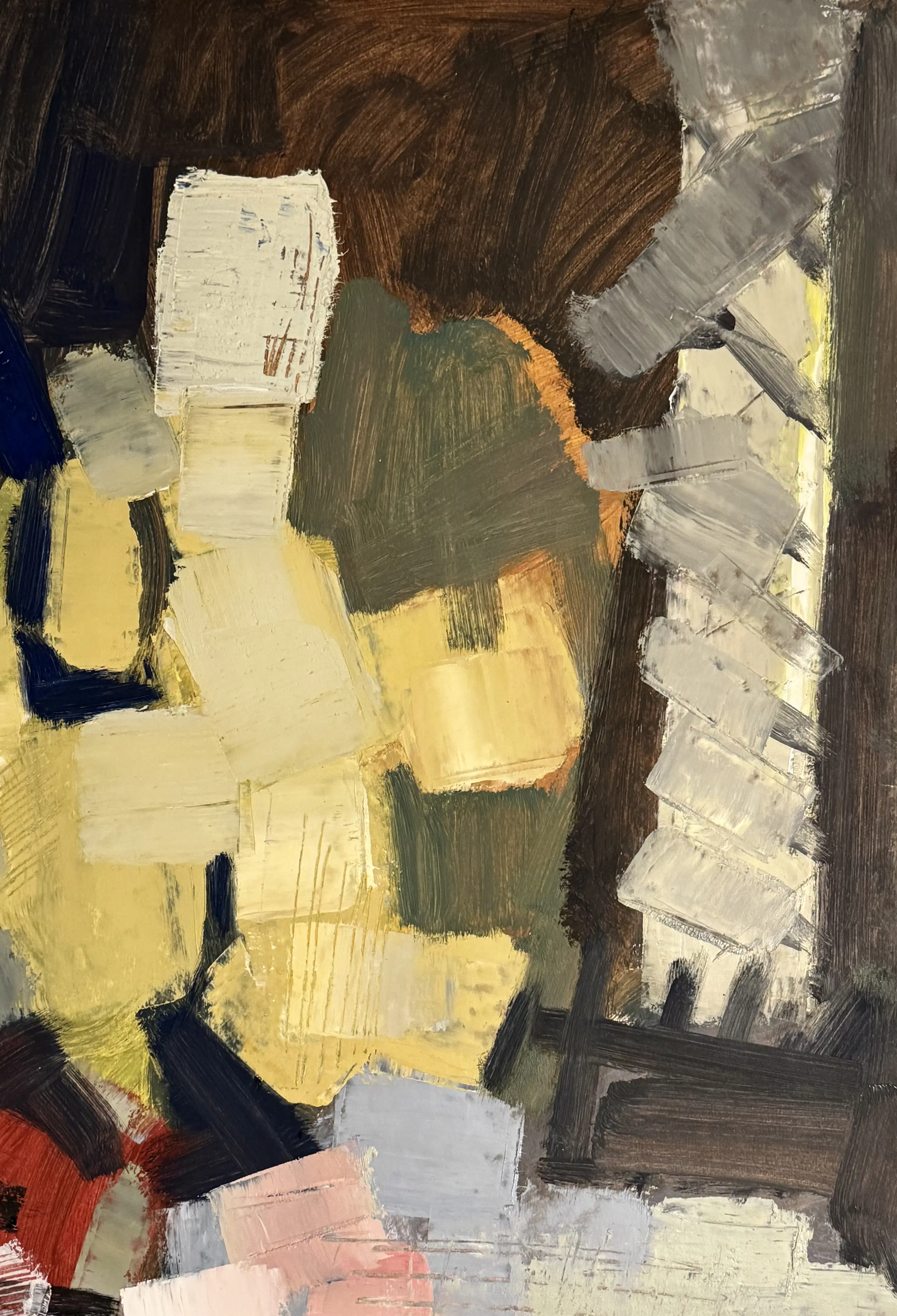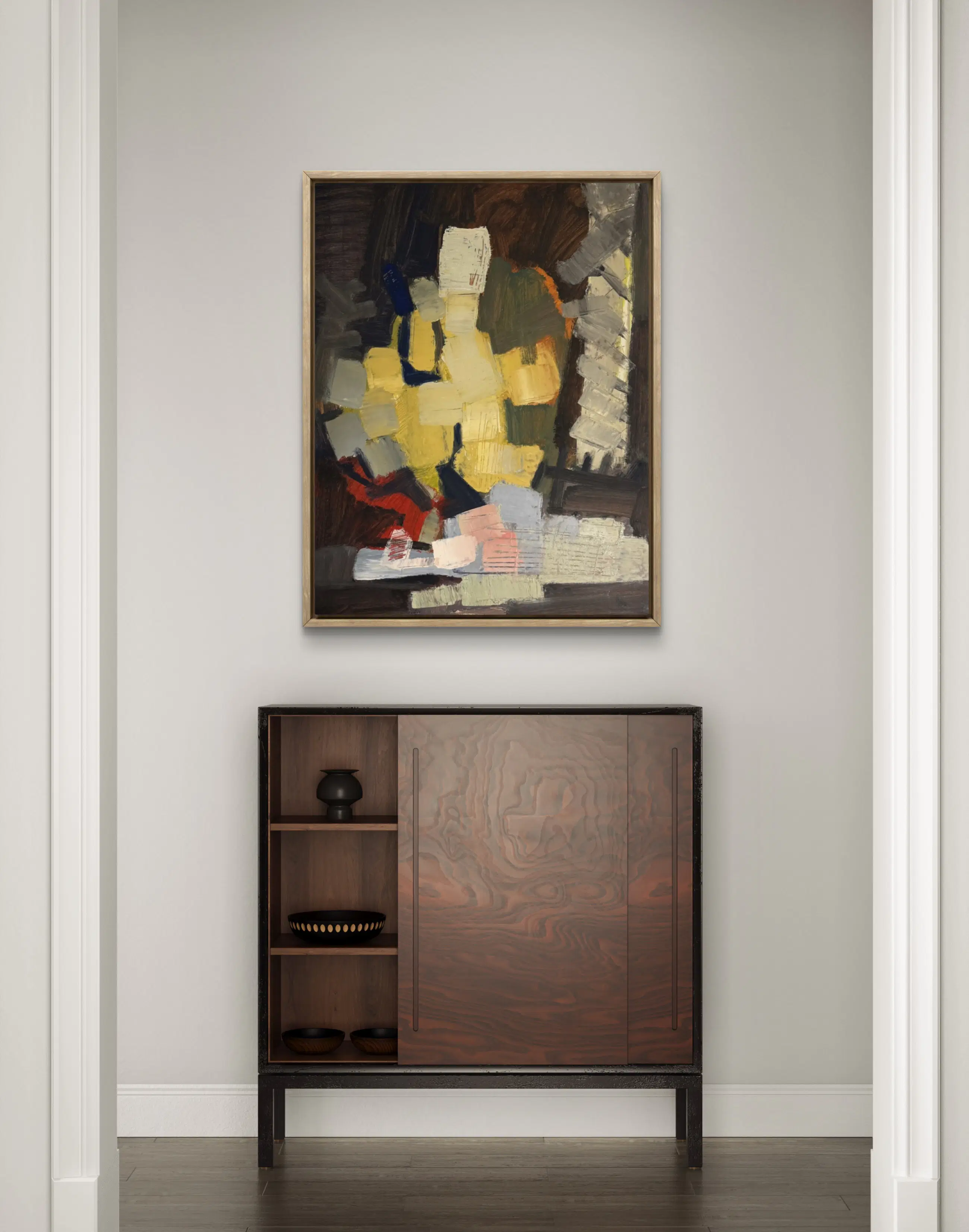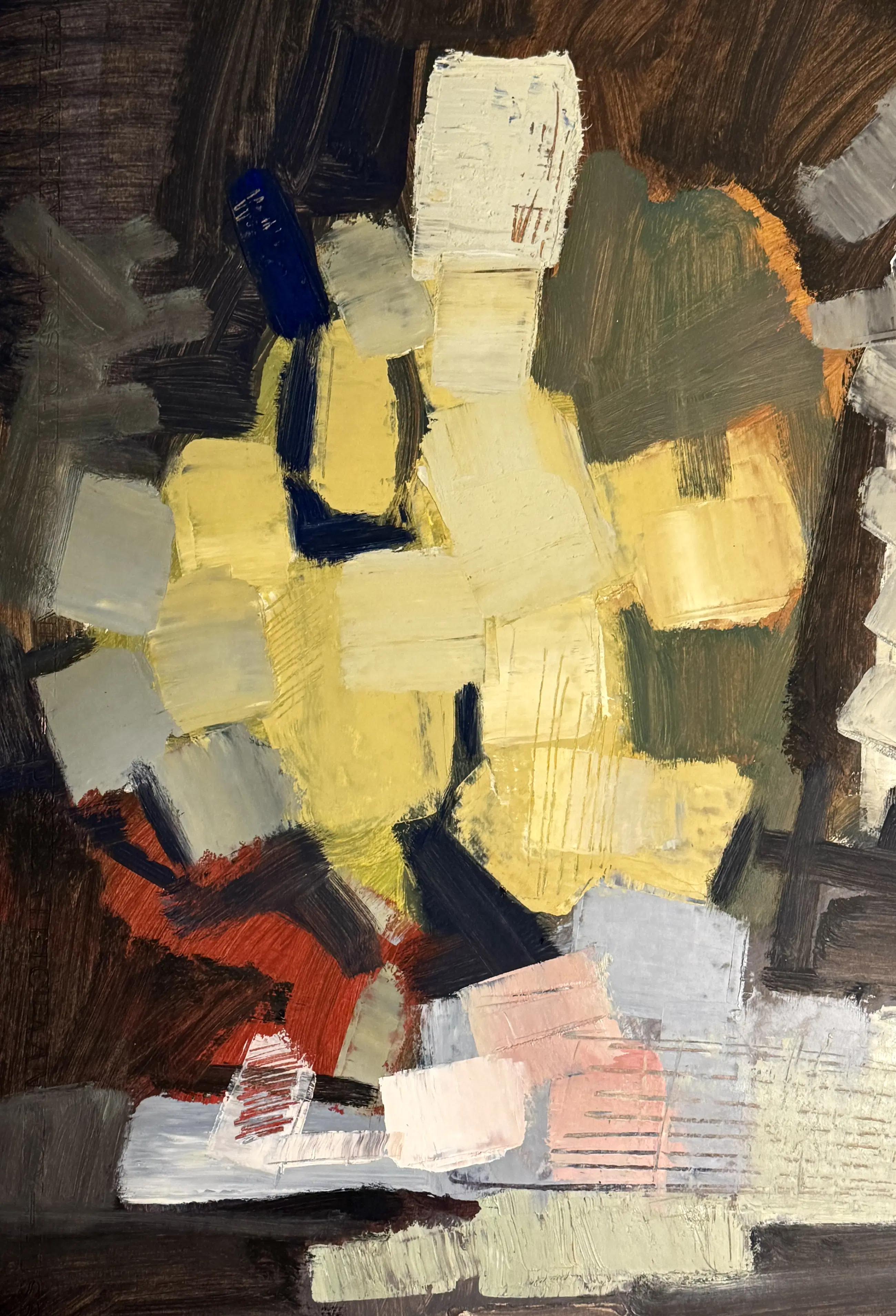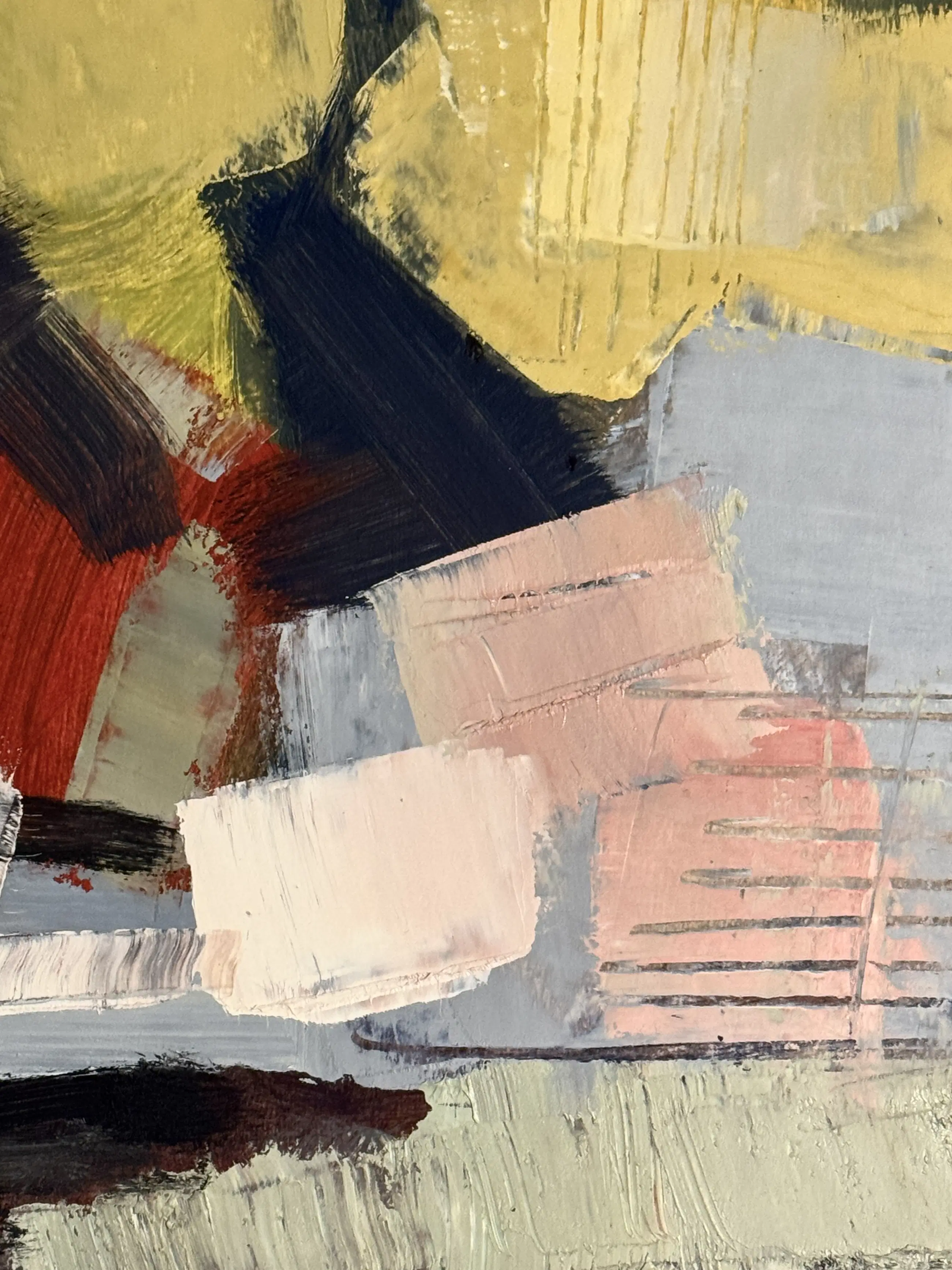 De compositie, gestructureerd maar toch vrij, onthult een harmonieuze spanning tussen strengheid en spontaniteit. De kleurvlakken – gedomineerd door heldere gele tinten, diepe bruine kleuren en blauwgrijze tinten – spelen een subtiel spel van contrasten en transparanties met elkaar. De energieke en royale penseelstreken verlenen het geheel een bijna architectonische levendigheid, doordrenkt met een diepe gevoeligheid.