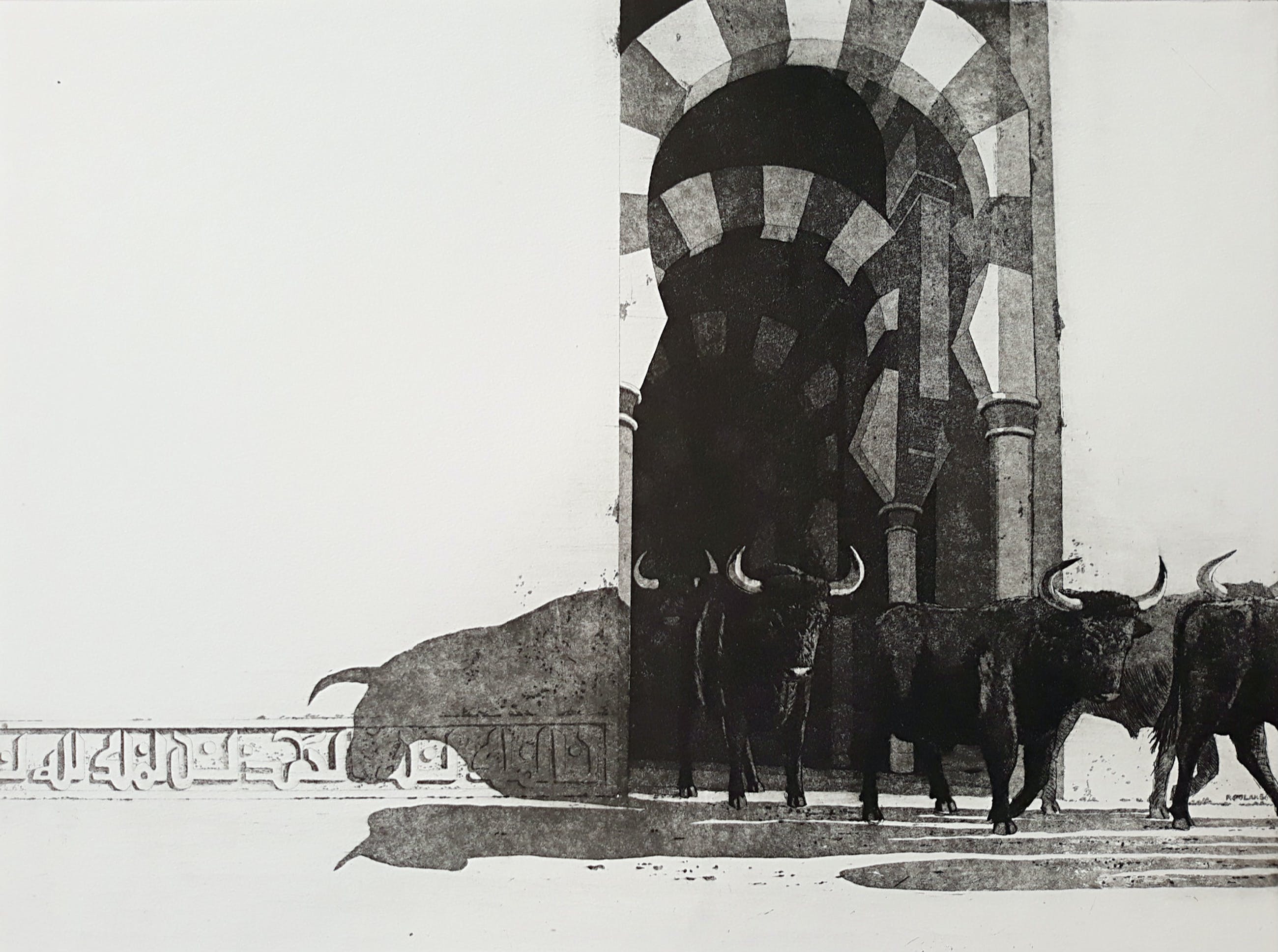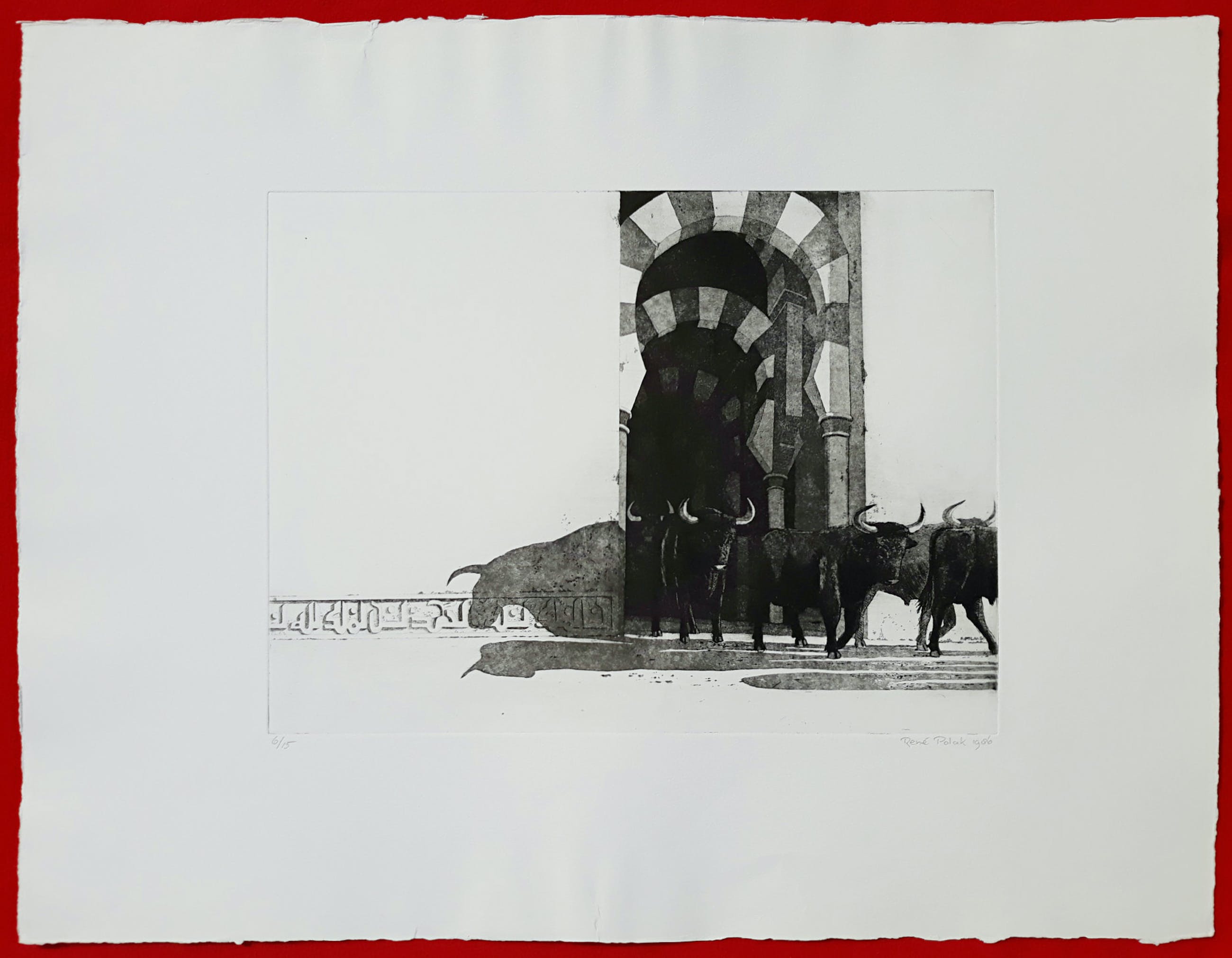 Prachtig werk van René Polak, stieren die uit de Mezquita van Cordoba lijken te rennen. Aquatint ets op geschept papier, met potlood gesigneerd, gedateerd (1986) en genummerd (6/15). In zeer goede conditie; wat kleine kreukjes in de marge maar ingelijst met passe-partout is het werk uitstekend.