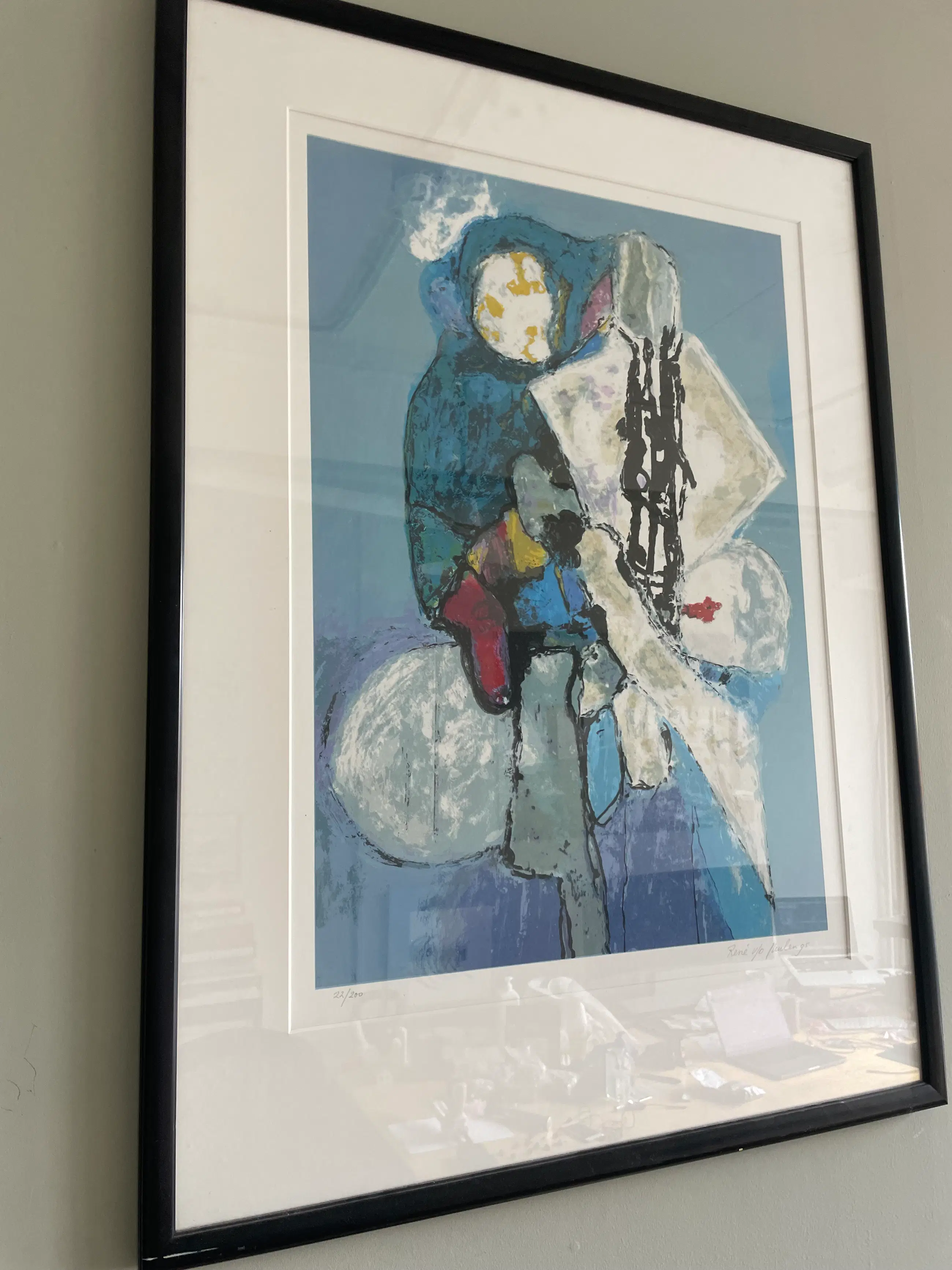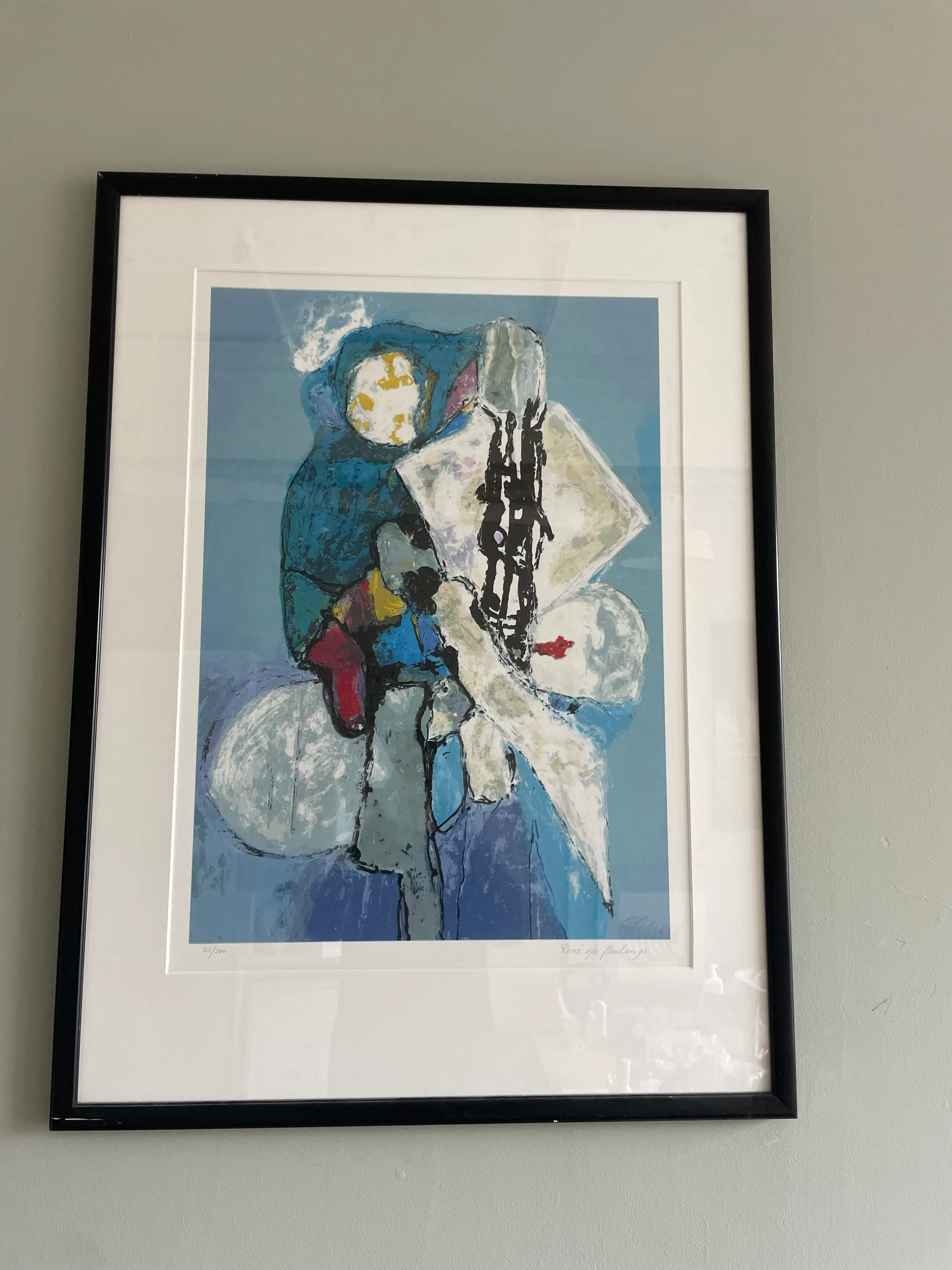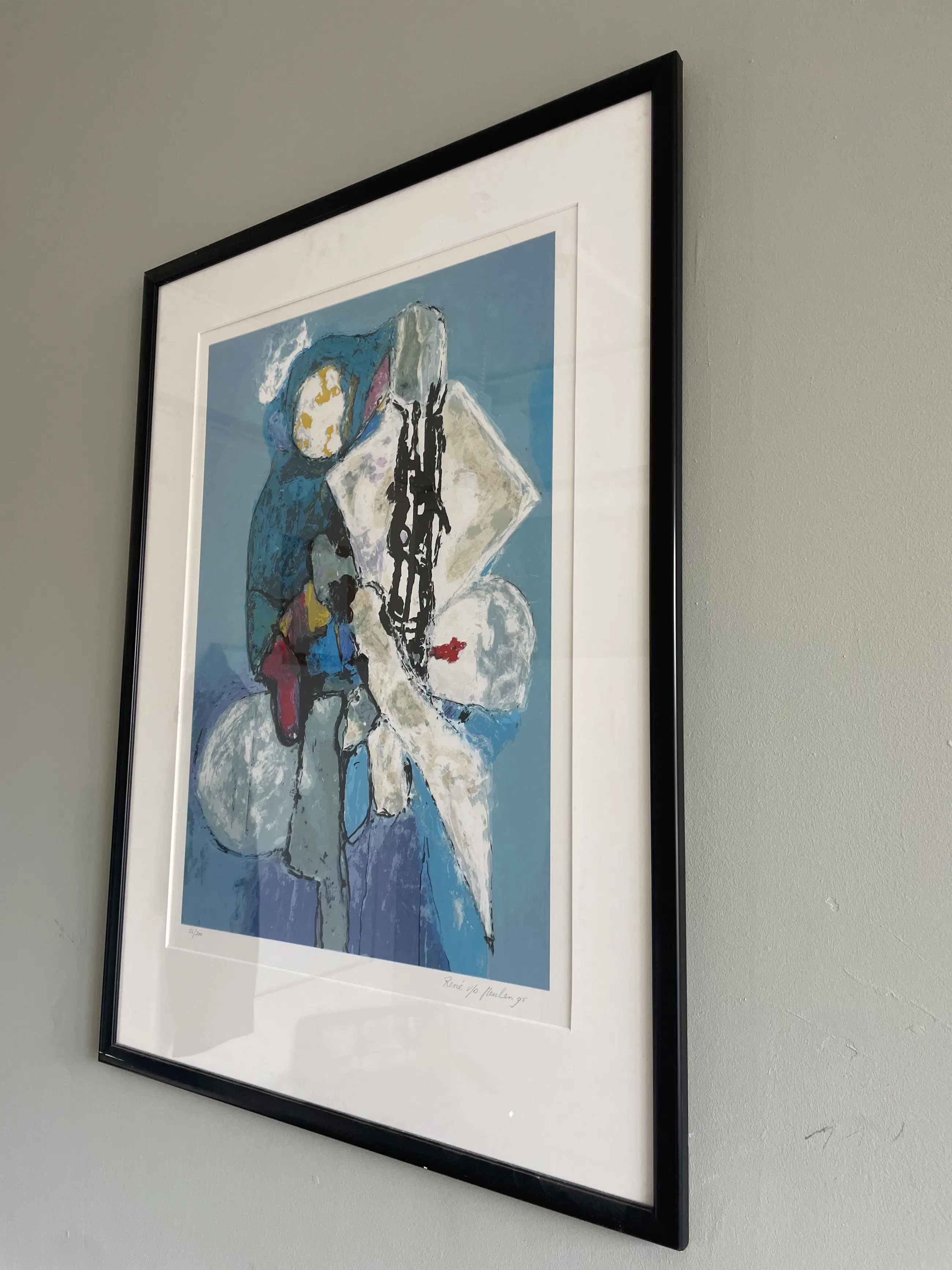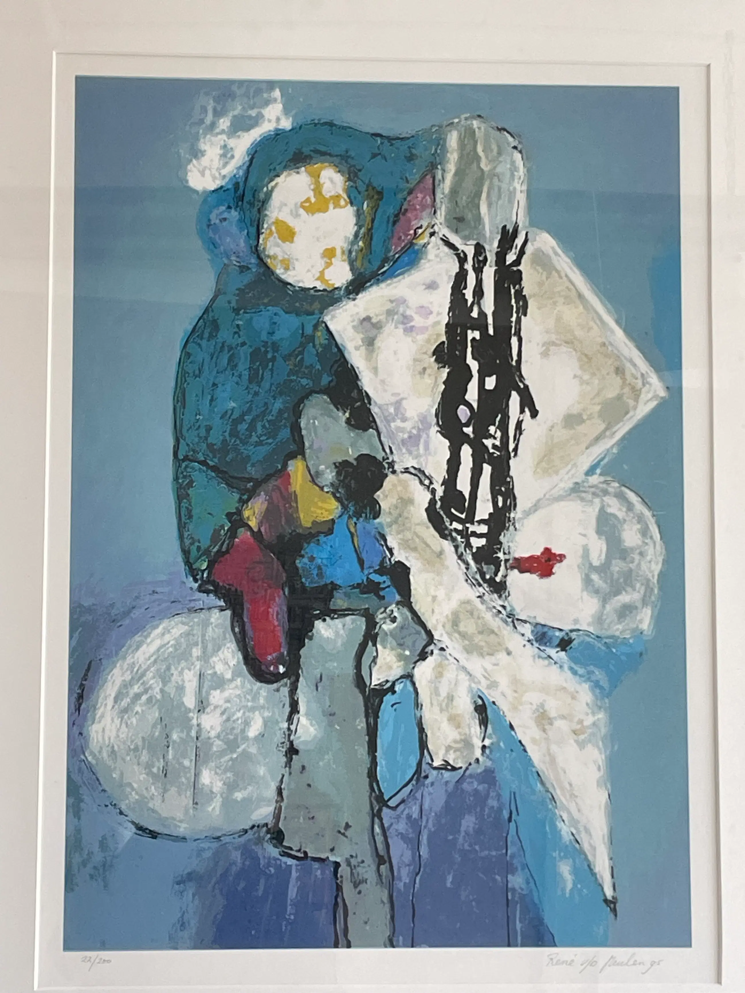 Een krachtige abstracte zeefdruk in een expressief blauw kleurenpalet, kenmerkend voor het werk van Van der Meulen uit de jaren '90. Figuren en vormen bewegen zich op de grens tussen figuratie en abstractie, met energieke zwarte lijnen en accenten van rood, geel en wit.
