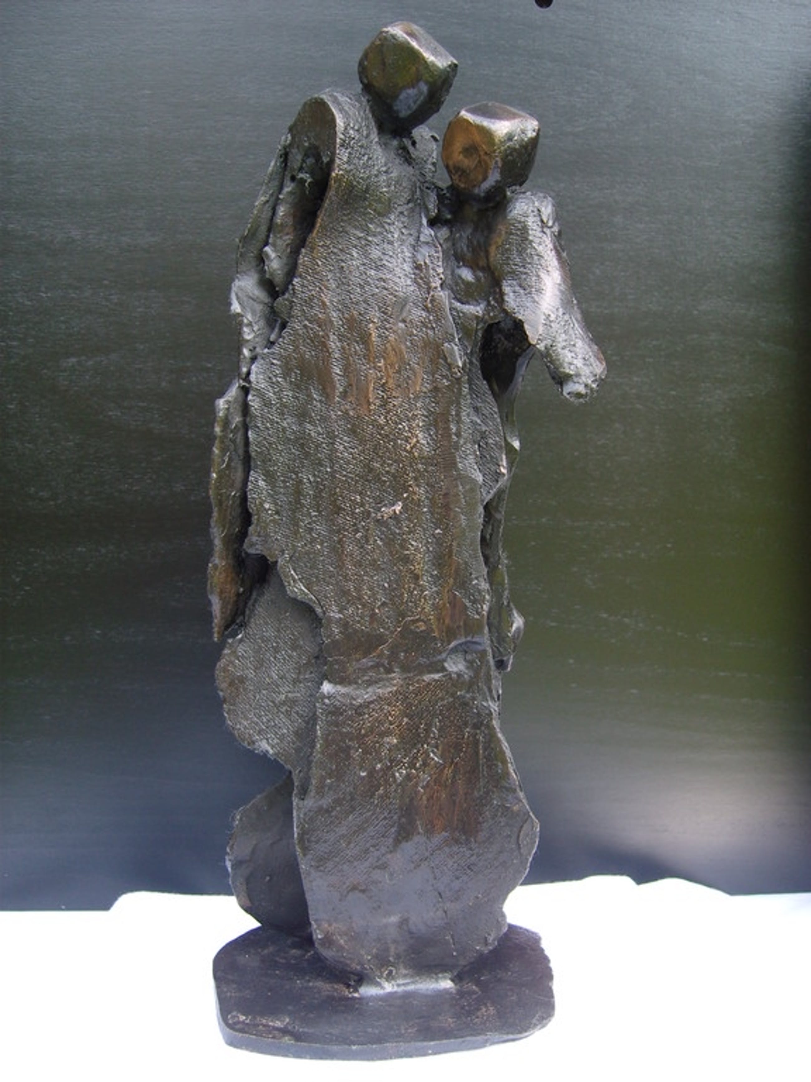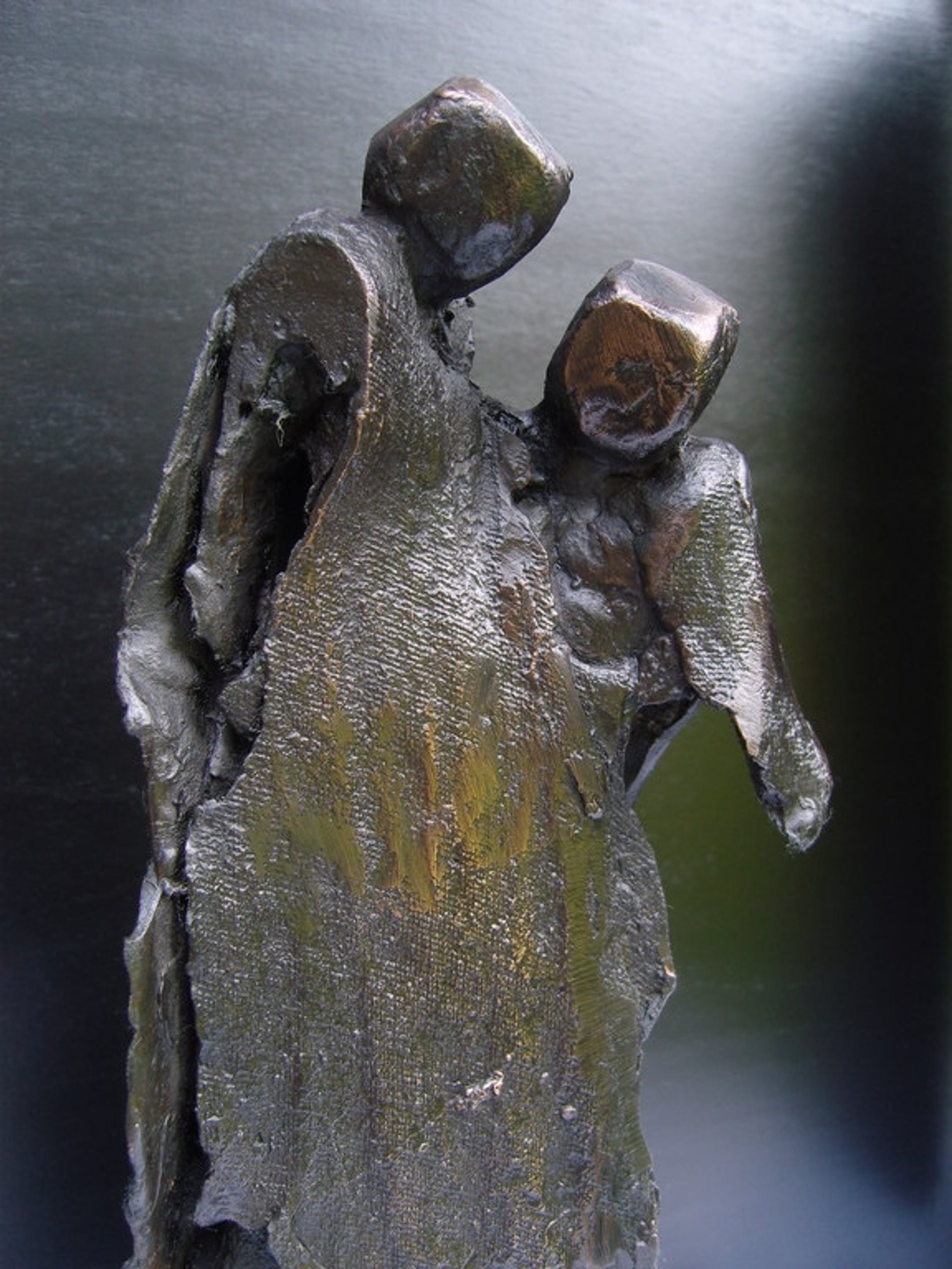 Twee bronzen mensfiguren die op elkaar steunen, het mededogen straalt van het beeld af. “Gebeeldhouwd” in grillige draperingen.Het lijken mensen, maar zijn het niet. Het zijn de emoties van de kunstenares.