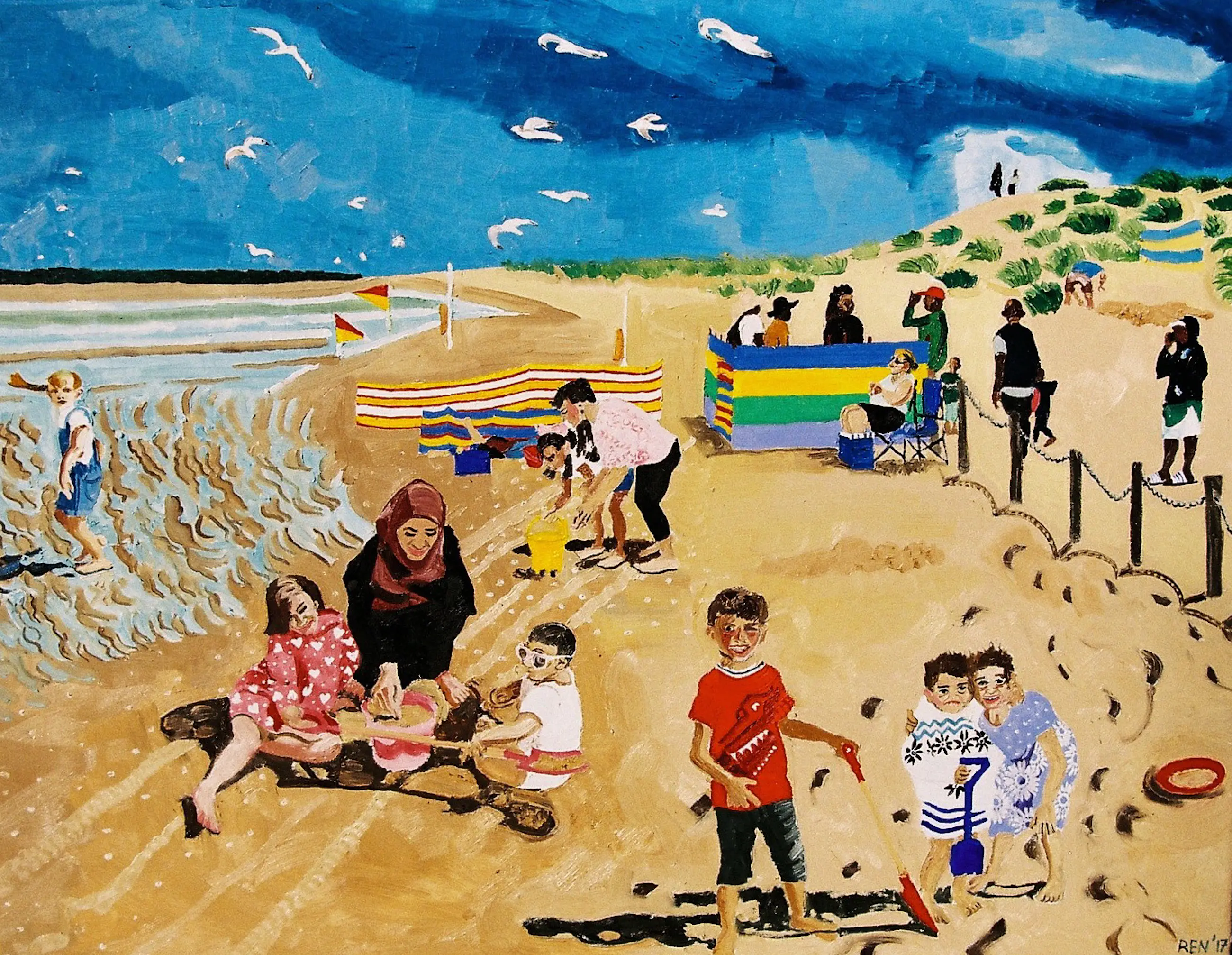 Strandscene met touristen uit binnen en buitenland, te koud om te zwemmen.