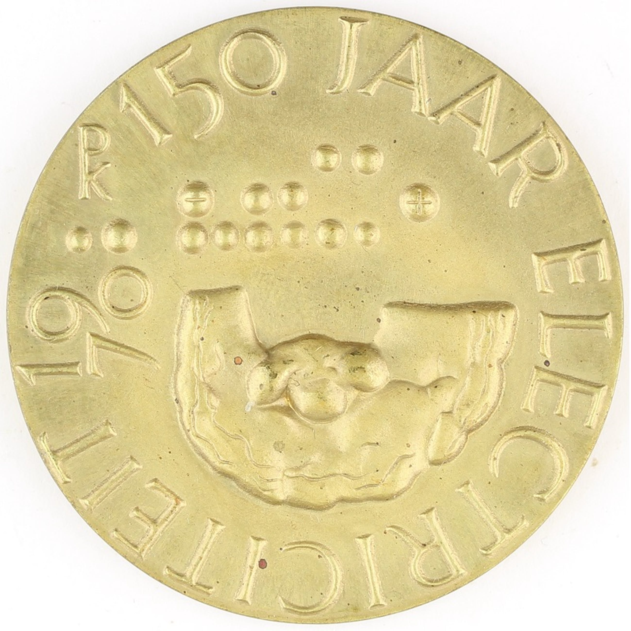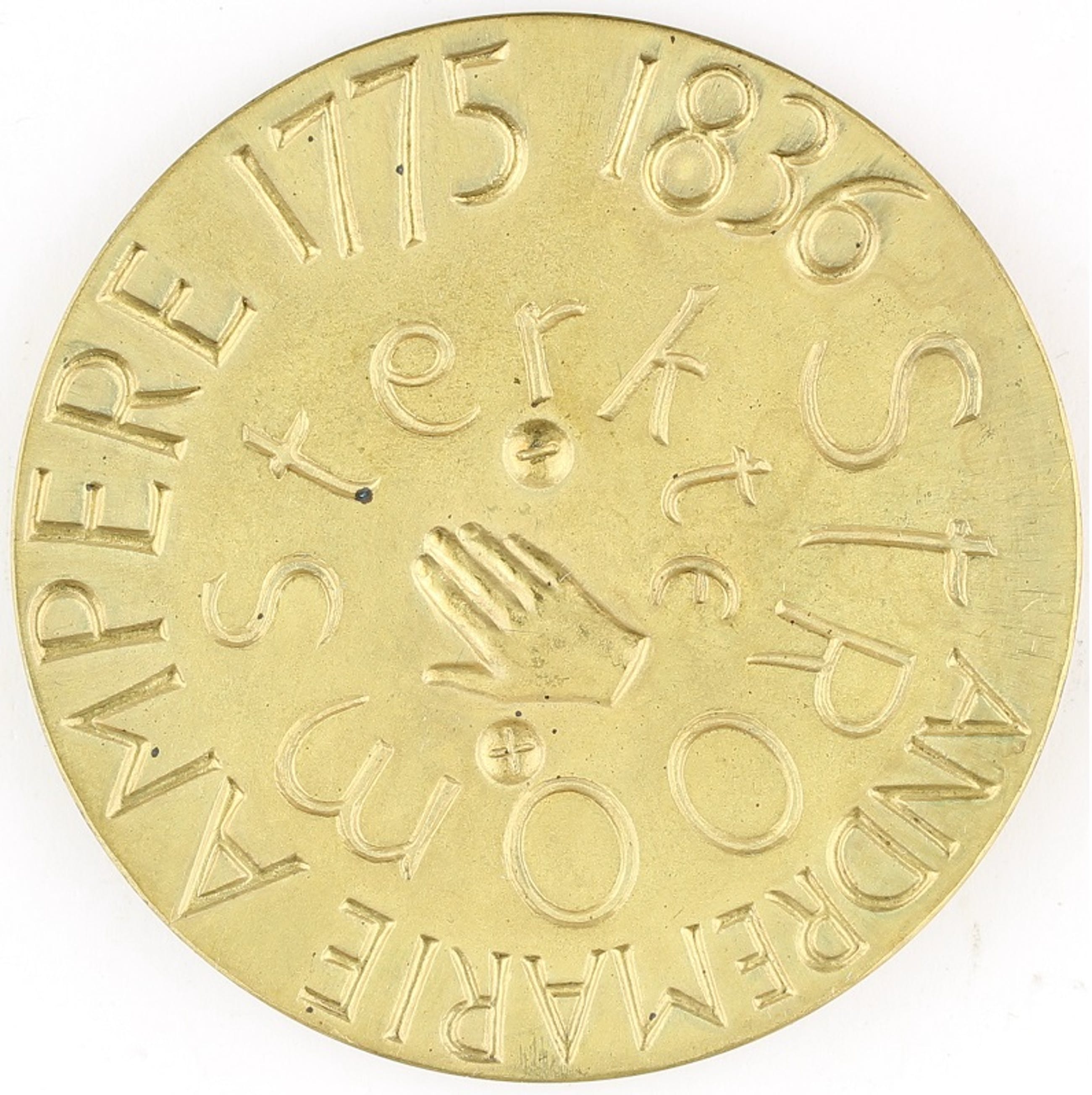 Electriciteit is niet zichtbaar, Grieken en Chinezen kenden het verschijnsel en deden er onderzoek naar. Later waren er onderzoekers als Gilbert, Du Fay, Van Musschenbroek, Franklin en Volta. De verstrooide Franse geleerde Andre Marie Ampère (1775- 1836) bestudeerde de wisselwerking tussen electrische stromen en magneten en tussen electrische stromen onderling en legde daarmee de grondslag voor de electrodynamica. De eenheid electrische stroomsterke is naar hem genoemd. Hettema heeft het zich niet gemakkelijk gemaakt door juist niet een voor de hand liggend portret te modelleren. Hij wilde op het kleine vlak duidelijk maken waar electriciteit over gaat, een streven naar exactheid; daarom zijn er een reeks electronen uitgebeeld, die aan Brailleschrift doen denken, met daaronder een plastische fantasie om aan te geven dat de electriciteit altijd al aanwezig was. De zijde met in strakke letters de naam van de geleerde heeft in het midden een hand om het tastende onderzoek en het streven naar beheersing van deze geheimzinnige natuurkracht te verbeelden. #Louk Tilanus, Handzame Sculptuur