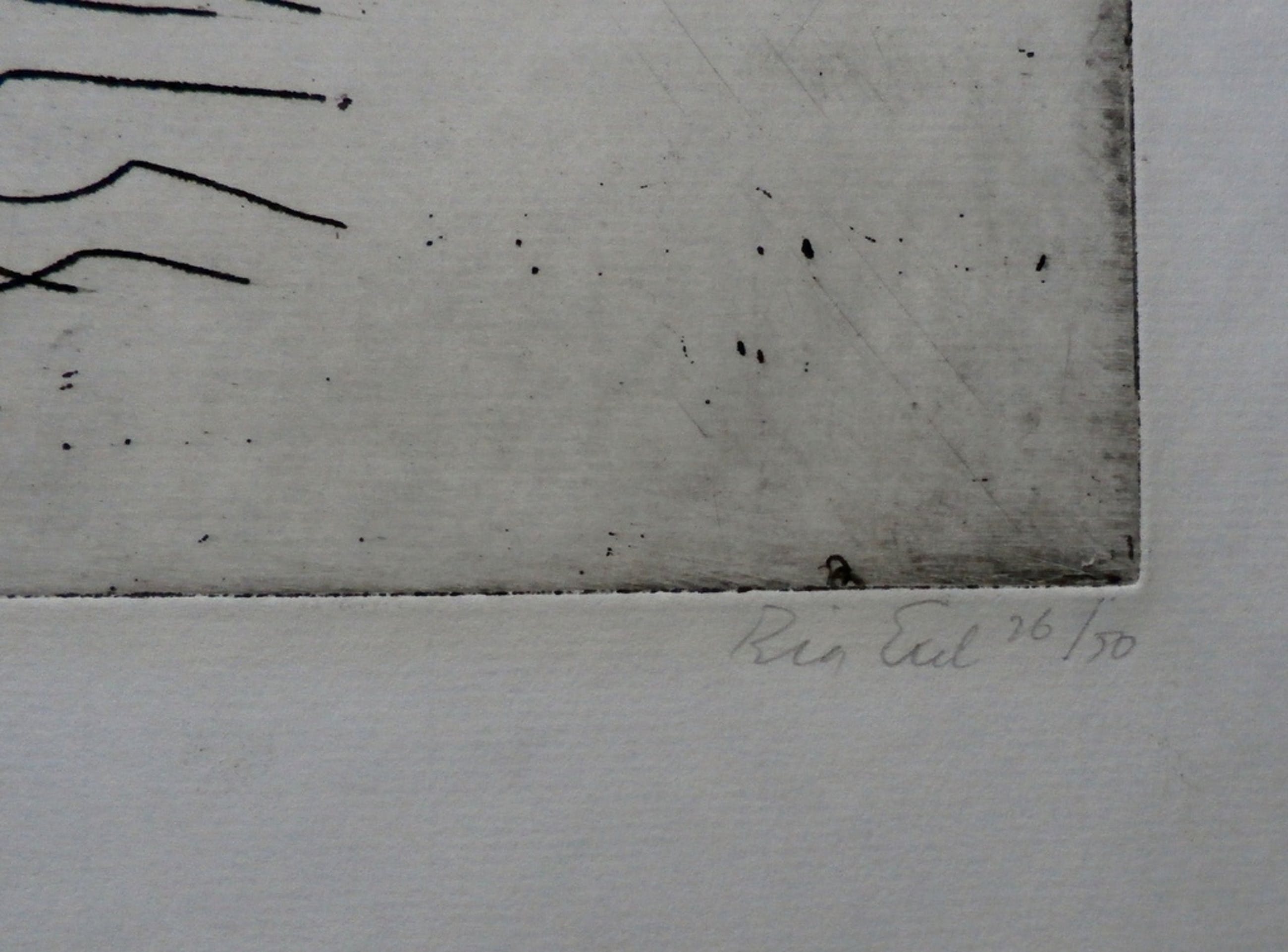 Ets van Ria Excel. Titel: onbekend. Nummer: 26/50. Jaar: 1997. Afmetingen blad: H38,5 x b56 cm. Afmetingen voorstelling: H31 x b44 cm. Rechtsonder door de kunstenaar gesigneerd met potlood. De authenciteit van het, aangeboden, werk wordt voor 100% gegarandeerd.