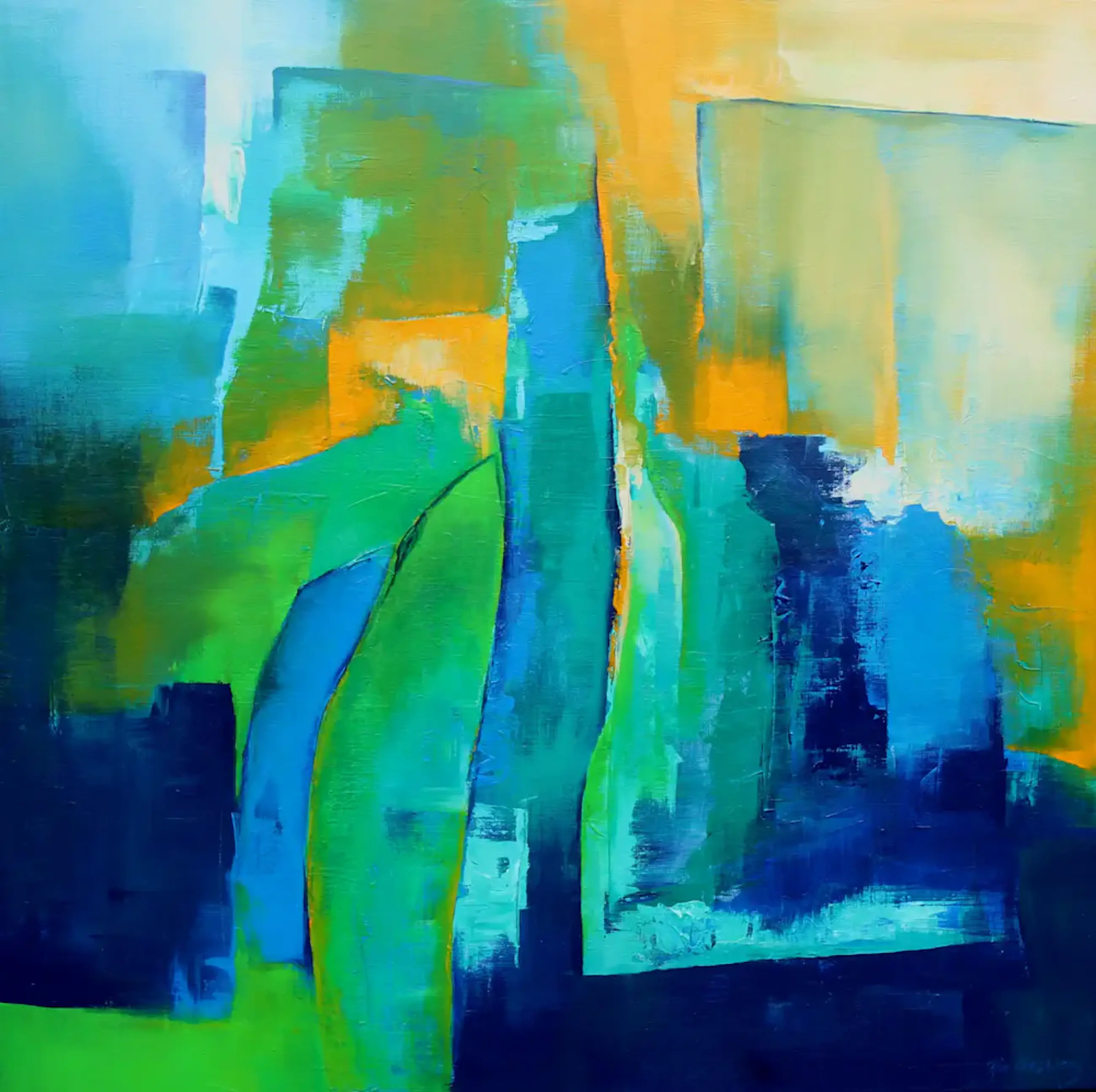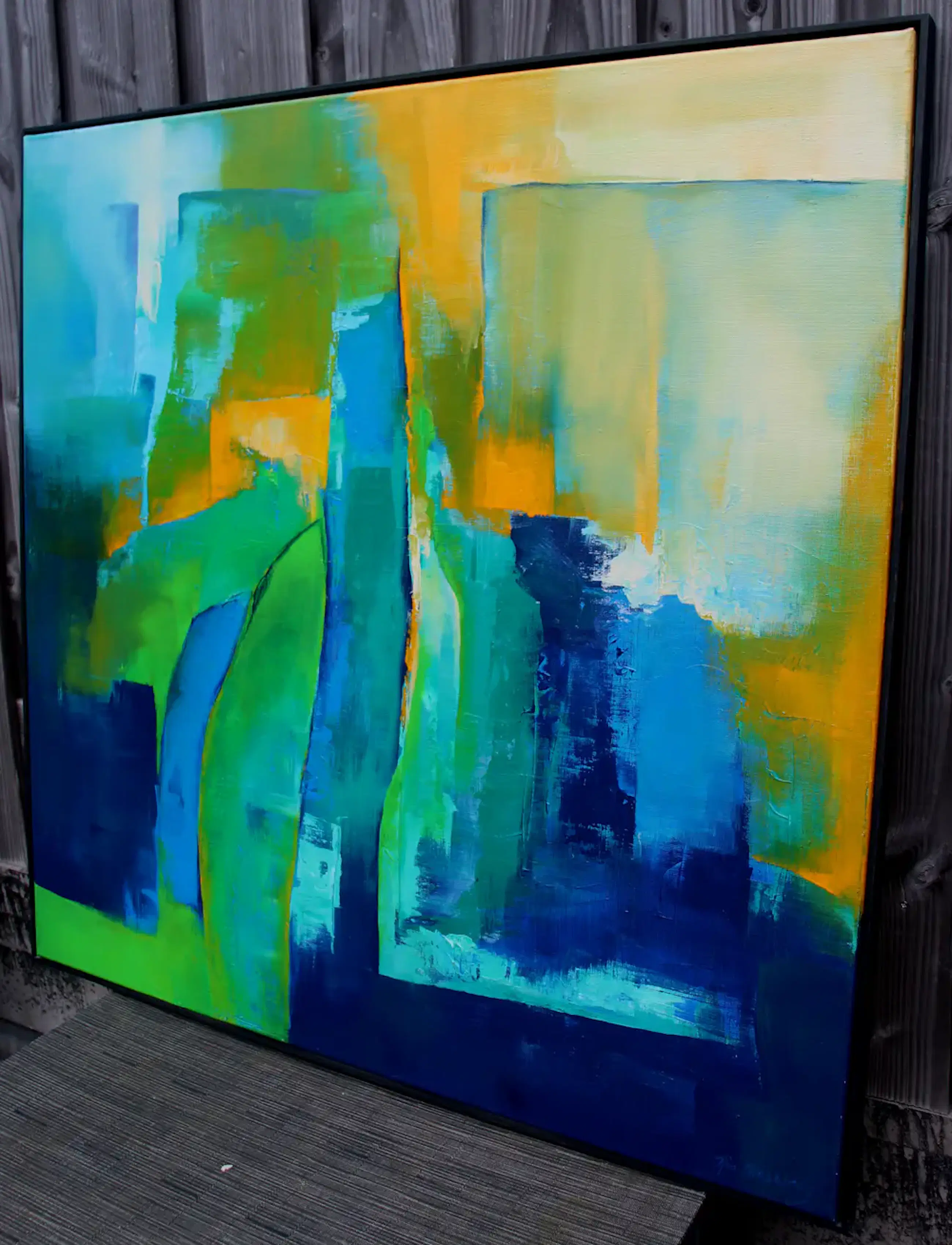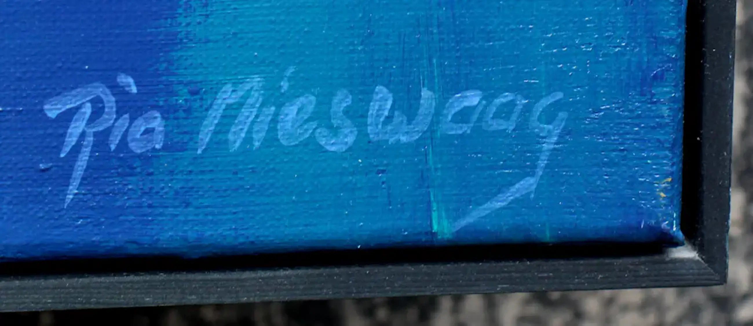 Ingelijste acrylverf op doek van Ria Nieswaag. Jaar: 1997. Afmetingen incl lijst: H103 x b103cm. Afmetingen voorstelling: H100 x b100cm. Het werk is, rechts onderaan, gesigneerd door de kunstenares. De authenticiteit van het aangeboden werk wordt volledig gegarandeerd. Een certificaat van echtheid kan, op aanvraag, worden gemaild.