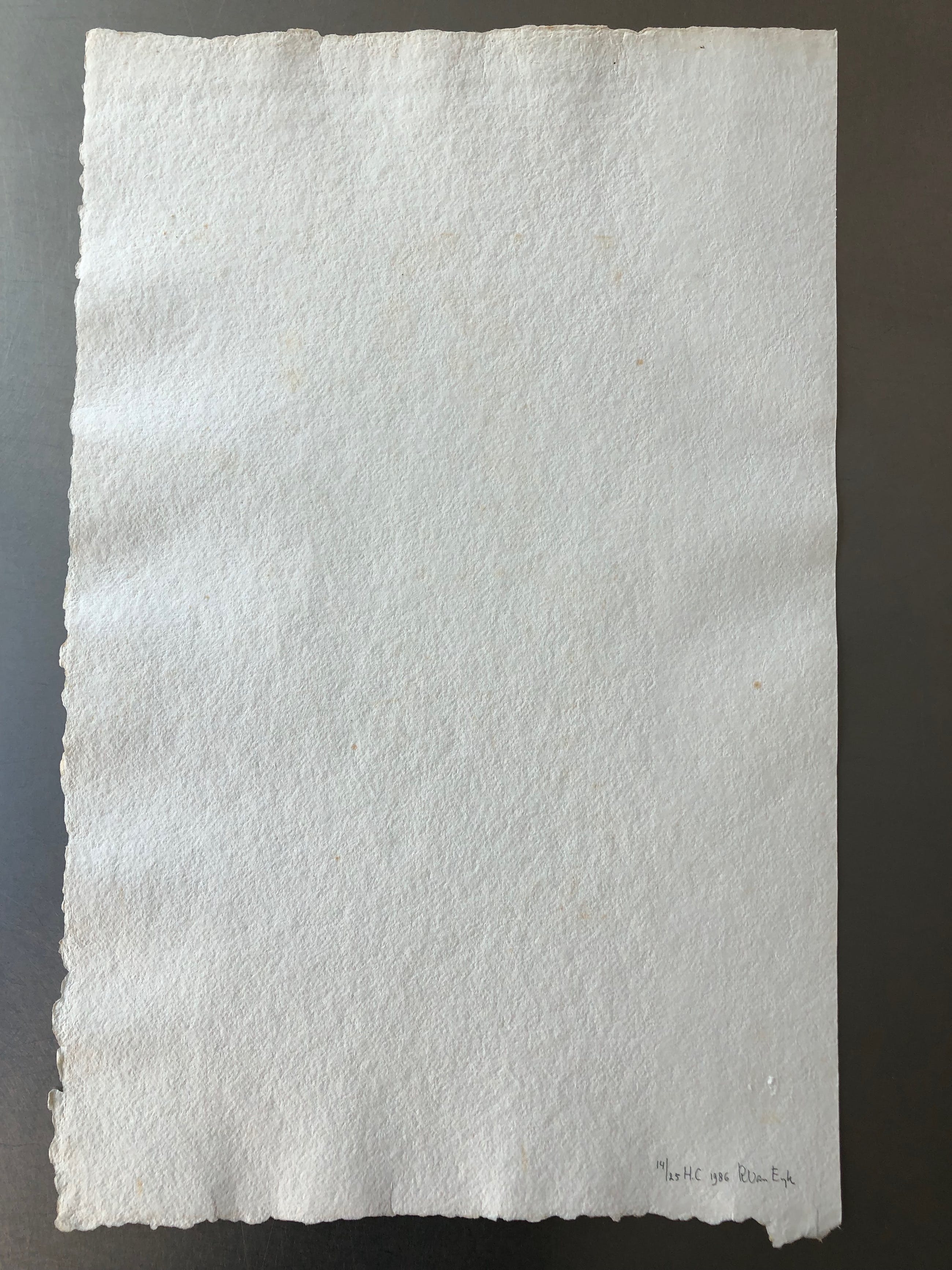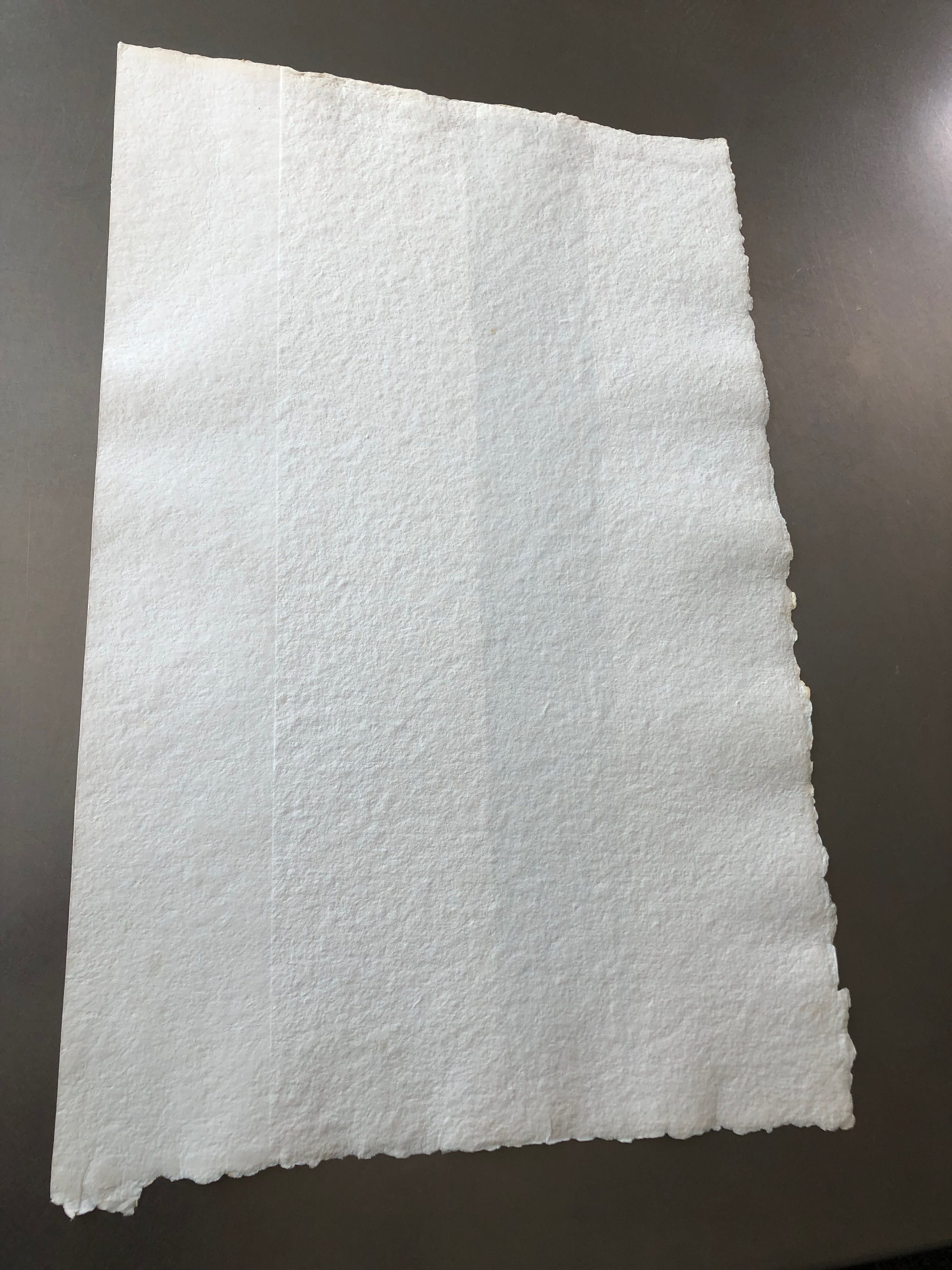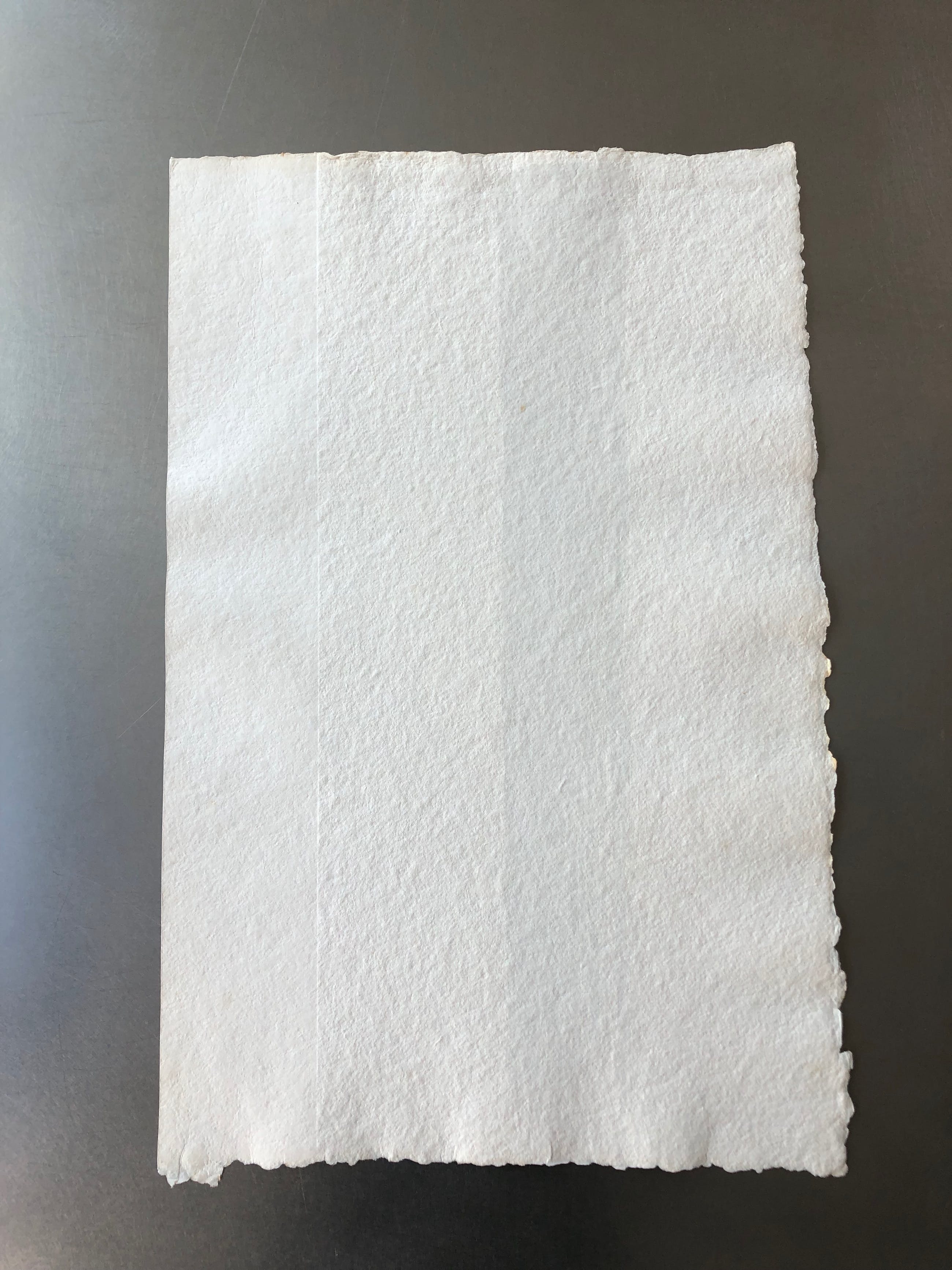 Het handgeschepte papier vertoont op de achterkant hier en daar kleine gele vlekjes van het lange bewaren. Op de voorkant zit één vlekje.