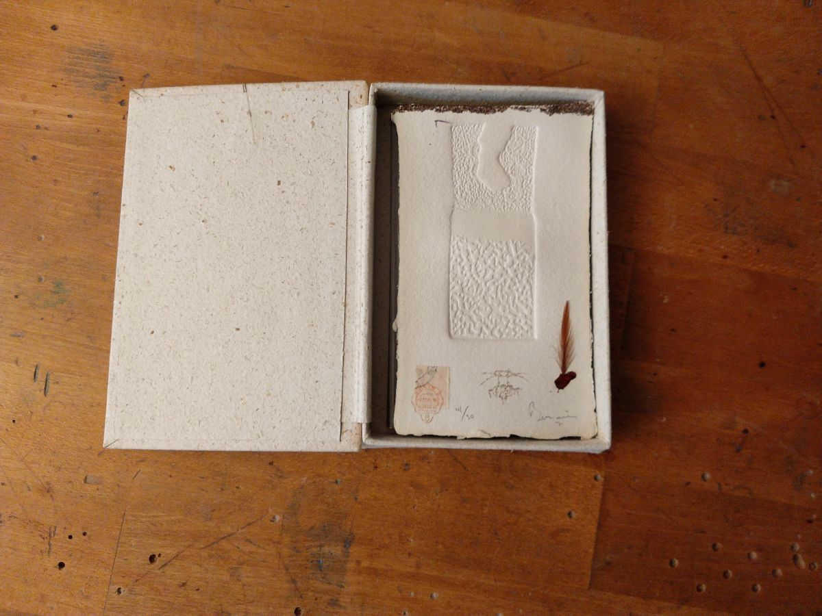 chöner Prägedruck 41/50 handsigniert auf Bütten 19cm x 11 cm im Buchkasten (21cm x 14 cm). Der Deckel hat eine patinierte Metallapplikation sowie einen Faden, der mit Siegellack befestigt ist. Zudem ist ist ein Buch mit Drucken des Künstlers beigelegt mit Kommentaren internationaler Literaten in Spanisch und Englisch u.a. Michael Ende.Sehr guter Zustand. 3 Euro Versand. Ausland auf Anfrage
