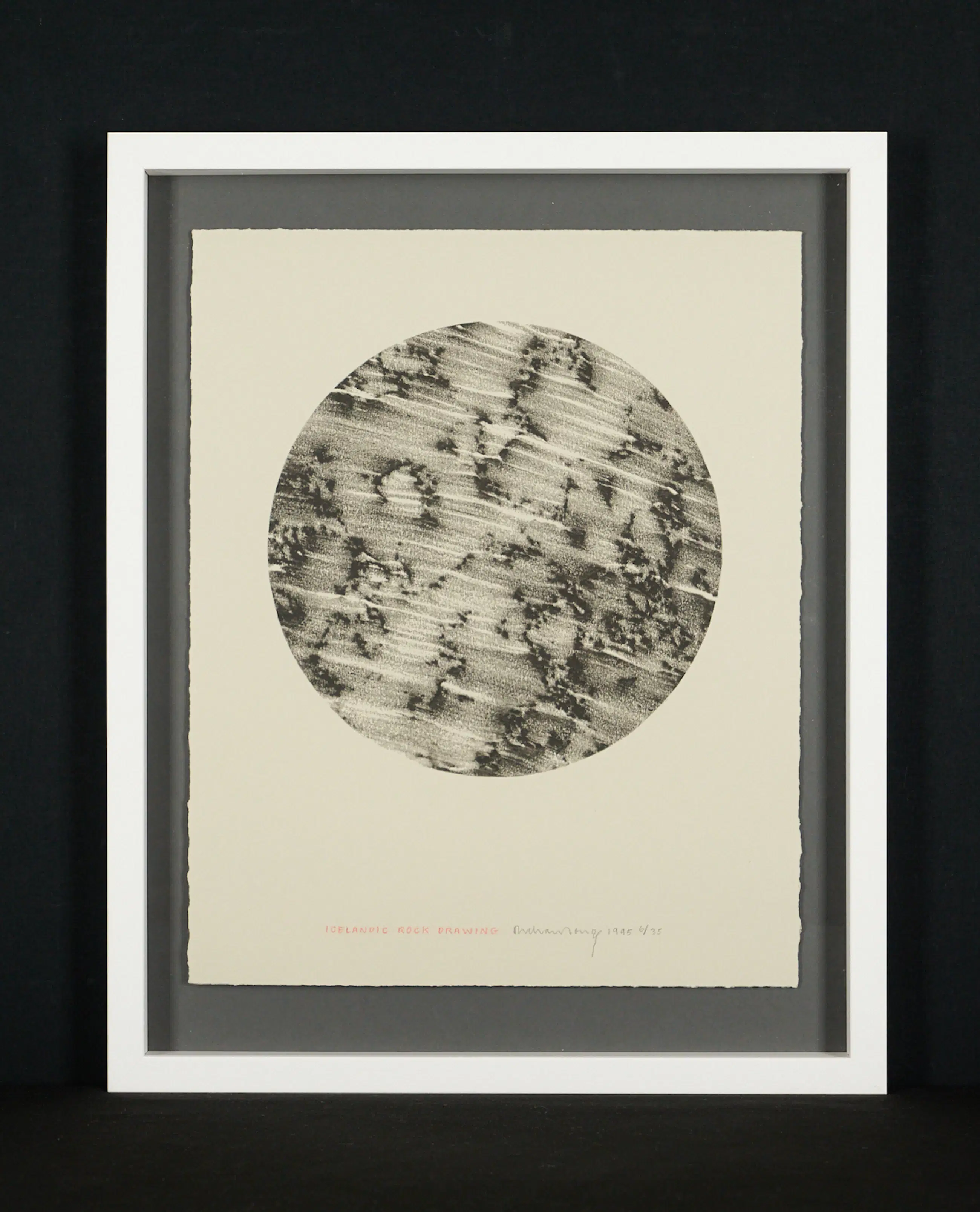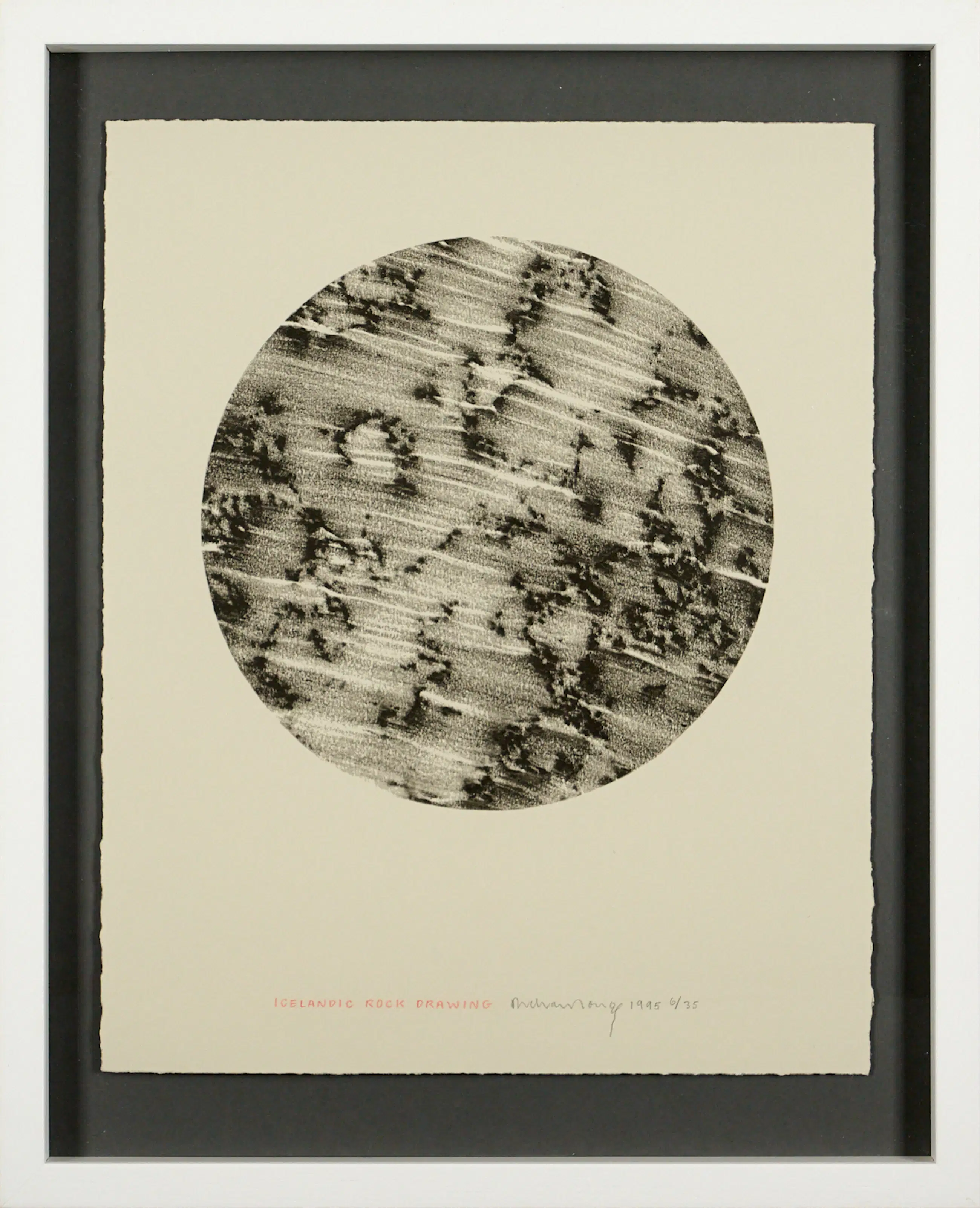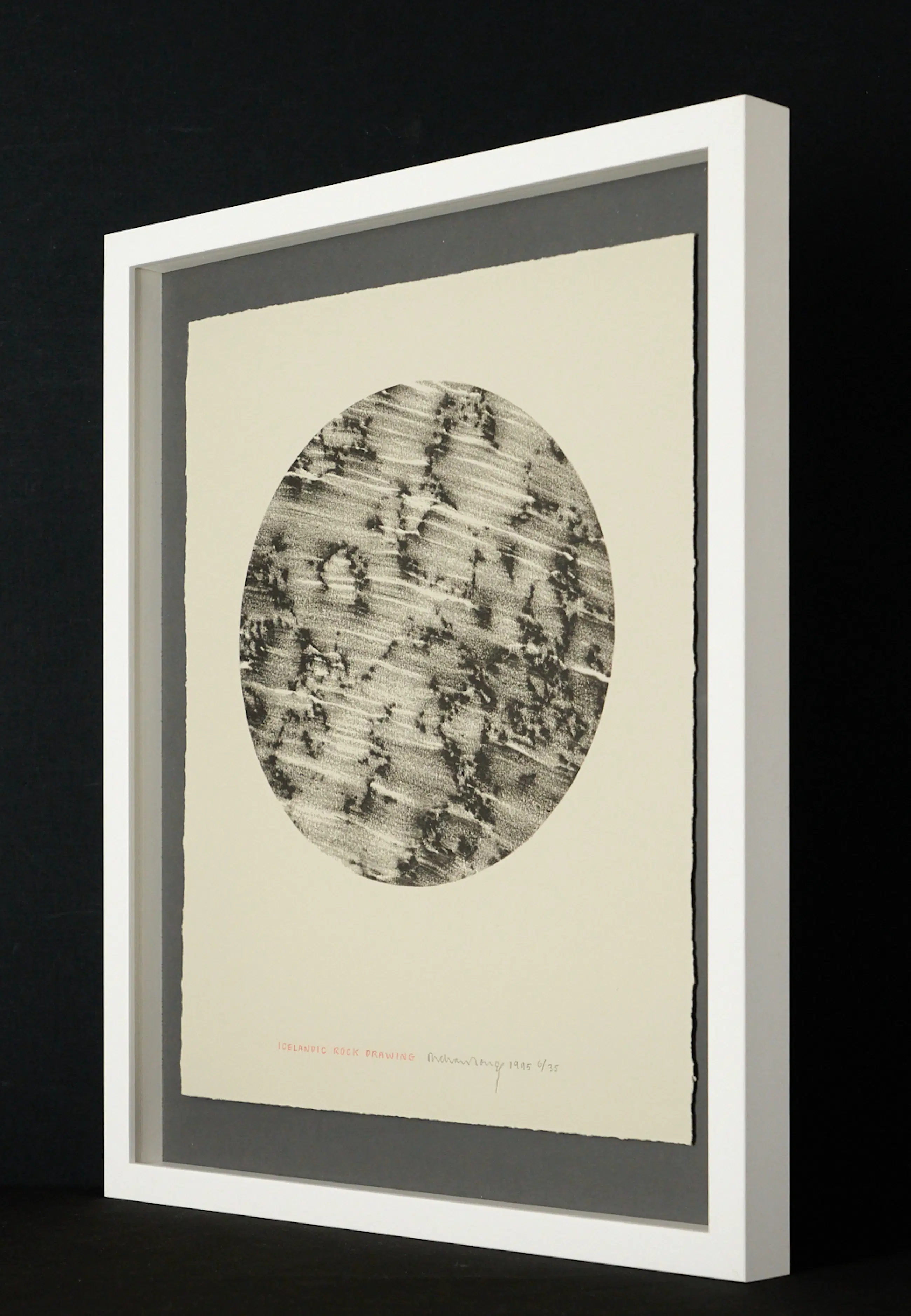 Deze bijzondere lithografie van de gerenommeerde Britse kunstenaar Richard Long draagt de titel “Icelandic Rock Drawing”, handgeschreven in rood potlood onder het beeld.