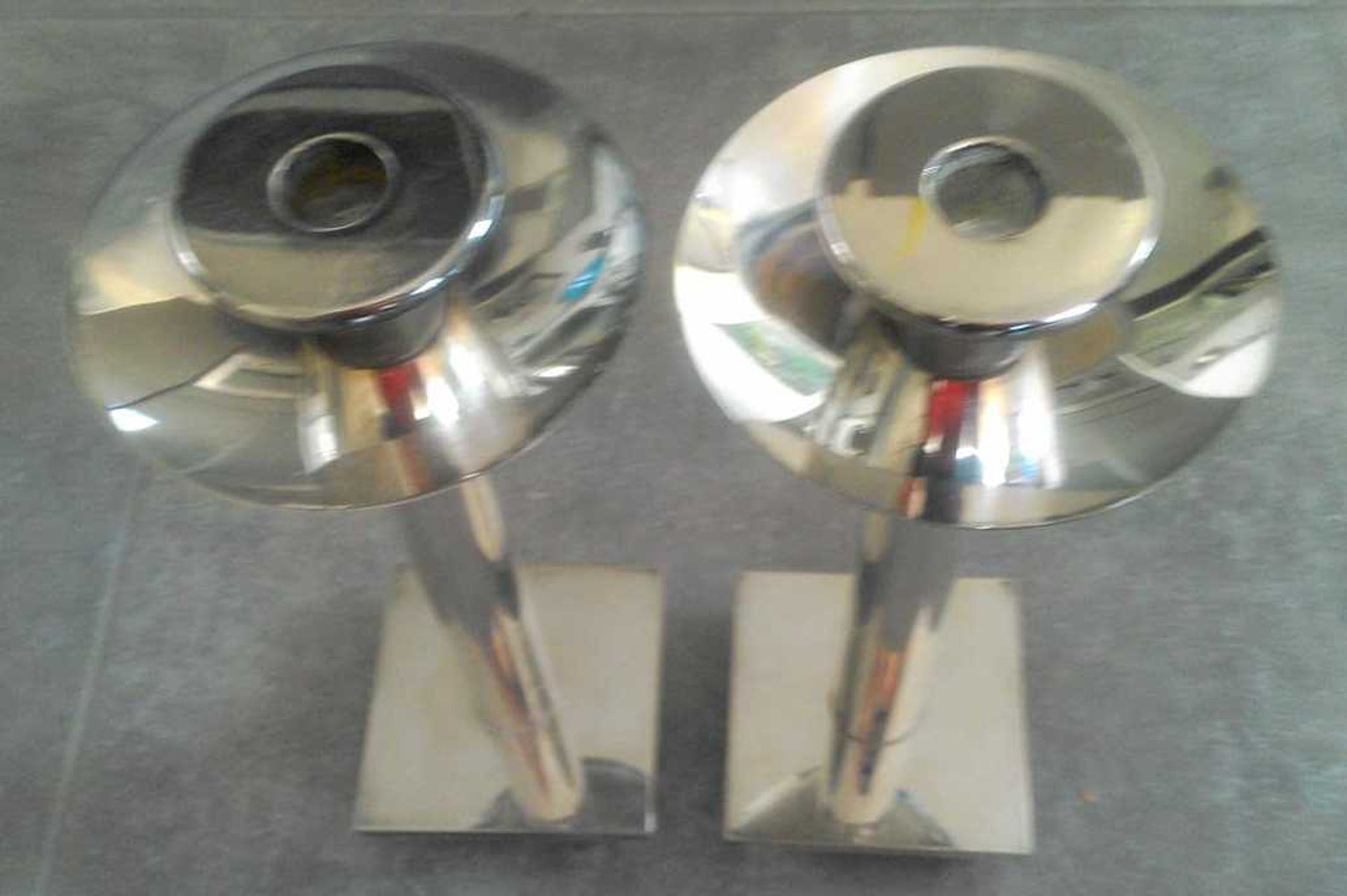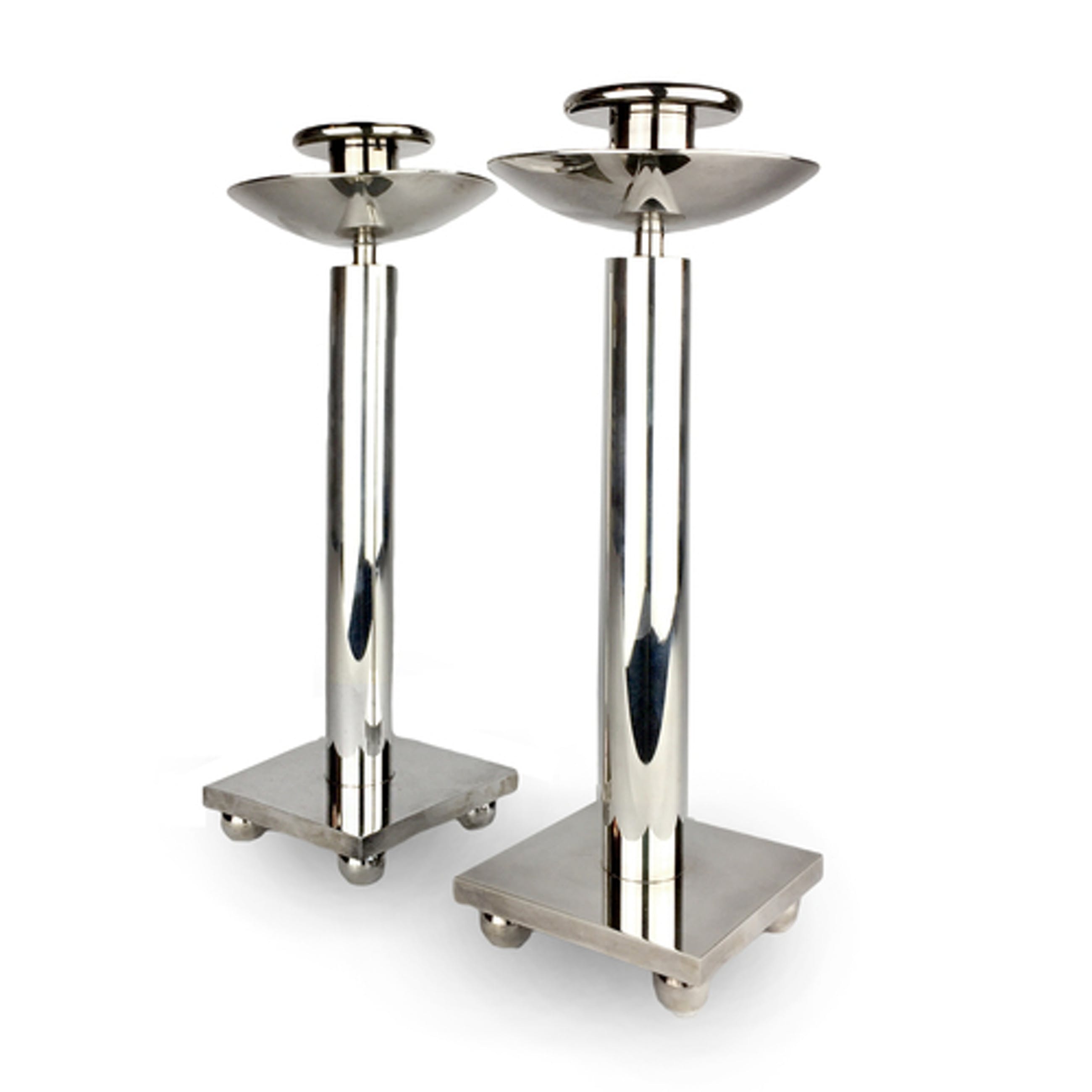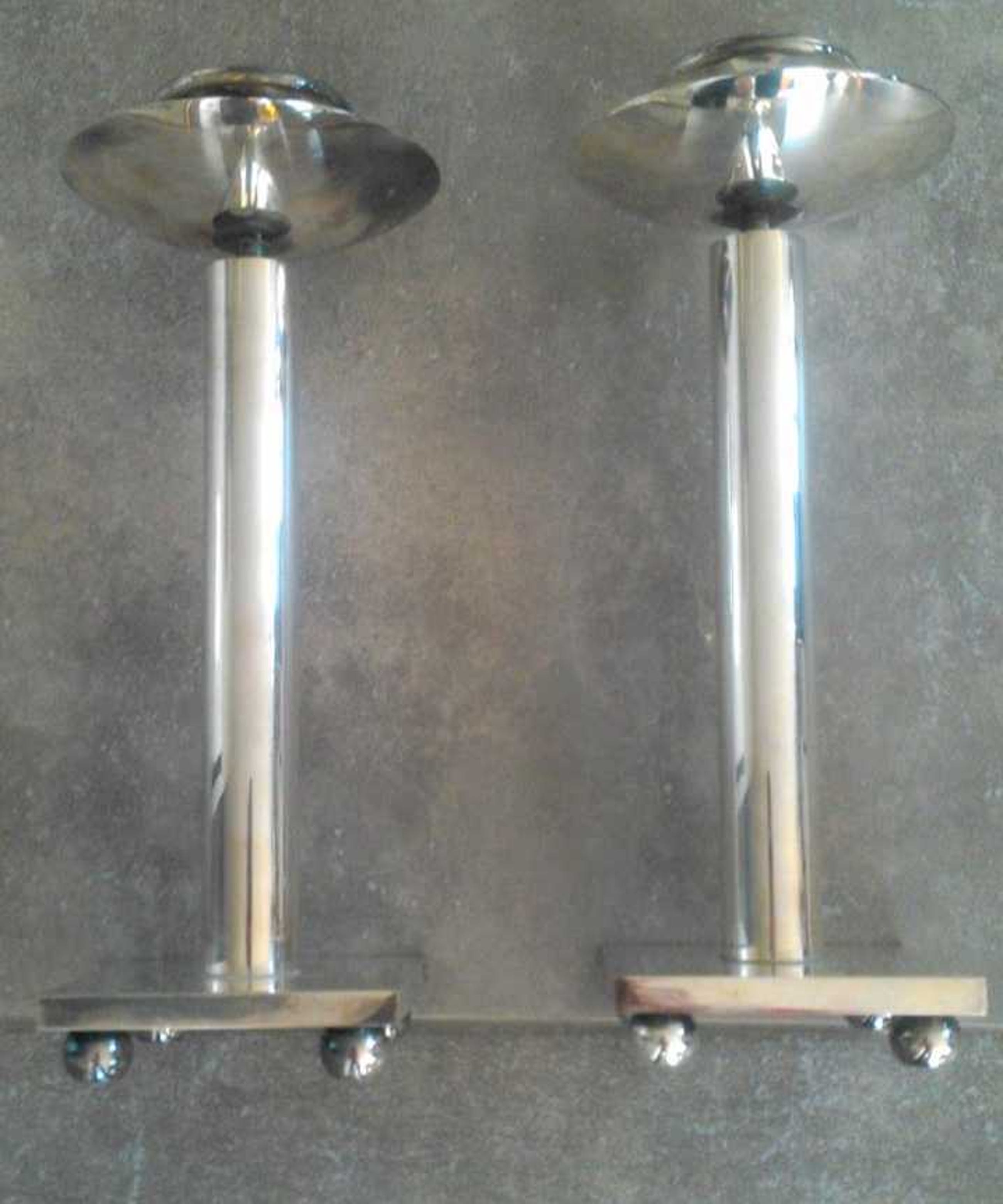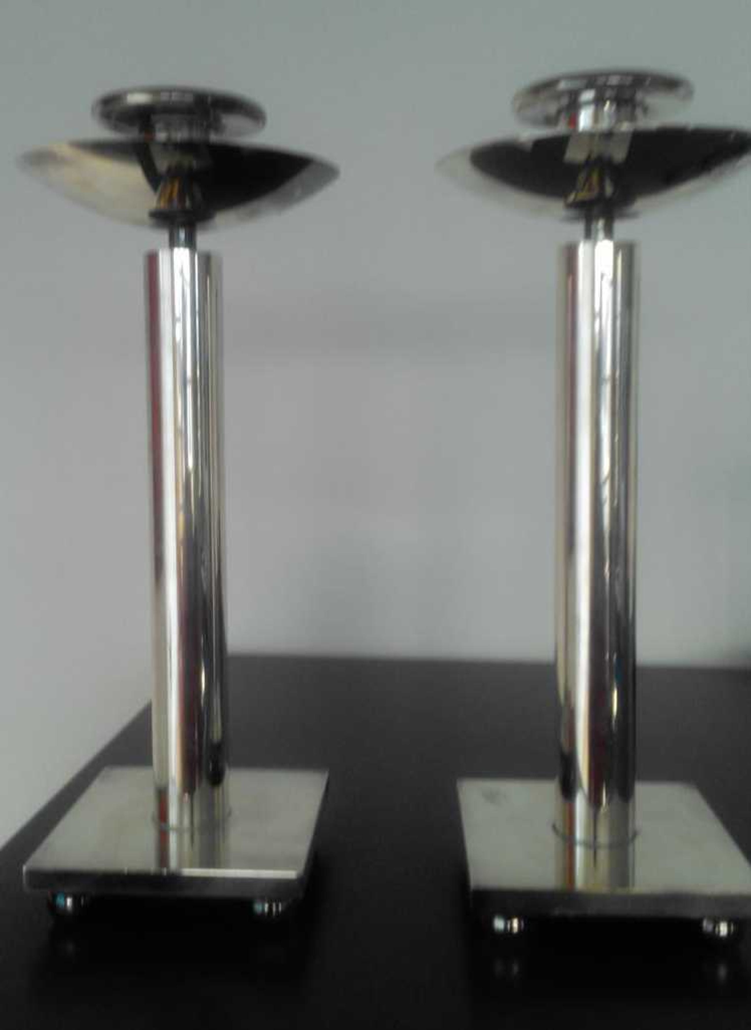 Designer: Richard Meier Amerikaans architect van onder andere Stadhuis Den Haag Ïjspaleis Manufacturer: Swid Powell Materials: Silver plate over brass Country of Origin: Italy Date: Mid-80s Dimensions: "30cm H x 12 cm doorsnede Bowl x 10 x 10 cm base 1685 gram each Condition: Good vintage condition. Richard Meier created many of the most iconic designs for Nan Swid and Addie Powell in the mid-80s. This softer circular design is rare as compared to Meier’s other designs that reflect his signature love of the grid. At a foot tall with the expansive 5” diameter “bowl”, they are perhaps the largest silver plate candlesticks that Swid Powell produced. Recente opbrengst zie link https://russellbrightwell.com/richard-meier-swid-powell-candlesticks/