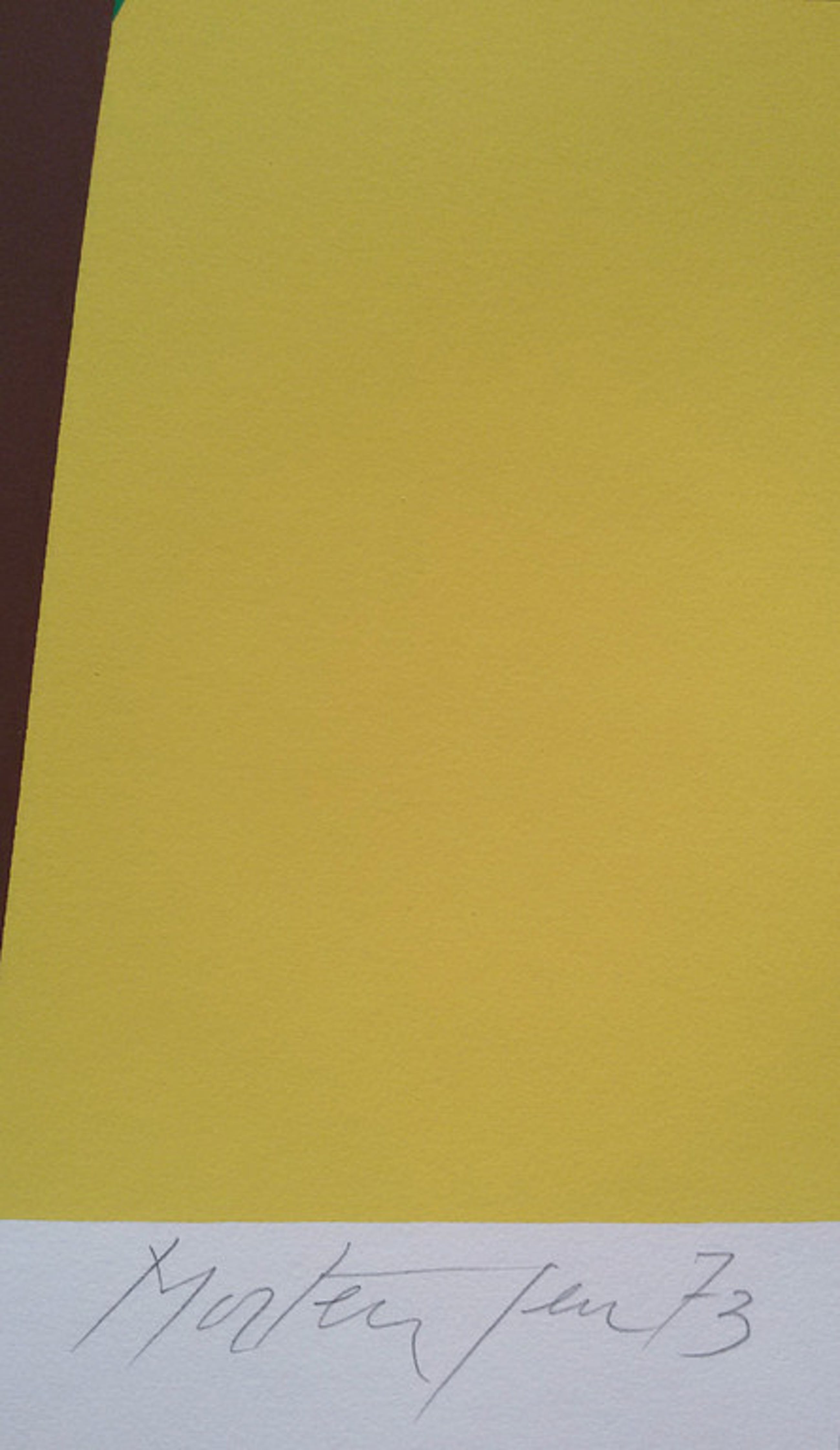 Karakteristiek, kleurrijk werk van de internationaal zeer bekende Deense kunstenaar Richard Mortensen. Zeefdruk op papier, met potlood gesigneerd, gedateerd (‘73) en genummerd (74/75). In zeer goede conditie; werk heeft wel ingelijst gezeten want er zitten op de achterkant van het blad taperesten in de hoeken die enigszins zichtbaar zijn als lichte vlekken in de hoeken van de witte marge aan de voorkant. Opnieuw ingelijst met passe-partout is het werk uitstekend want de zeefdruk zelf en de marge er direct omheen (meer dan 3 cm) zijn in mint conditie.