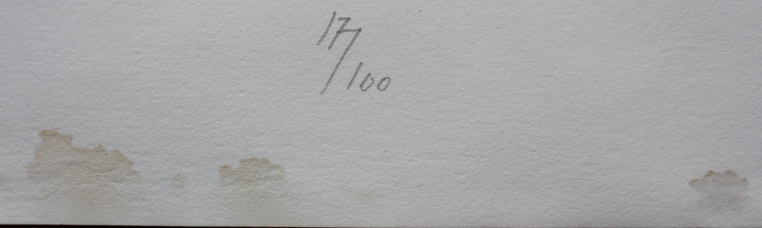 Aan de onderzijde zit wat waterschade en het papier is wat "golvend". Er zitten plakresten op de achterzijde van een vorige inlijsting.
