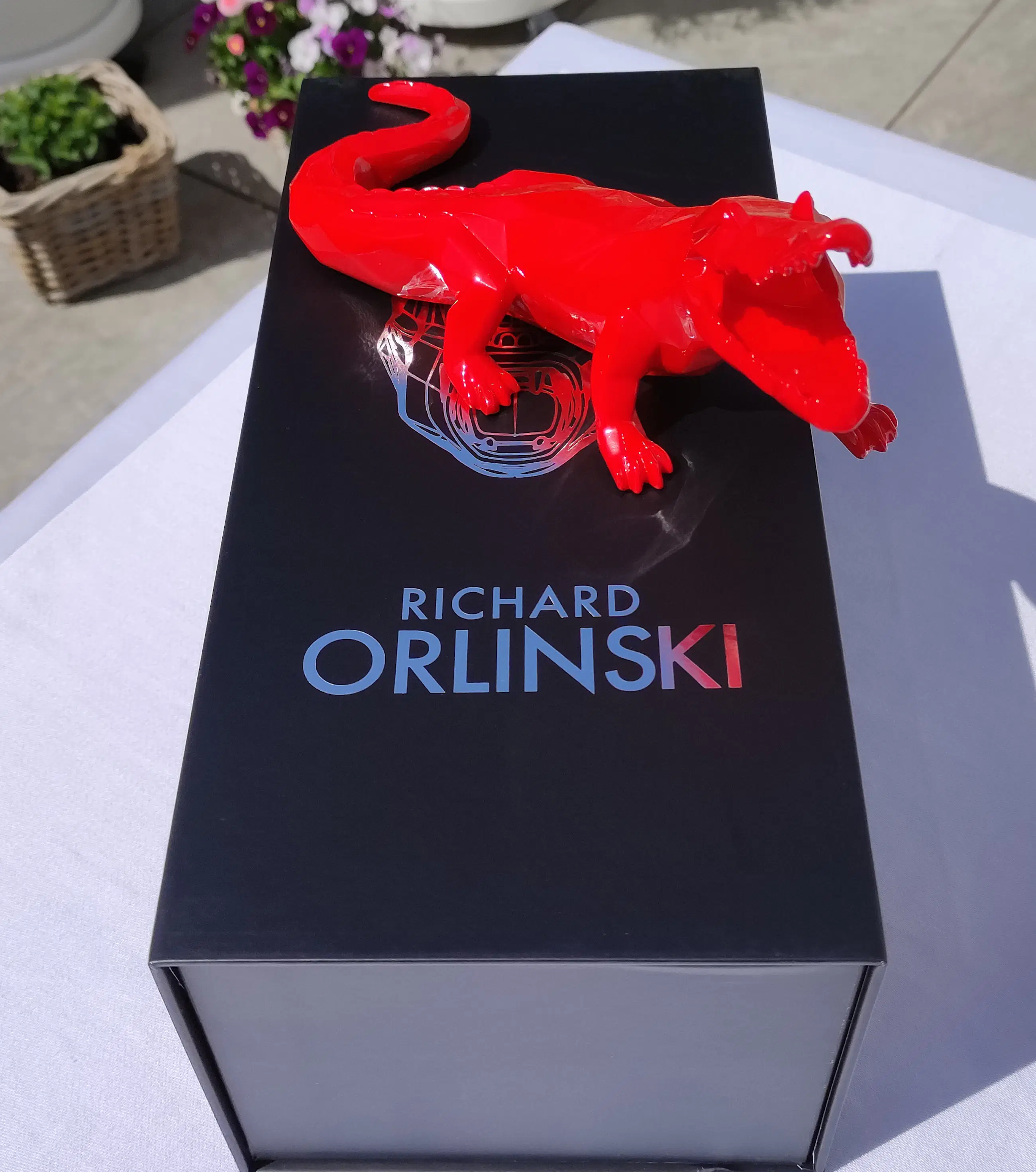 Het beeld, in de vorm van een liggende krokodil, verscheen in 2024 als unieke editie in dit formaat en deze kleur. Het beeld draagt een reliëfsignatuur van Richard Orlinski.