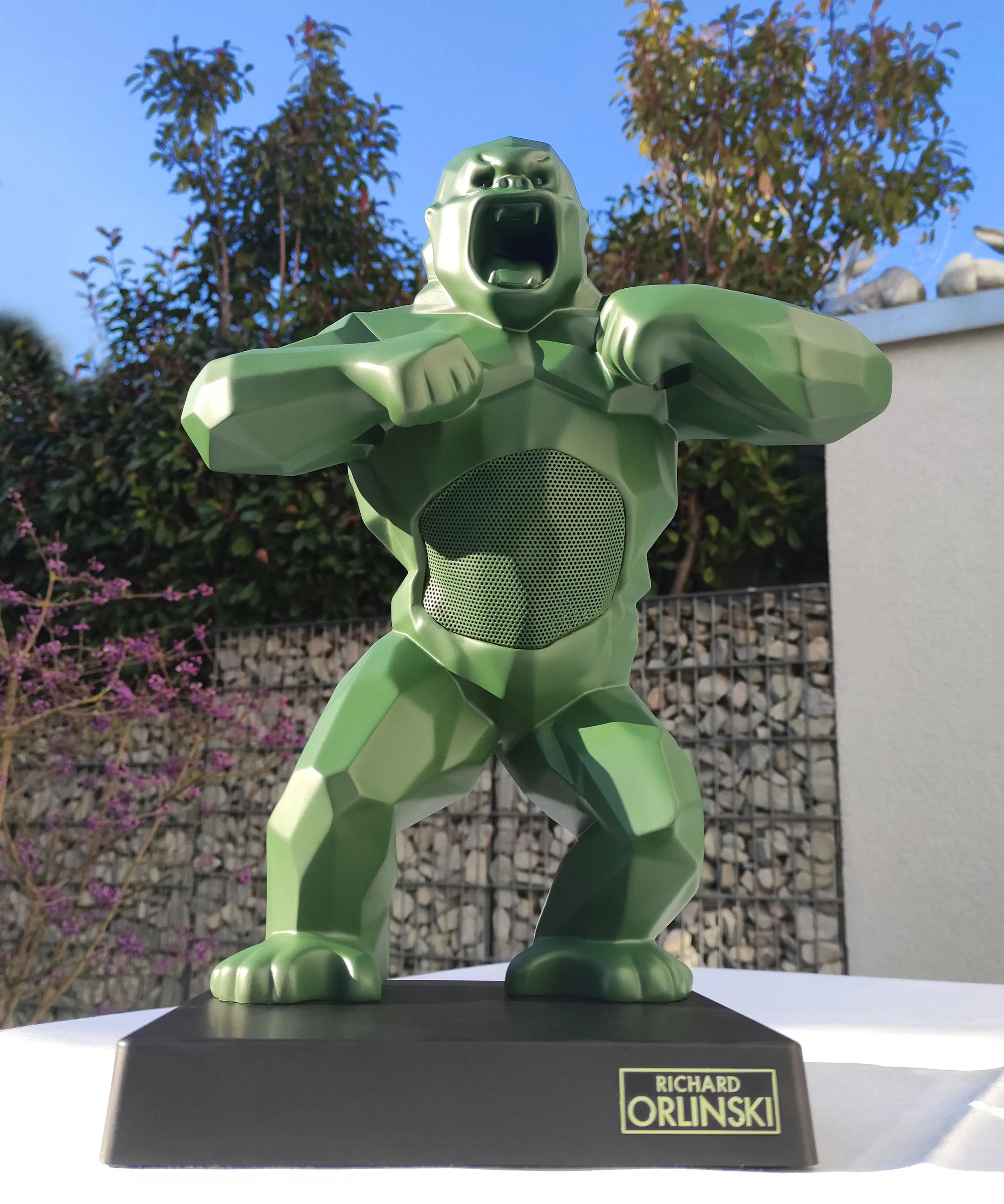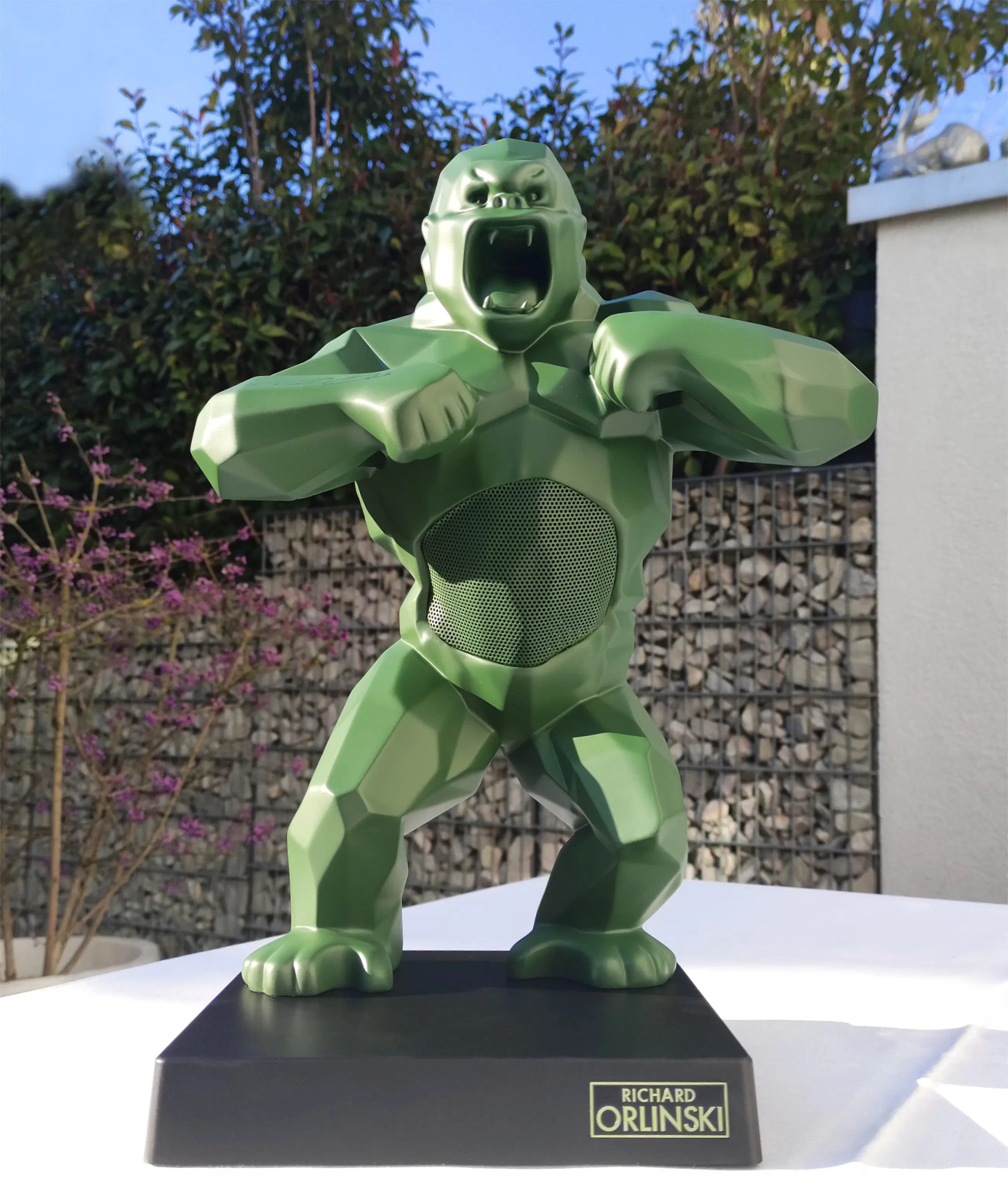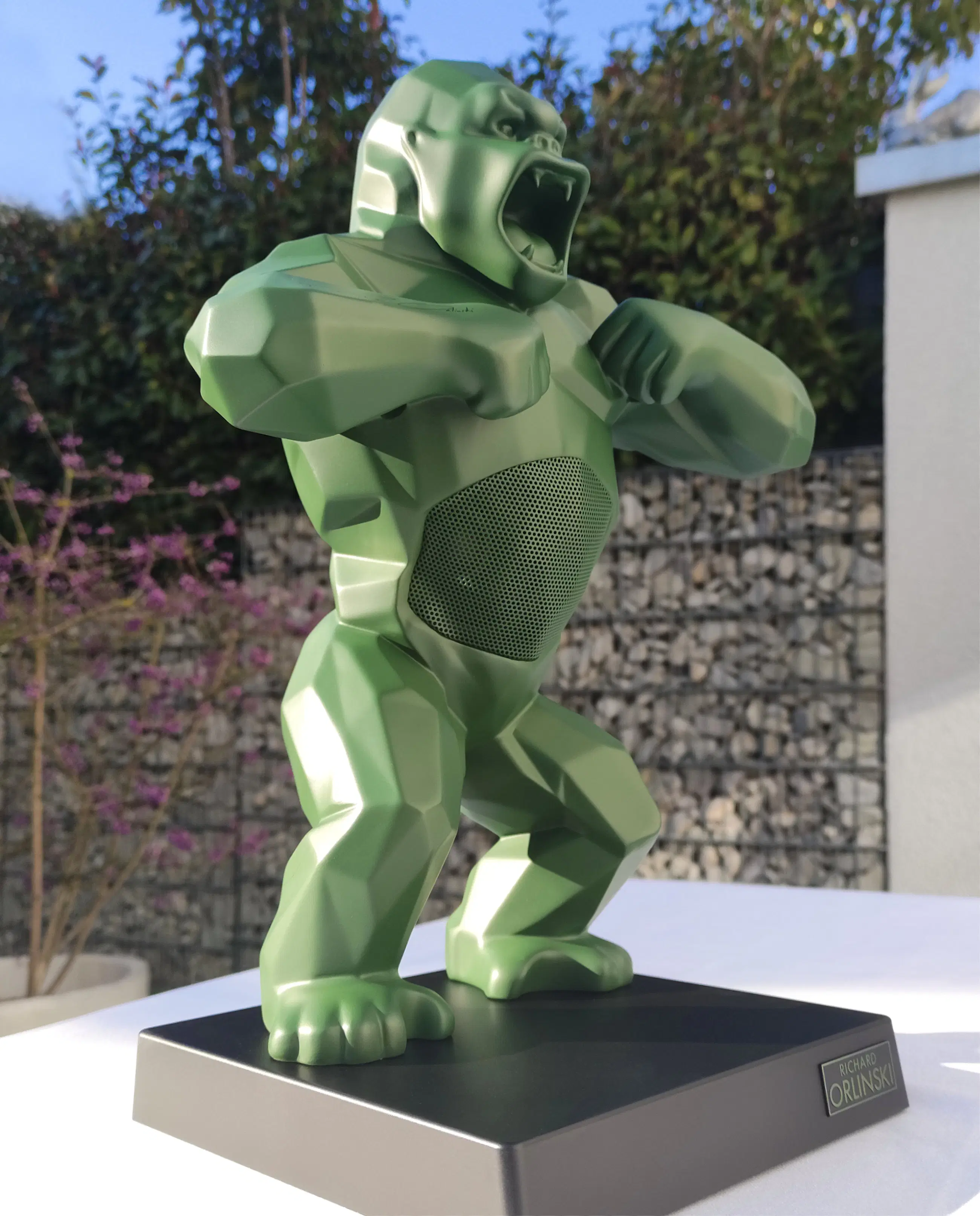 Richard Orlinski's KONG SPEAKER (Kaki Mat) is een hybride sculptuur en Bluetooth-luidspreker, plus een trolley.