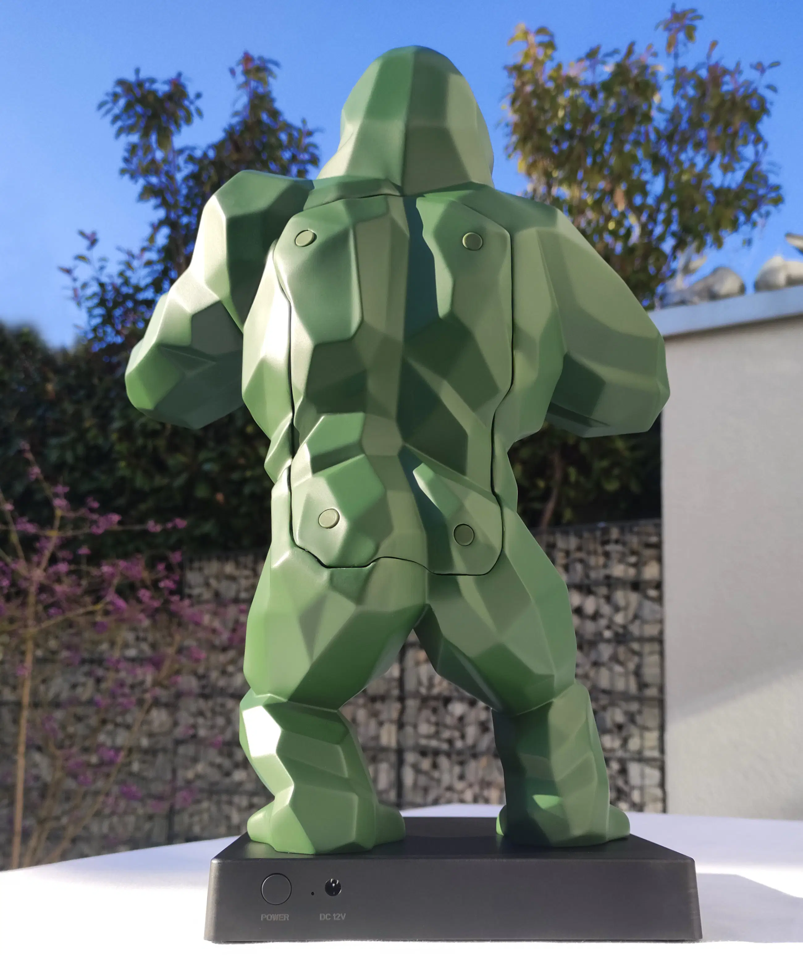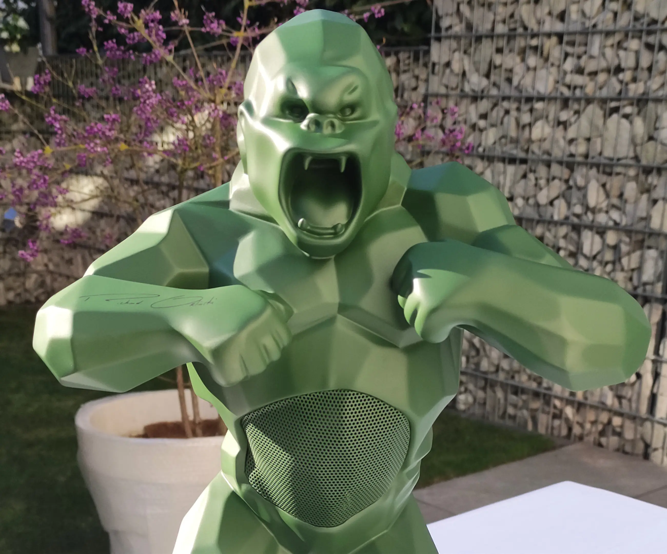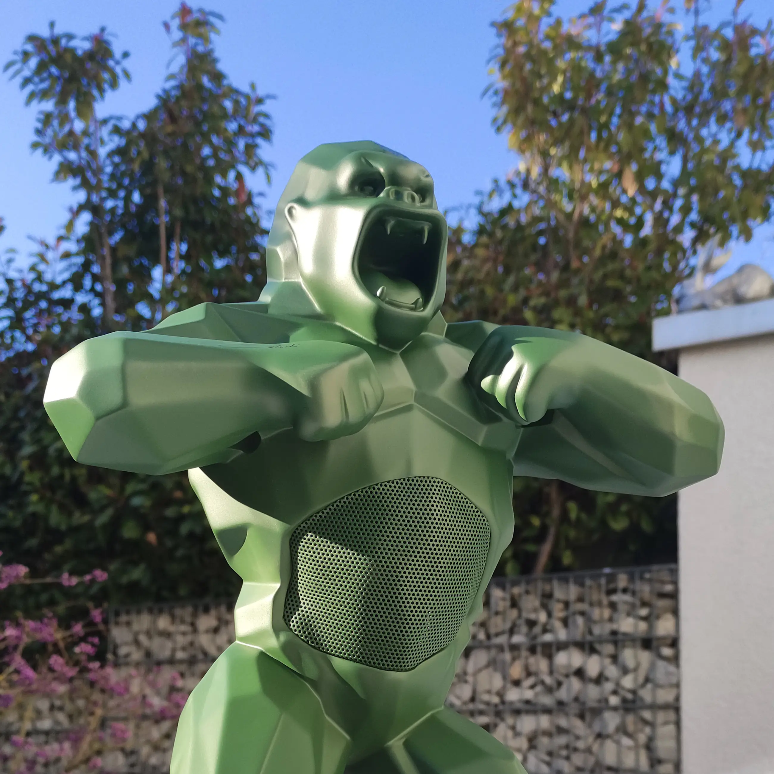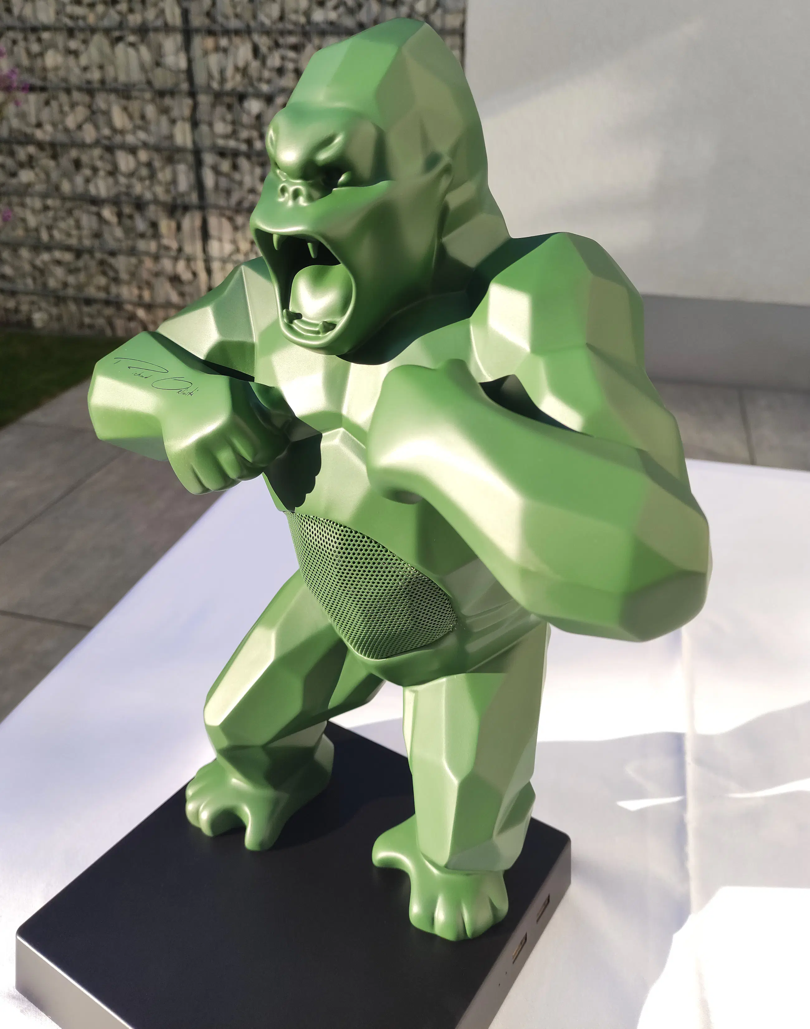 Richard Orlinski's KONG SPEAKER (Kaki Mat) is een hybride sculptuur en Bluetooth-luidspreker, plus een trolley.