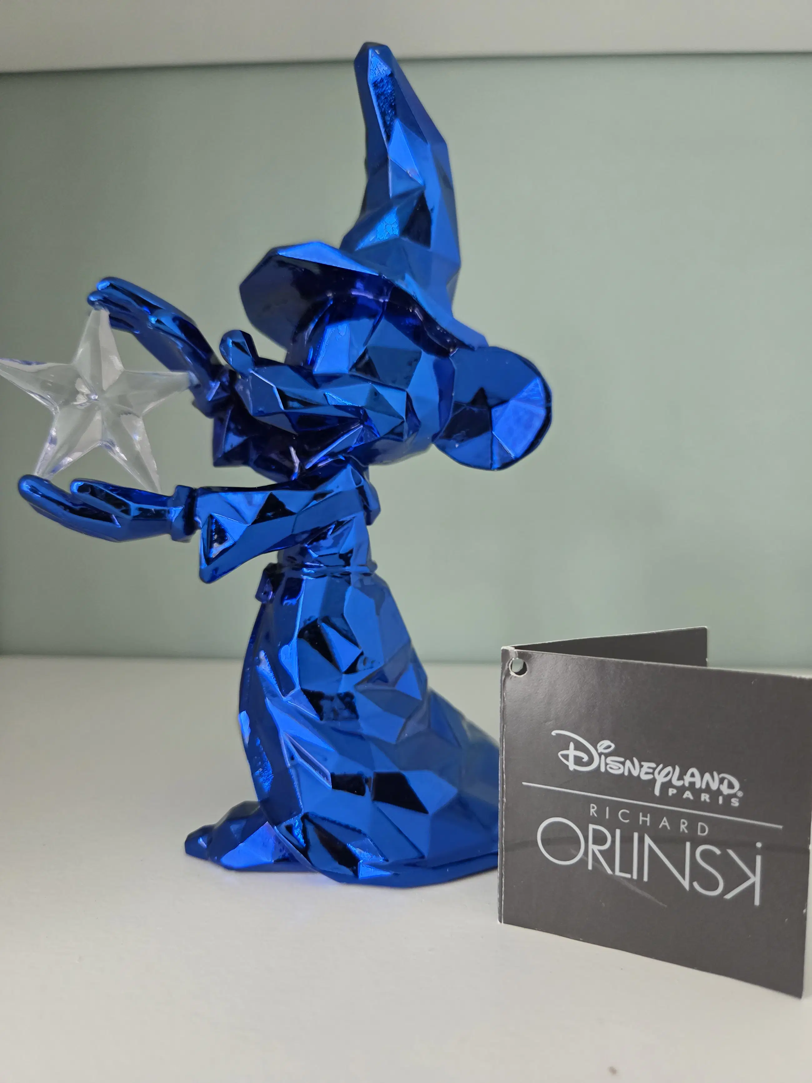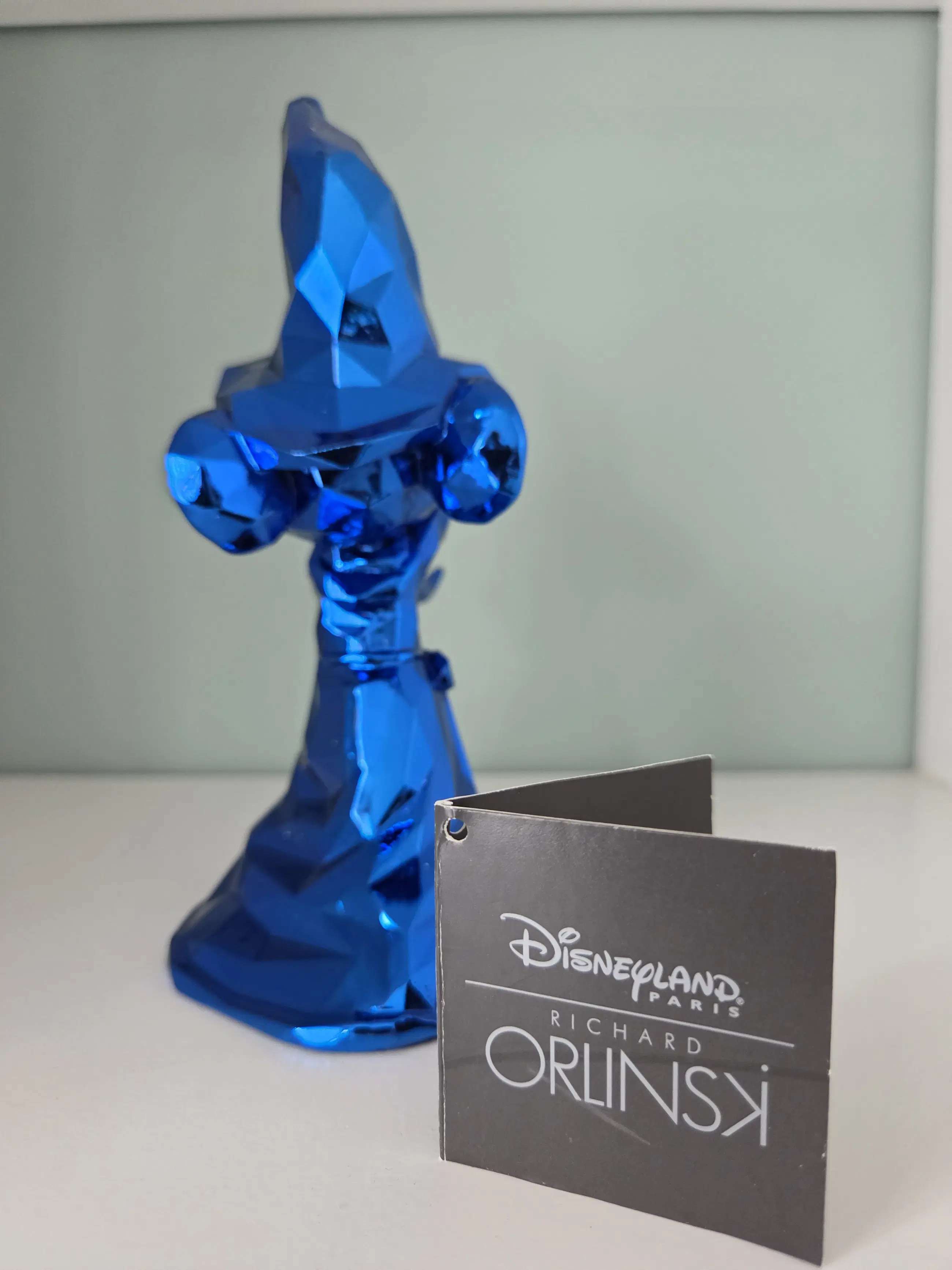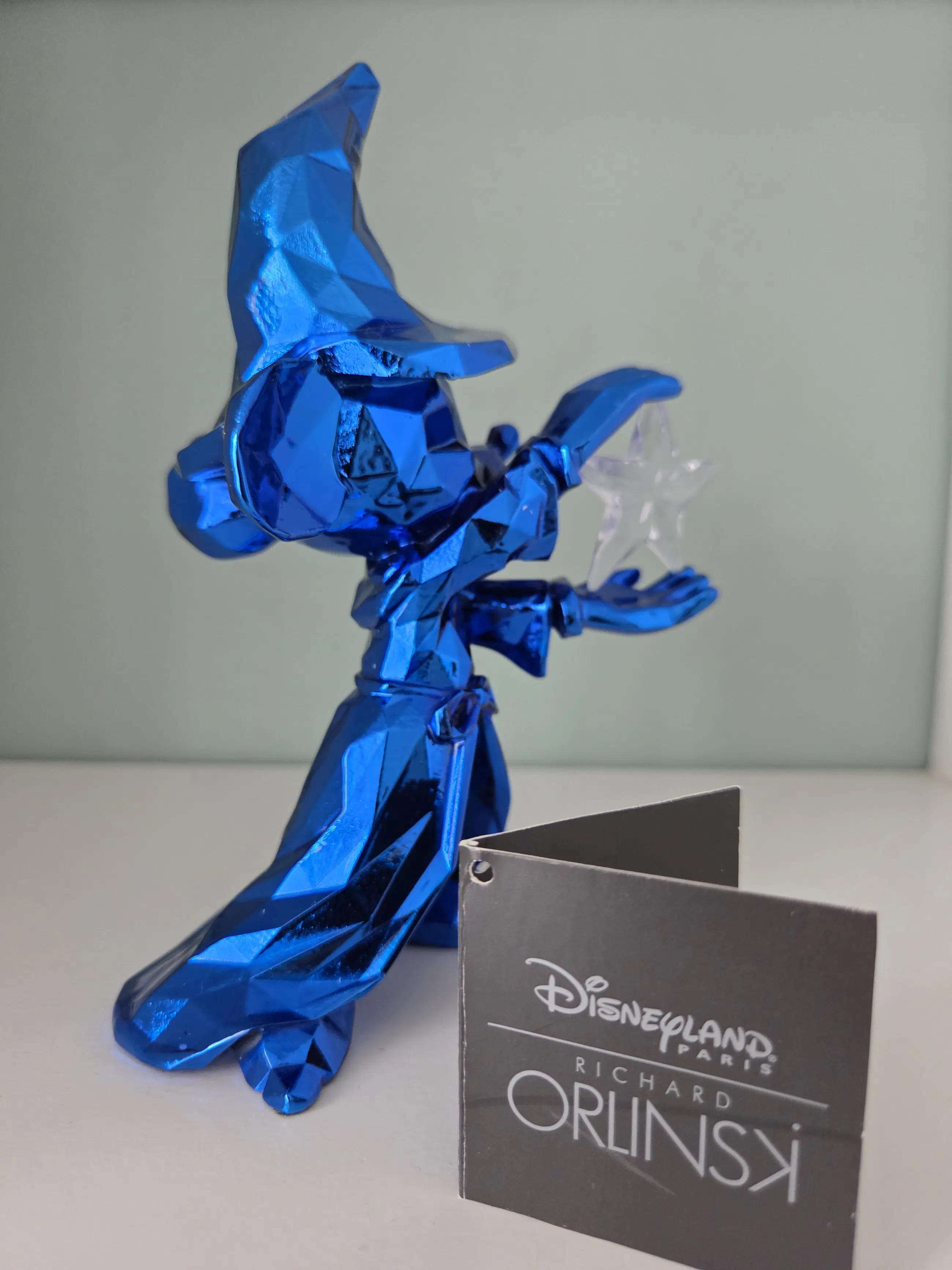 Dit verzamelobject is een gelimiteerd Mickey Mouse beeldje als "De Tovenaarsleerling", ontworpen door de Franse kunstenaar Richard Orlinski in samenwerking met Disneyland Paris. Inclusief bijbehorende Disney label. Materiaal: Glanzende blauwe hars (resin). Afmetingen: Ongeveer 17 cm hoog. Design: Facetgeslepen, moderne pop-art stijl. Op één vinger zit een lichte beschadiging, zie foto. Wordt verpakt in piepschuim en wit doosje.
